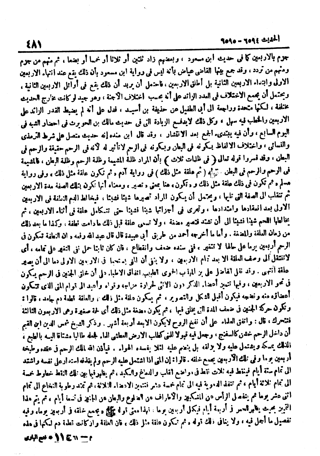 جزم بالاربعين كَمَا فِي حَدِيث بن مَسْعُودٍ وَبَعْضُهُمْ زَادَ ثِنْتَيْنِ أَوْ ثَلَاثًا أَوْ خَمْسًا أَوْ بِضْعًا ثُمَّ مِنْهُمْ مَنْ جَزَمَ وَمِنْهُمْ مَنْ تَرَدَّدَ وَقَدْ جَمَعَ بَيْنَهَا الْقَاضِي عِيَاض بِأَنَّهُ لَيْسَ فِي رِوَايَة بن مَسْعُودٍ بِأَنَّ ذَلِكَ يَقَعُ عِنْدَ انْتِهَاءِ الْأَرْبَعِينَ الْأُولَى وَابْتِدَاءِ الْأَرْبَعِينَ الثَّانِيَةِ بَلْ أَطْلَقَ الْأَرْبَعِينَ فَاحْتَمَلَ أَنْ يُرِيدَ أَنَّ ذَلِكَ يَقَعُ فِي أَوَائِلِ الْأَرْبَعِينَ الثَّانِيَةِ وَيَحْتَمِلُ أَنْ يُجْمَعَ الِاخْتِلَافُ فِي الْعَدَدِ الزَّائِدِ عَلَى أَنَّهُ بِحَسَبِ اخْتِلَافِ الْأَجِنَّةِ وَهُوَ جَيِّدٌ لَوْ كَانَتْ مَخَارِجُ الْحَدِيثِ مُخْتَلِفَةً لَكِنَّهَا مُتَّحِدَةٌ وَرَاجِعَةٌ إِلَى أَبِي الطُّفَيْلِ عَنْ حُذَيْفَةَ بْنِ أَسِيدٍ فَدَلَّ عَلَى أَنَّهُ لَمْ يَضْبِطِ الْقَدْرَ الزَّائِدَ عَلَى الْأَرْبَعِينَ وَالْخَطْبُ فِيهِ سَهْلٌ وَكُلُّ ذَلِكَ لَا يَدْفَعُ الزِّيَادَةَ الَّتِي فِي حَدِيثِ مَالِكِ بْنِ الْحُوَيْرِثِ فِي إِحْضَارِ الشَّبَهِ فِي الْيَوْمِ السَّابِعِ وَأَنَّ فِيهِ يَبْتَدِئ الْجمع بعد الانتشار وَقد قَالَ بن مَنْدَهْ إِنَّهُ حَدِيثٌ مُتَّصِلٌ عَلَى شَرْطِ التِّرْمِذِيِّ وَالنَّسَائِيِّ وَاخْتِلَافُ الْأَلْفَاظِ بِكَوْنِهِ فِي الْبَطْنِ وَبِكَوْنِهِ فِي الرَّحِمِ لَا تَأْثِيرَ لَهُ لِأَنَّهُ فِي الرَّحِمِ حَقِيقَةً وَالرَّحِمُ فِي الْبَطْنِ وَقَدْ فَسَّرُوا قَوْله تَعَالَى فِي ظلمات ثَلَاث بِأَنَّ الْمُرَادَ ظُلْمَةُ الْمَشِيمَةِ وَظُلْمَةُ الرَّحِمِ وَظُلْمَةُ الْبَطْنِ فَالْمَشِيمَةُ فِي الرَّحِمِ وَالرَّحِمُ فِي الْبَطْنِ قَوْلُهُ ثُمَّ عَلَقَةً مِثْلُ ذَلِكَ فِي رِوَايَةِ آدَمَ ثُمَّ تَكُونُ عَلَقَةً مِثْلُ ذَلِكَ وَفِي رِوَايَةِ مُسْلِمٍ ثُمَّ تَكُونُ فِي ذَلِكَ عَلَقَةً مثل ذَلِك وَتَكون هُنَا بِمَعْنَى تَصِيرُ وَمَعْنَاهُ أَنَّهَا تَكُونُ بِتِلْكَ الصِّفَةِ مُدَّةَ الْأَرْبَعِينَ ثُمَّ تَنْقَلِبُ إِلَى الصِّفَةِ الَّتِي تَلِيهَا وَيَحْتَمِلُ أَنْ يَكُونَ الْمُرَادُ تَصَيُّرَهَا شَيْئًا فَشَيْئًا فَيُخَالِطُ الدَّمُ النُّطْفَةَ فِي الْأَرْبَعِينَ الْأُولَى بَعْدَ انْعِقَادِهَا وَامْتِدَادِهَا وَتَجْرِي فِي أَجْزَائِهَا شَيْئًا فَشَيْئًا حَتَّى تَتَكَامَلَ عَلَقَةً فِي أَثْنَاءِ الْأَرْبَعِينَ ثُمَّ يُخَالِطُهَا اللَّحْمُ شَيْئًا فَشَيْئًا إِلَى أَنْ تَشْتَدَّ فَتَصِيرَ مُضْغَةً وَلَا تُسَمَّى عَلَقَةً قَبْلَ ذَلِكَ مَا دَامَتْ نُطْفَةً وَكَذَا مَا بَعْدَ ذَلِكَ مِنْ زَمَانِ الْعَلَقَةِ وَالْمُضْغَةِ وَأَمَّا مَا أَخْرَجَهُ أَحْمَدُ مِنْ طَرِيقِ أَبِي عُبَيْدةَ قَالَ قَالَ عَبْدُ اللَّهِ رَفَعَهُ إِنَّ النُّطْفَةَ تَكُونُ فِي الرَّحِمِ أَرْبَعِينَ يَوْمًا عَلَى حَالِهَا لَا تَتَغَيَّرُ فَفِي سَنَدِهِ ضَعْفٌ وَانْقِطَاعٌ فَإِنْ كَانَ ثَابِتًا حُمِلَ نَفْيُ التَّغَيُّرِ عَلَى تَمَامِهِ أَيْ لَا تَنْتَقِلُ إِلَى وَصْفِ الْعَلَقَةِ إِلَّا بَعْدَ تَمَامِ الْأَرْبَعِينَ وَلَا يَنْفِي أَنَّ الْمَنِيَّ يَسْتَحِيلُ فِي الْأَرْبَعِينَ الْأُولَى دَمًا إِلَى أَنْ يَصِيرَ عَلَقَةً انْتَهَى وَقَدْ نَقَلَ الْفَاضِلُ عَلِيُّ بْنُ الْمُهَذَّبِ الْحَمَوِيُّ الطَّبِيبُ اتِّفَاقَ الْأَطِبَّاءِ عَلَى أَنَّ خَلْقَ الْجَنِينِ فِي الرَّحِمِ يَكُونُ فِي نَحْوِ الْأَرْبَعِينَ وَفِيهَا تَتَمَيَّزُ أَعْضَاءُ الذَّكَرِ دُونَ الْأُنْثَى لِحَرَارَةِ مِزَاجِهِ وَقُوَاهُ وَأَعْبَدُ إِلَى قِوَامِ الْمَنِيِّ الَّذِي تَتَكَوَّنُ أَعْضَاؤُهُ مِنْهُ وَنُضْجُهُ فَيَكُونُ أَقْبَلَ لِلشَّكْلِ وَالتَّصْوِيرِ ثُمَّ يَكُونُ عَلَقَةً مِثْلُ ذَلِكَ وَالْعَلَق