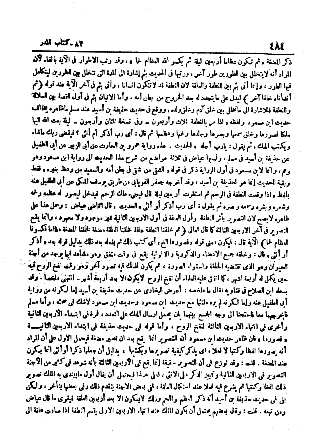ذِكْرِ الْمُضْغَةِ ثُمَّ تَكُونُ عِظَامًا أَرْبَعِينَ لَيْلَةً ثُمَّ يَكْسُو اللَّهُ الْعِظَامَ لَحْمًا وَقَدْ رَتَّبَ الْأَطْوَارَ فِي الْآيَةِ بِالْفَاءِ لِأَنَّ الْمُرَادَ أَنَّهُ لَا يَتَخَلَّلُ بَيْنَ الطَّوْرَيْنِ طَوْرٌ آخَرُ وَرَتَّبَهَا فِي الحَدِيث بثم إِشَارَةً إِلَى الْمُدَّةِ الَّتِي تَتَخَلَّلُ بَيْنَ الطَّوْرَيْنِ ليتكامل فِيهَا الطّور وانما اتى بثم بَيْنَ النُّطْفَةِ وَالْعَلَقَةِ لِأَنَّ النُّطْفَةَ قَدْ لَا تتكون انسانا واتى بثم فِي آخِرِ الْآيَةِ عِنْدَ قَوْلِهِ ثُمَّ أَنْشَأْنَاهُ خلقا اخر لِيَدُلَّ عَلَى مَا يَتَجَدَّدُ لَهُ بَعْدَ الْخُرُوجِ من بطن أمه وَأما الْإِتْيَان بثم فِي أَوَّلِ الْقِصَّةِ بَيْنَ السُّلَالَةِ وَالنُّطْفَةِ فَلِلْإِشَارَةِ إِلَى مَا تَخَلَّلَ بَيْنَ خَلْقِ آدَمَ وَخَلْقِ وَلَده وَوَقع فِي حَدِيثُ حُذَيْفَةَ بْنِ أَسِيدٍ عِنْدَ مُسْلِمٍ مَا ظَاهره يُخَالف حَدِيث بن مَسْعُودٍ وَلَفْظُهُ إِذَا مَرَّ بِالنُّطْفَةِ ثَلَاثٌ وَأَرْبَعُونَ وَفِي نُسْخَة اثْنَتَانِ وَأَرْبَعُونَ لَيْلَةً بَعَثَ اللَّهُ إِلَيْهَا مَلَكًا فَصَوَّرَهَا وَخَلَقَ سَمْعَهَا وَبَصَرَهَا وَجِلْدَهَا وَلَحْمَهَا وَعَظْمَهَا ثُمَّ قَالَ أَيْ رَبِّ أَذَكَرٌ أَمْ أُنْثَى فَيَقْضِي رَبُّكَ مَا شَاءَ وَيَكْتُبُ الْمَلَكُ ثُمَّ يَقُولُ يَا رَبِّ أَجَلُهُ الْحَدِيثَ هَذِهِ رِوَايَةُ عَمْرِو بْنِ الْحَارِثِ عَنْ أَبِي الزُّبَيْرِ عَنْ أَبِي الطُّفَيْلِ عَنْ حُذَيْفَةَ بْنِ أَسِيدٍ فِي مُسْلِمٍ وَنَسَبَهَا عِيَاضٌ فِي ثَلَاثَةِ مَوَاضِعَ مِنْ شَرْحِ هَذَا الحَدِيث إِلَى رِوَايَة بن مَسْعُودٍ وَهُوَ وَهْمٌ وَإِنَّمَا لِابْنِ مَسْعُودٍ فِي أَوَّلِ الرِّوَايَةِ ذِكْرٌ فِي قَوْلِهِ الشَّقِيُّ مَنْ شَقِيَ فِي بَطْنِ أُمِّهِ وَالسَّعِيدُ مَنْ وُعِظَ بِغَيْرِهِ فَقَطْ وَبَقِيَّةُ الْحَدِيثِ إِنَّمَا هُوَ لِحُذَيْفَةَ بْنِ أَسِيدٍ وَقَدْ أَخْرَجَهُ جَعْفَرٌ الْفِرْيَابِيُّ مِنْ طَرِيقِ يُوسُفَ الْمَكِّيِّ عَنْ أَبِي الطُّفَيْلِ عَنْهُ بِلَفْظِ إِذَا وَقَعَتِ النُّطْفَةُ فِي الرَّحِمِ ثُمَّ اسْتَقَرَّتْ أَرْبَعِينَ لَيْلَةً قَالَ فَيَجِيءُ مَلَكُ الرَّحِمِ فَيَدْخُلُ فَيُصَوِّرُ لَهُ عَظْمَهُ وَلَحْمَهُ وَشَعْرَهُ وَبَشَرَهُ وَسَمْعَهُ وَبَصَرَهُ ثُمَّ يَقُولُ أَيْ رَبِّ أَذَكَرٌ أَوْ أُنْثَى الْحَدِيثَ قَالَ الْقَاضِي عِيَاضٌ وَحَمْلُ هَذَا عَلَى ظَاهِرِهِ لَا يَصِحُّ لِأَنَّ التَّصْوِيرَ بِأَثَرِ النُّطْفَةِ وَأَوَّلِ الْعَلَقَةِ فِي أَوَّلِ الْأَرْبَعِينَ الثَّانِيَةِ غَيْرُ مَوْجُودٍ وَلَا مَعْهُودٍ وَإِنَّمَا يَقَعُ التَّصْوِيرُ فِي آخِرِ الْأَرْبَعِينَ الثَّالِثَةِ كَمَا قَالَ تَعَالَى ثُمَّ خَلَقْنَا النُّطْفَةَ عَلَقَةً فَخَلَقْنَا الْعَلَقَةَ مُضْغَةً فَخَلَقْنَا الْمُضْغَةَ عِظَامًا فَكَسَوْنَا الْعِظَامَ لَحْمًا الْآيَةَ قَالَ فَيَكُونُ مَعْنَى قَوْلِهِ فَصَوَّرَهَا إِلَخْ أَيْ كَتَبَ ذَلِكَ ثُمَّ يَفْعَلُهُ بَعْدَ ذَلِكَ بِدَلِيلِ قَوْلِهِ بَعْدَ أَذَكَرٌ أَوْ أُنْثَى قَالَ وَخَلْقُهُ جَمِيعَ الْأَعْضَاءِ وَالذُّكُورِيَّةَ وَالْأُنُوثِيَّةَ يَقَعُ فِي وَقْتٍ مُتَّفَقٍ وَهُوَ مُشَاهَدٌ فِيمَا يُوجَدُ مِنْ أَجِنَّةِ الْحَيَوَانِ وَهُوَ الَّذِي تَقْتَضِيهِ الْخِلْقَةُ وَاسْتِوَاءُ الصُّورَةِ ثُمَّ يَكُونُ لِلْمَلَكِ فِيهِ تَصَوُّرٌ آخَرُ وَهُوَ وَقْتُ نَفْخِ الرُّوحِ فِيهِ حِينَ يَكْمُلُ لَهُ أَرْبَعَةُ أَشْهُرٍ كَمَا اتَّفَقَ عَلَيْهِ الْعُلَمَاءُ أَنَّ نَفْخَ الرُّوحِ لَا يَكُونُ إِلَّا بَعْدَ أَرْبَعَة اشهر انْتهى مُلَخصا وَقد بَسطه بن الصَّلَاحِ فِي فَتَاوِيهِ فَقَالَ مَا مُلَخَّصُهُ أَعْرَضَ الْبُخَارِيُّ عَنْ حَدِيثِ حُذَيْفَة