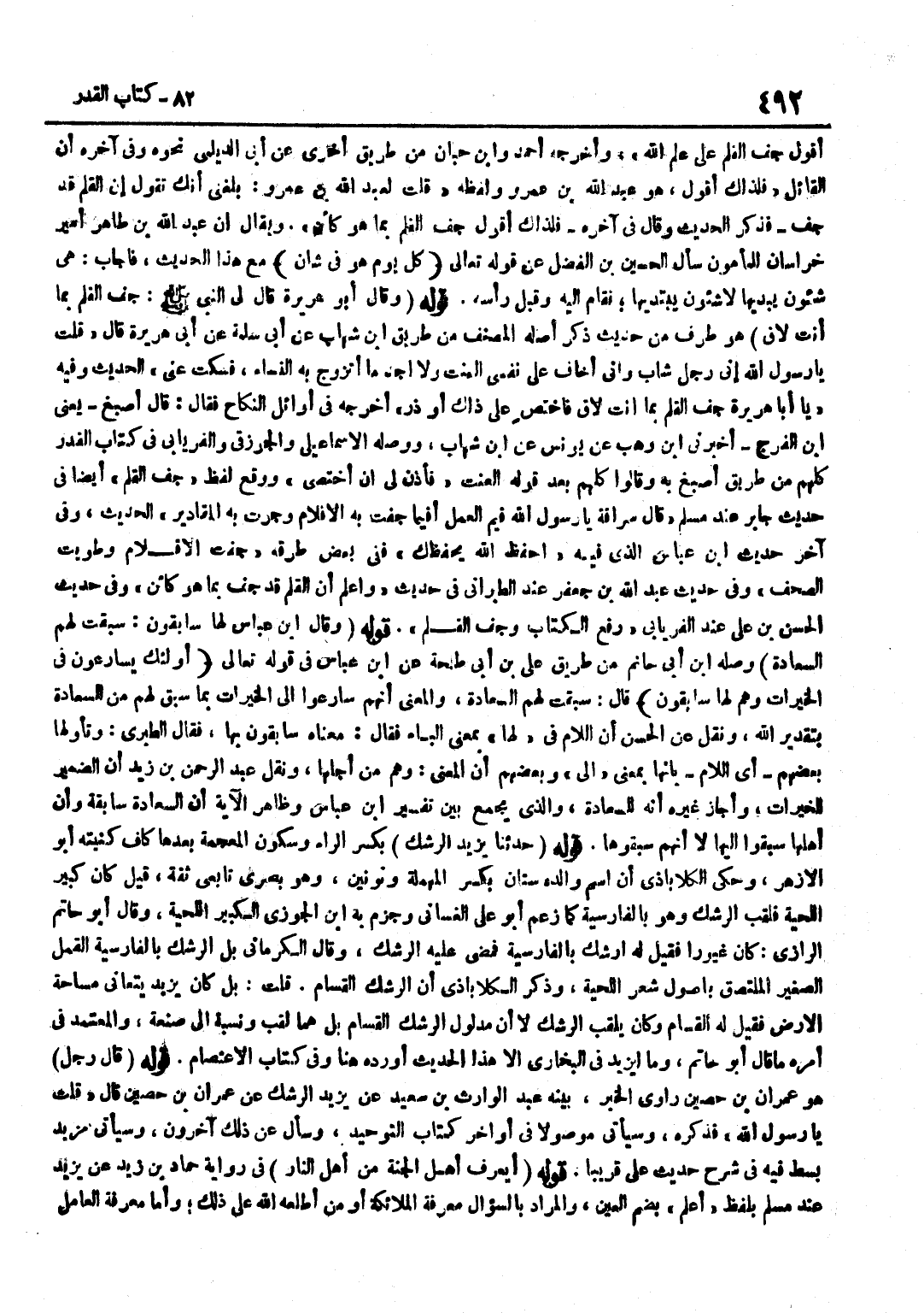 أَقُولُ جَفَّ الْقَلَمُ عَلَى عِلْمِ اللَّهِ وَأَخْرَجَهُ احْمَد وبن حِبَّانَ مِنْ طَرِيقٍ أُخْرَى عَنْ أَبِي الدَّيْلَمِيِّ نَحْوَهُ وَفِي آخِرِهِ أَنَّ الْقَائِلَ فَلِذَلِكَ أَقُولُ هُوَ عَبْدُ اللَّهِ بْنُ عَمْرٍو وَلَفْظُهُ قُلْتُ لِعَبْدِ اللَّهِ بْنِ عَمْرٍو بَلَغَنِي أَنَّكَ تَقُولُ إِنَّ الْقَلَمَ قَدْ جَفَّ فَذَكَرَ الْحَدِيثَ وَقَالَ فِي آخِرِهِ فَلِذَلِكَ أَقُولُ جَفَّ الْقَلَمُ بِمَا هُوَ كَائِنٌ وَيُقَالُ إِنَّ عَبْدَ اللَّهِ بْنَ طَاهِرٍ أَمِيرَ خُرَاسَانَ لِلْمَأْمُونِ سَأَلَ الْحُسَيْنَ بْنَ الْفَضْلِ عَنْ قَوْلِهِ تَعَالَى كُلَّ يَوْمٍ هُوَ فِي شَأْنٍ مَعَ هَذَا الحَدِيث فَأجَاب هِيَ شؤون يبديها لَا شؤون يَبْتَدِيهَا فَقَامَ إِلَيْهِ وَقَبَّلَ رَأْسَهُ قَوْلُهُ وَقَالَ أَبُو هُرَيْرَةَ قَالَ لِيَ النَّبِيُّ صَلَّى اللَّهُ عَلَيْهِ وَسَلَّمَ جَفَّ الْقَلَمُ بِمَا أَنْتَ لَاقٍ هُوَ طَرَفٌ مِنْ حَدِيثٍ ذَكَرَ أَصْلَهُ الْمُصَنِّفُ من طَرِيق بن شِهَابٍ عَنْ أَبِي سَلَمَةَ عَنْ أَبِي هُرَيْرَةَ قَالَ قُلْتُ يَا رَسُولَ اللَّهِ إِنِّي رَجُلٌ شَابٌّ وَإِنِّي أَخَافُ عَلَى نَفْسِي الْعَنَتَ وَلَا أَجِدُ مَا أَتَزَوَّجُ بِهِ النِّسَاءَ فَسَكَتَ عَنِّي الْحَدِيثَ وَفِيهِ يَا أَبَا هُرَيْرَةَ جَفَّ الْقَلَمُ بِمَا أَنْتَ لَاقٍ فَاخْتَصِ عَلَى ذَلِكَ أَوْ ذَرْ أَخْرَجَهُ فِي أَوَائِلِ النِّكَاحِ فَقَالَ قَالَ اصبغ يَعْنِي بن الْفرج أَخْبرنِي بن وهب عَن يُونُس عَن بن شِهَابٍ وَوَصَلَهُ الْإِسْمَاعِيلِيُّ وَالْجَوْزَقِيُّ وَالْفِرْيَابِيُّ فِي كِتَابِ الْقَدَرِ كُلُّهُمْ مِنْ طَرِيقِ أَصْبَغٍ بِهِ وَقَالُوا كُلُّهُمْ بَعْدَ قَوْلِهِ الْعَنَتَ فَأَذِنَ لِي أَنْ أَخْتَصِيَ وَوَقَعَ لَفْظُ جَفَّ الْقَلَمُ أَيْضًا فِي حَدِيثِ جَابِرٍ عِنْدَ مُسْلِمٍ قَالَ سُرَاقَةُ يَا رَسُولَ اللَّهِ فِيمَ الْعَمَلُ أَفِيمَا جَفَّتْ بِهِ الْأَقْلَامُ وَجَرَتْ بِهِ الْمَقَادِيرُ الْحَدِيثَ وَفِي آخَرِ حَدِيث بن عَبَّاسٍ الَّذِي فِيهِ احْفَظِ اللَّهَ يَحْفَظْكَ فَفِي بَعْضِ طُرُقِهِ جَفَّتِ الْأَقْلَامُ وَطُوِيَتِ الصُّحُفُ وَفِي حَدِيثِ عَبْدِ اللَّهِ بْنِ جَعْفَرٍ عِنْدَ الطَّبَرَانِيِّ فِي حَدِيثِ وَاعْلَمْ أَنَّ الْقَلَمَ قَدْ جَفَّ بِمَا هُوَ كَائِنٌ وَفِي حَدِيثِ الْحَسَنِ بْنِ عَلَيٍّ عِنْدَ الْفِرْيَابِيِّ رُفِعَ الْكِتَابُ وَجَفَّ الْقَلَمُ قَوْله وَقَالَ بن عَبَّاسٍ لَهَا سَابِقُونَ سَبَقَتْ لَهُمُ السَّعَادَةُ وَصَلَهُ بن أَبِي حَاتِمٍ مِنْ طَرِيقِ عَلِيِّ بْنِ أَبِي طَلْحَةَ عَنِ بْنِ عَبَّاسٍ فِي قَوْلِهِ تَعَالَى أُولَئِكَ يُسَارِعُونَ فِي الْخيرَات وهم لَهَا سَابِقُونَ قَالَ سَبَقَتْ لَهُمُ السَّعَادَةُ وَالْمَعْنَى أَنَّهُمْ سَارَعُوا إِلَى الْخَيْرَاتِ بِمَا سَبَقَ لَهُمْ مِنَ السَّعَادَةِ بِتَقْدِيرِ اللَّهِ وَنُقِلَ عَنِ الْحَسَنِ أَنَّ اللَّامَ فِي لَهَا بِمَعْنَى الْبَاءِ فَقَالَ مَعْنَاهُ سَابِقُونَ بِهَا فَقَالَ الطَّبَرَانِيُّ وَتَأَوَّلَهَا بَعْضُهُمْ أَيِ اللَّامَ بِأَنَّهَا بِمَعْنَى إِلَى وَبَعْضُهُمْ أَنَّ الْمَعْنَى وَهُمْ مِنْ أَجْلِهَا وَنَقَلَ عَبْدُ الرَّحْمَنِ بْنُ زَيْدٍ ان الضَّمِير لِلْخَيْرَاتِ وَأَجَازَ غَيره ان للسعادة وَالَّذِي يجمع بَين تَفْسِير بن عَبَّاسٍ وَظَاهِرِ الْآيَةِ أَنَّ السَّعَادَةَ سَابِقَةٌ وَأَنَّ أَهْلَهَا سَبَقُوا إِلَيْهَا لَا أَنَّهُمْ سَبَقُوهَا