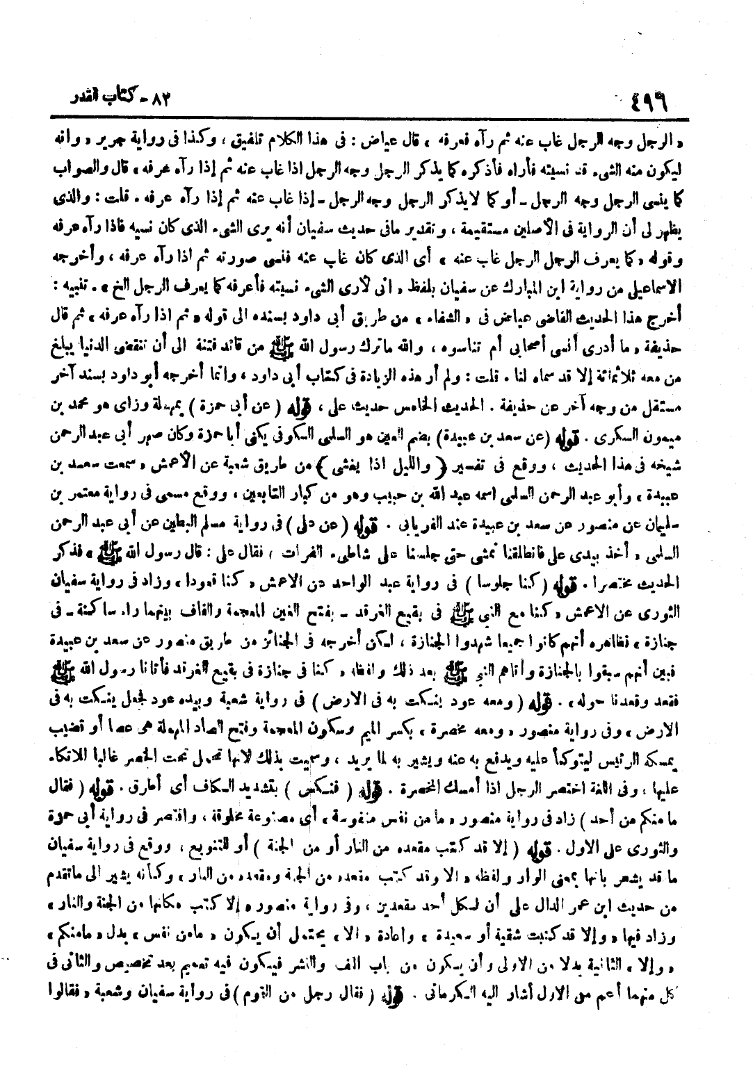 الرَّجُلُ وَجْهَ الرَّجُلِ غَابَ عَنْهُ ثُمَّ رَآهُ فَعَرَفَهُ قَالَ عِيَاضٌ فِي هَذَا الْكَلَامِ تَلْفِيقٌ وَكَذَا فِي رِوَايَةِ جَرِيرٍ وَأَنَّهُ لَيَكُونُ مِنْهُ الشَّيْءُ قَدْ نَسِيتُهُ فَأَرَاهُ فَأَذْكُرُهُ كَمَا يَذْكُرُ الرَّجُلُ وَجْهَ الرَّجُلِ إِذَا غَابَ عَنْهُ ثُمَّ إِذَا رَآهُ عَرَفَهُ قَالَ وَالصَّوَابُ كَمَا يَنْسَى الرَّجُلُ وَجْهَ الرَّجُلِ أَوْ كَمَا لَا يَذْكُرُ الرَّجُلُ وَجْهَ الرَّجُلِ إِذَا غَابَ عَنْهُ ثُمَّ إِذَا رَآهُ عَرَفَهُ قُلْتُ وَالَّذِي يَظْهَرُ لِي أَنَّ الرِّوَايَةَ فِي الْأَصْلَيْنِ مُسْتَقِيمَةٌ وَتَقْدِيرُ مَا فِي حَدِيثِ سُفْيَانَ أَنَّهُ يَرَى الشَّيْءَ الَّذِي كَانَ نَسِيَهُ فَإِذَا رَآهُ عَرَفَهُ وَقَوْلُهُ كَمَا يَعْرِفُ الرَّجُلُ الرَّجُلَ غَابَ عَنْهُ أَيِ الَّذِي كَانَ غَابَ عَنْهُ فَنَسِيَ صُورَتَهُ ثُمَّ إِذَا رَآهُ عرفه وَأخرجه الْإِسْمَاعِيلِيّ من رِوَايَة بن الْمُبَارَكِ عَنْ سُفْيَانَ بِلَفْظِ إِنِّي لَأَرَى الشَّيْءَ نَسِيتُهُ فَأَعْرِفُهُ كَمَا يَعْرِفُ الرَّجُلُ إِلَخْ تَنْبِيهٌ أَخْرَجَ هَذَا الْحَدِيثَ الْقَاضِي عِيَاضٌ فِي الشِّفَاءِ مِنْ طَرِيقِ أَبِي دَاوُدَ بِسَنَدِهِ إِلَى قَوْلِهِ ثُمَّ إِذَا رَآهُ عَرَفَهُ ثُمَّ قَالَ حُذَيْفَةُ مَا أَدْرِي أَنَسِيَ أَصْحَابِي أَمْ تَنَاسَوْهُ وَاللَّهِ مَا تَرَكَ رَسُولِ اللَّهِ صَلَّى اللَّهُ عَلَيْهِ وَسَلَّمَ مِنَ قَائِدِ فِتْنَةٍ إِلَى أَنْ تَنْقَضِيَ الدُّنْيَا يَبْلُغُ مَنْ مَعَهُ ثَلَاثُمِائَةٍ إِلَّا قَدْ سَمَّاهُ لَنَا قُلْتُ وَلَمْ أَرَ هَذِهِ الزِّيَادَةَ فِي كِتَابِ أَبِي دَاوُدَ وَإِنَّمَا أَخْرَجَهُ أَبُو دَاوُدَ بِسَنَدٍ آخَرَ مُسْتَقِلٍّ مِنْ وَجْهٍ آخَرَ عَنْ حُذَيْفَةَ الْحَدِيثُ الْخَامِسُ حَدِيثُ عَلِيٍّ