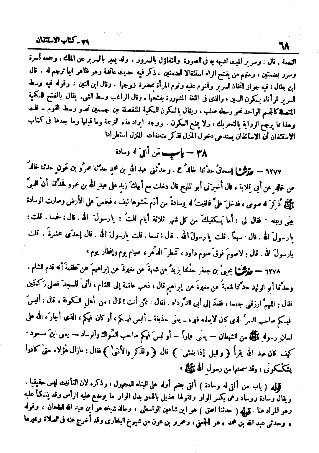 [6276] فِيهِ وَسَطُ السَّرِيرِ قَرَأْنَاهُ بِسُكُونِ السِّينِ وَالَّذِي فِي اللُّغَةِ الْمَشْهُورَةِ بِفَتْحِهَا وَقَالَ الرَّاغِبُ وَسَطُ الشَّيْءِ يُقَالُ بِالْفَتْحِ لِلْكَمِّيَّةِ الْمُتَّصِلَةِ كَالْجِسْمِ الْوَاحِدِ نَحْوَ وَسَطُهُ صُلْبٌ وَيُقَالُ بِالسُّكُونِ لِلْكَمِّيَّةِ الْمُنْفَصِلَةِ بَيْنَ جِسْمَيْنِ نَحْوَ وَسْطَ الْقَوْمِ قُلْتُ وَهَذَا مِمَّا يُرَجِّحُ الرِّوَايَةَ بِالتَّحْرِيكِ وَلَا يُمْنَعُ السُّكُونُ وَوَجْهُ إِيرَادِ هَذِهِ التَّرْجَمَةِ وَمَا قَبْلَهَا وَمَا بَعْدَهَا فِي كِتَابِ الِاسْتِئْذَانِ أَنَّ الِاسْتِئْذَانَ يَسْتَدْعِي دُخُولَ الْمَنْزِلِ فَذَكَرَ مُتَعَلِّقَاتِ الْمَنْزِلِ اسْتِطْرَادًا
