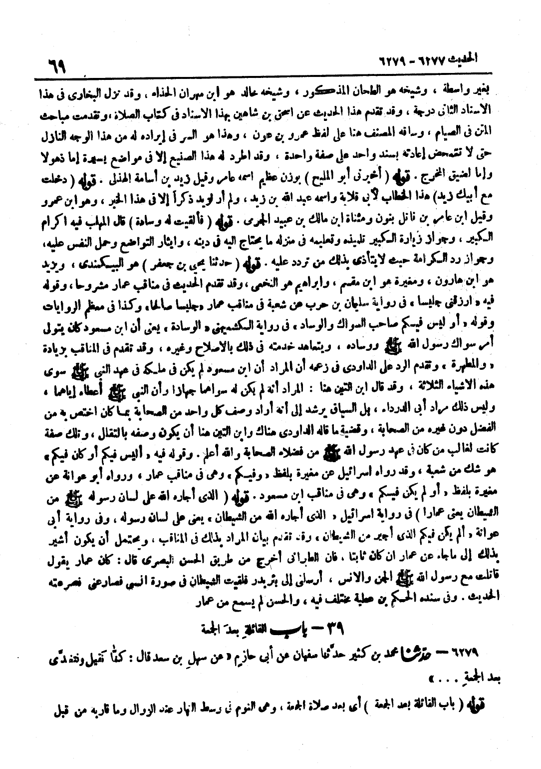 [6278] قَوْلُهُ حَدَّثَنَا يَحْيَى بْنُ جَعْفَرٍ هُوَ البيكندي وَيزِيد هُوَ بن هَارُون ومغيرة هُوَ بن مِقْسَمٍ وَإِبْرَاهِيمُ هُوَ النَّخَعِيُّ وَقَدْ تَقَدَّمَ الْحَدِيثُ فِي مَنَاقِبِ عَمَّارٍ مَشْرُوحًا وَقَوْلُهُ فِيهِ ارْزُقْنِي جَلِيسًا فِي رِوَايَةِ سُلَيْمَانَ بْنِ حَرْبٍ عَنْ شُعْبَةَ فِي مَنَاقِبِ عَمَّارٍ جَلِيسًا صَالِحًا وَكَذَا فِي مُعظم الرِّوَايَات وَقَوله أَو لَيْسَ فِيكُمْ صَاحِبُ السِّوَاكِ وَالْوِسَادِ فِي رِوَايَةِ الْكُشْمِيهَنِيِّ الوسادة يَعْنِي أَن بن مَسْعُودٍ كَانَ يَتَوَلَّى أَمْرَ سِوَاكِ رَسُولِ اللَّهِ صَلَّى اللَّهُ عَلَيْهِ وَسَلَّمَ وَوِسَادِهِ وَيَتَعَاهَدُ خِدْمَتَهُ فِي ذَلِكَ بِالْإِصْلَاحِ وَغَيْرِهِ وَقَدْ تَقَدَّمَ فِي الْمَنَاقِبِ بِزِيَادَةِ وَالْمَطْهَرَةِ وَتَقَدَّمَ الرَّدُّ عَلَى الدَّاوُدِيِّ فِي زَعمه أَن المُرَاد أَن بن مَسْعُودٍ لَمْ يَكُنْ فِي مِلْكِهِ فِي عَهْدِ النَّبِيِّ صَلَّى اللَّهُ عَلَيْهِ وَسَلَّمَ سِوَى هَذِهِ الْأَشْيَاء الثَّلَاثَة وَقد قَالَ بن التِّينِ هُنَا الْمُرَادُ أَنَّهُ لَمْ يَكُنْ لَهُ سِوَاهُمَا جِهَازًا وَأَنَّ النَّبِيَّ صَلَّى اللَّهُ عَلَيْهِ وَسَلَّمَ أَعْطَاهُ إِيَّاهُمَا وَلَيْسَ ذَلِكَ مُرَادَ أَبِي الدَّرْدَاءِ بَلِ السِّيَاقُ يُرْشِدُ إِلَى أَنَّهُ أَرَادَ وَصْفَ كُلِّ وَاحِدٍ مِنَ الصَّحَابَةِ بِمَا كَانَ اخْتَصَّ بِهِ مِنَ الْفَضْلِ دُونَ غَيْرِهِ مِنَ الصَّحَابَة وَقَضِيَّة مَا قَالَه الدَّاودِيّ هُنَاكَ وبن التِّينِ هُنَا أَنْ يَكُونَ وَصَفَهُ بِالتَّقَلُّلِ وَتِلْكَ صِفَةٌ كَانَتْ لِغَالِبِ مَنْ كَانَ فِي عَهْدِ رَسُولِ اللَّهِ صَلَّى اللَّهُ عَلَيْهِ وَسَلَّمَ من فُضَلَاءِ الصَّحَابَةِ وَاللَّهُ أَعْلَمُ وَقَوْلُهُ فِيهِ أَلَيْسَ فِيكُمْ أَوْ كَانَ فِيكُمْ هُوَ شَكٌّ مِنْ شُعْبَةَ وَقَدْ رَوَاهُ إِسْرَائِيلُ عَنْ مُغِيرَةَ بِلَفْظِ وَفِيكُمْ وَهِيَ فِي مَنَاقِبِ عَمَّارٍ وَرَوَاهُ أَبُو عوَانَة عَن مُغيرَة بِلَفْظ أولم يكن فِيكُم وَهِي فِي مَنَاقِب بن مَسْعُودٍ قَوْلُهُ الَّذِي أَجَارَهُ اللَّهُ عَلَى لِسَانِ رَسُولِهِ صَلَّى اللَّهُ عَلَيْهِ وَسَلَّمَ مِنَ الشَّيْطَانِ يَعْنِي عَمَّارًا فِي رِوَايَةِ إِسْرَائِيلَ الَّذِي أَجَارَهُ اللَّهُ مِنَ الشَّيْطَانِ يَعْنِي عَلَى لِسَانِ رَسُولِهِ وَفِي رِوَايَةِ أَبِي عَوَانَةَ أَلَمْ يَكُنْ فِيكُمُ الَّذِي أُجِيرَ مِنَ الشَّيْطَانِ وَقَدْ تَقَدَّمَ بَيَانُ الْمُرَادُ بِذَلِكَ فِي الْمَنَاقِبِ وَيَحْتَمِلُ أَنْ يَكُونَ أُشِيرَ بِذَلِكَ إِلَى مَا جَاءَ عَنْ عَمَّارٍ إنْ كَانَ ثَابِتًا فَإِنَّ الطَّبَرَانِيَّ أَخْرَجَ مِنْ طَرِيقِ الْحَسَنِ الْبَصْرِيِّ قَالَ كَانَ عَمَّارٌ يَقُولُ قَاتَلْتُ مَعَ رَسُولِ اللَّهِ صَلَّى اللَّهُ عَلَيْهِ وَسَلَّمَ الْجِنَّ وَالْإِنْسَ أَرْسَلَنِي إِلَى بِئْرِ بَدْرٍ فَلَقِيتُ الشَّيْطَانَ فِي صُورَةِ إِنْسِيٍّ فَصَارَعَنِي فَصَرَعْتُهُ الْحَدِيثَ وَفِي سَنَدِهِ الْحَكَمُ بْنُ عَطِيَّةَ مُخْتَلَفٌ فِيهِ وَالْحسن لم يسمع من عمار