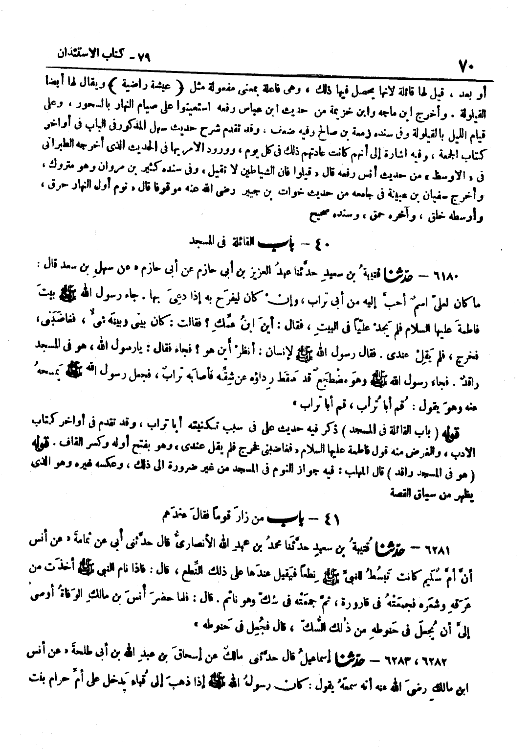 ذَكَرَ فِيهِ حَدِيثَ عَلِيٍّ فِي سَبَبِ تَكْنِيَتِهِ أَبَا تُرَابٍ وَقَدْ تَقَدَّمَ فِي أَوَاخِرِ كِتَابِ الْأَدَبِ وَالْغَرَضُ مِنْهُ قَوْلُ فَاطِمَةَ عَلَيْهَا السَّلَامُ فَغَاضَبَنِي فَخَرَجَ فَلَمْ يَقِلْ عِنْدِي وَهُوَ بِفَتْحِ أَوَّلِهِ وَكَسْرِ الْقَافِ