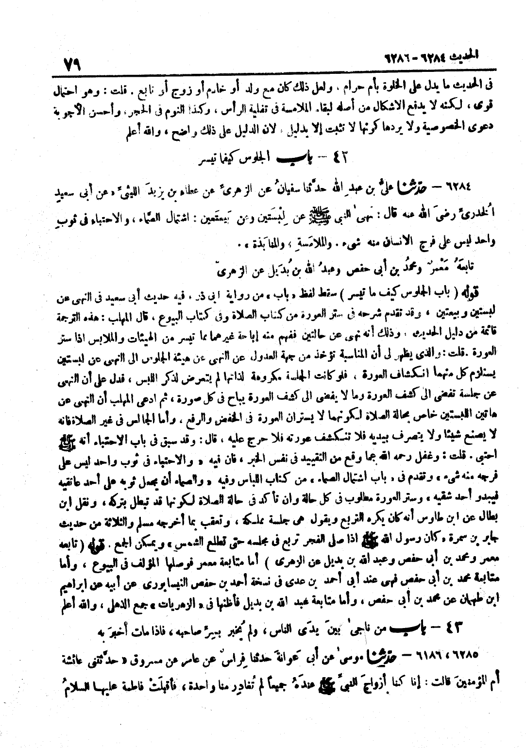 سَقَطَ لَفْظُ بَابِ مِنْ رِوَايَةِ أَبِي ذَرٍّ فِيهِ حَدِيثُ أَبِي سَعِيدٍ فِي النَّهْيِ عَنْ لُبْسَتَيْنِ وَبَيْعَتَيْنِ وَقَدْ تَقَدَّمَ شَرْحُهُ فِي سَتْرِ الْعَوْرَةِ مِنْ كِتَابِ الصَّلَاةِ وَفِي كِتَابِ الْبُيُوعِ قَالَ الْمُهَلَّبُ هَذِهِ التَّرْجَمَةُ قَائِمَةٌ مِنْ دَلِيلِ الْحَدِيثِ وَذَلِكَ أَنَّهُ نَهَى عَنْ حَالَتَيْنِ فَفُهِمَ مِنْهُ إِبَاحَةُ غَيْرِهِمَا مِمَّا تَيَسَّرَ مِنَ الْهَيْئَاتِ وَالْمَلَابِسِ إِذَا سَتَرَ الْعَوْرَةَ قُلْتُ وَالَّذِي يَظْهَرُ لِي أَنَّ الْمُنَاسَبَةَ تُؤْخَذُ مِنْ جِهَةِ الْعُدُولِ عَنِ النَّهْيِ عَنْ هَيْئَةِ الْجُلُوسِ إِلَى النَّهْيِ عَنْ لُبْسَتَيْنِ يَسْتَلْزِمُ كُلٌّ مِنْهُمَا انْكِشَافُ الْعَوْرَةِ فَلَوْ كَانَتِ الْجِلْسَةُ مَكْرُوهَةً لِذَاتِهَا لَمْ يَتَعَرَّضْ لِذِكْرِ اللُّبْسِ فَدَلَّ عَلَى أَنَّ النَّهْيَ عَنْ جِلْسَةٍ تُفْضِي إِلَى كَشْفِ الْعَوْرَةِ وَمَا لَا يُفْضِي إِلَى كَشْفِ الْعَوْرَةِ يُبَاحُ فِي كُلِّ صُورَةٍ ثُمَّ ادَّعَى الْمُهَلَّبُ أَنَّ النَّهْيَ عَنْ هَاتَيْنِ اللُّبْسَتَيْنِ خَاصٌّ بِحَالَةِ الصَّلَاةِ لِكَوْنِهِمَا لَا يَسْتُرَانِ الْعَوْرَةَ فِي الْخَفْضِ وَالرَّفْعِ وَأَمَّا الْجَالِسُ فِي غَيْرِ الصَّلَاةِ فَإِنَّهُ لَا يَصْنَعُ شَيْئًا وَلَا يَتَصَرَّفُ بِيَدَيْهِ فَلَا تَنْكَشِفُ عَوْرَتُهُ فَلَا حَرَجَ عَلَيْهِ قَالَ وَقَدْ سَبَقَ فِي بَابِ الِاحْتِبَاءِ أَنَّهُ صَلَّى اللَّهُ عَلَيْهِ وَسَلَّمَ احْتَبَى قُلْتُ وَغَفَلَ رَحِمَهُ اللَّهُ عَمَّا وَقَعَ مِنَ التَّقْيِيدِ فِي نَفْسِ الْخَبَرِ فَإِنَّ فِيهِ وَالِاحْتِبَاءِ فِي ثَوْبٍ وَاحِدٍ لَيْسَ عَلَى فَرْجِهِ مِنْهُ شَيْءٌ وَتَقَدَّمَ فِي بَابِ اشْتِمَالِ الصَّمَّاءِ مِنْ كِتَابِ اللِّبَاسِ وَفِيهِ وَالصَّمَّاءُ أَنْ يَجْعَلَ ثَوْبَهُ عَلَى أَحَدِ عَاتِقَيْهِ فَيَبْدُو أَحَدُ شِقَّيْهِ وَسَتْرُ الْعَوْرَةِ مَطْلُوبٌ فِي كُلِّ حَالَةٍ وَإِنْ تَأَكَّدَ فِي حَالَةِ الصَّلَاةِ لِكَوْنِهَا قَدْ تَبْطُلُ بِتَرْكِهِ وَنقل بن بطال عَن بن طَاوُسٍ أَنَّهُ كَانَ يَكْرَهُ التَّرَبُّعَ وَيَقُولُ هِيَ جِلْسَةُ مَمْلَكَةٍ وَتُعُقِّبَ بِمَا أَخْرَجَهُ مُسْلِمٌ وَالثَّلَاثَةُ مِنْ حَدِيثِ جَابِرِ بْنِ سَمُرَةَ كَانَ رَسُولُ اللَّهِ صَلَّى اللَّهُ عَلَيْهِ وَسَلَّمَ إِذَا صَلَّى الْفَجْرَ تَرَبَّعَ فِي مَجْلِسِهِ حَتَّى تَطْلُعَ الشَّمْسُ وَيُمْكِنُ الْجَمْعُ