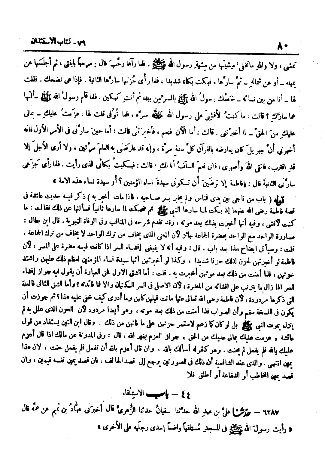 ذَكَرَ فِيهِ حَدِيثَ عَائِشَةَ فِي قِصَّةِ فَاطِمَةَ رَضِيَ اللَّهُ عَنْهُمَا إِذْ بَكَتْ لَمَّا سَارَّهَا النَّبِيُّ صَلَّى اللَّهُ عَلَيْهِ وَسَلَّمَ ثُمَّ ضَحِكَتْ لَمَّا سَارَّهَا ثَانِيًا فَسَأَلْتُهَا عَنْ ذَلِكَ فَقَالَتْ مَا كُنْتُ لِأَفْشِيَ وَفِيهِ أَنَّهَا أَخْبَرَتْ بِذَلِكَ بَعْدَ مَوْتِهِ وَقَدْ تَقَدَّمَ شَرْحُهُ فِي المناقب وَفِي الْوَفَاة النَّبَوِيَّة قَالَ بن بَطَّالٍ مُسَارَرَةُ الْوَاحِدِ مَعَ الْوَاحِدِ بِحَضْرَةِ الْجَمَاعَةِ جَائِزٌ لِأَنَّ الْمَعْنَى الَّذِي يُخَافُ مِنْ تَرْكِ الْوَاحِدِ لَا يُخَافُ مِنْ تَرْكِ الْجَمَاعَةِ قُلْتُ وَسَيَأْتِي إِيضَاحُ هَذَا بَعْدَ بَابٍ قَالَ وَفِيهِ أَنَّهُ لَا يَنْبَغِي إِفْشَاءُ السِّرِّ إِذَا كَانَتْ فِيهِ مضرَّة على المسر لِأَنَّ فَاطِمَةَ لَوْ أَخْبَرَتْهُنَّ لَحَزِنَّ لِذَلِكَ حُزْنًا شَدِيدًا وَكَذَا لَوْ أَخْبَرَتْهُنَّ أَنَّهَا سَيِّدَةُ نِسَاءِ الْمُؤْمِنِينَ لَعَظُمَ ذَلِكَ عَلَيْهِنَّ وَاشْتَدَّ حُزْنُهُنَّ فَلَمَّا أَمِنَتْ مِنْ ذَلِكَ بَعْدَ مَوْتِهِنَّ أَخْبَرَتْ بِهِ قُلْتُ أَمَّا الشِّقُّ الْأَوَّلُ فَحَقُّ الْعِبَارَةِ أَنْ يَقُولَ فِيهِ جَوَازُ إِفْشَاءِ السِّرِّ إِذَا زَالَ مَا يَتَرَتَّبُ عَلَى إِفْشَائِهِ مِنَ الْمَضَرَّةِ لِأَنَّ الْأَصْلَ فِي السِّرِّ الْكِتْمَانُ وَإِلَّا فَمَا فَائِدَتُهُ وَأَمَّا الشِّقُّ الثَّانِي فَالْعِلَّةُ الَّتِي ذَكَرَهَا مَرْدُودَةٌ لِأَنَّ فَاطِمَةَ رَضِيَ اللَّهُ تَعَالَى عَنْهَا مَاتَتْ قَبْلَهُنَّ كُلِّهِنَّ وَمَا أَدْرِي كَيْفَ خَفِيَ عَلَيْهِ هَذَا ثُمَّ جَوَّزْتُ أَنْ يَكُونَ فِي النُّسْخَةِ سَقَمٌ وَأَنَّ الصَّوَابَ فَلَمَّا أَمِنَتْ مِنْ ذَلِكَ بَعْدَ مَوْتِهِ وَهُوَ أَيْضًا مَرْدُودٌ لِأَنَّ الْحُزْنَ الَّذِي عُلِّلَ بِهِ لَمْ يَنْزِلْ بِمَوْتِ النَّبِيِّ صَلَّى اللَّهُ عَلَيْهِ وَسَلَّمَ بَلْ لَوْ كَانَ كَمَا زَعَمَ لَاسْتَمَرَّ حُزْنُهُنَّ عَلَى مَا فَاتَهُنَّ من ذَلِك وَقَالَ بن التِّينِ يُسْتَفَادُ مِنْ قَوْلِ عَائِشَةَ عَزَمْتُ عَلَيْكِ بِمَالي عَلَيْكِ مِنَ الْحَقِّ جَوَازُ الْعَزْمِ بِغَيْرِ اللَّهِ قَالَ وَفِي الْمُدَوَّنَةِ عَنْ مَالِكٍ إِذَا قَالَ أَعْزِمُ عَلَيْكَ بِاللَّهِ فَلَمْ يَفْعَلْ لَمْ يَحْنَثْ وَهُوَ كَقَوْلِهِ أَسْأَلُكَ بِاللَّهِ وَإِنْ قَالَ أَعْزِمُ بِاللَّهِ أَنْ تَفْعَلَ فَلَمْ يَفْعَلْ حَنِثَ لِأَنَّ هَذَا يَمِينٌ انْتَهَى وَالَّذِي عِنْدَ الشَّافِعِيَّةِ أَنَّ ذَلِكَ فِي الصُّورَتَيْنِ يَرْجِعُ إِلَى قَصْدِ الْحَالِفِ فَإِنْ قَصَدَ يَمِينَ نَفْسِهِ فَيَمِينٌ وَإِنْ قَصَدَ يَمِينَ الْمُخَاطَبِ أَوِ الشَّفَاعَةَ أَوْ أَطْلَقَ فَلَا