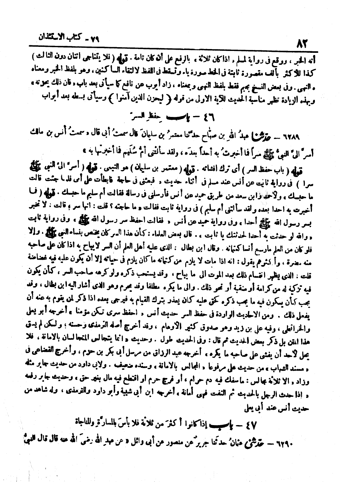 [6289] قَوْلُهُ مُعْتَمِرُ بْنُ سُلَيْمَانَ هُوَ التَّيْمِيُّ قَوْلُهُ أَسَرَّ إِلَيَّ النَّبِيُّ صَلَّى اللَّهُ عَلَيْهِ وَسَلَّمَ سِرًّا فِي رِوَايَةِ ثَابِتٍ عَنْ أَنَسٍ عِنْدَ مُسْلِمٍ فِي أَثْنَاءِ حَدِيثِ فَبَعَثَنِي فِي حَاجَةٍ فَأَبْطَأْتُ عَلَى أُمِّي فَلَمَّا جِئْتُ قَالَتْ مَا حَبسك وَلأَحْمَد وبن سَعْدٍ مِنْ طَرِيقِ حُمَيْدٍ عَنْ أَنَسٍ فَأَرْسَلَنِي فِي رِسَالَةٍ فَقَالَتْ أُمُّ سُلَيْمٍ مَا حَبَسَكَ قَوْلُهُ فَمَا أَخْبَرْتُ بِهِ أَحَدًا بَعْدَهُ وَلَقَدْ سَأَلَتْنِي أُمُّ سُلَيْمٍ فِي رِوَايَةِ ثَابِتٍ فَقَالَتْ مَا حَاجَتُهُ قُلْتُ إِنَّهَا سِرٌّ قَالَتْ لَا تُخْبِرْ بِسِرِّ رَسُولِ اللَّهِ صَلَّى اللَّهُ عَلَيْهِ وَسَلَّمَ أَحَدًا وَفِي رِوَايَةِ حُمَيْدٍ عَنْ أَنَسٍ فَقَالَتِ احْفَظْ سِرَّ رَسُولُ اللَّهِ صَلَّى اللَّهُ عَلَيْهِ وَسَلَّمَ وَفِي رِوَايَةِ ثَابِتٍ وَاللَّهِ لَوْ حَدَّثْتَ بِهِ أَحَدًا لَحَدَّثْتُكَ يَا ثَابِتُ قَالَ بعض الْعلمَاء كَأَن هَذَا السِّرّ كَانَ يَخْتَصُّ بِنِسَاءِ النَّبِيِّ صَلَّى اللَّهُ عَلَيْهِ وَسَلَّمَ وَإِلَّا فَلَوْ كَانَ مِنَ الْعِلْمِ مَا وَسِعَ أنسا كِتْمَانه وَقَالَ بن بَطَّالٍ الَّذِي عَلَيْهِ أَهْلُ الْعِلْمِ أَنَّ السِّرَّ لَا يُبَاحُ بِهِ إِذَا كَانَ عَلَى صَاحِبِهِ مِنْهُ مَضَرَّةٌ وَأَكْثَرُهُمْ يَقُولُ إِنَّهُ إِذَا مَاتَ لَا يَلْزَمُ مِنْ كِتْمَانِهِ مَا كَانَ يَلْزَمُ فِي حَيَاتِهِ إِلَّا أَنْ يَكُونَ عَلَيْهِ فِيهِ غَضَاضَةٌ قُلْتُ الَّذِي يَظْهَرُ انْقِسَامُ ذَلِكَ بَعْدَ الْمَوْتِ إِلَى مَا يُبَاحُ وَقَدْ يُسْتَحَبُّ ذِكْرُهُ وَلَوْ كَرِهَهُ صَاحِبُ السِّرِّ كَأَنْ يَكُونَ فِيهِ تَزْكِيَةٌ لَهُ مِنْ كَرَامَةٍ أَوْ مَنْقَبَةٍ أَوْ نَحْوِ ذَلِكَ وَإِلَى مَا يُكْرَهُ مُطْلَقًا وَقَدْ يحرم وَهُوَ الَّذِي أَشَارَ إِلَيْهِ بن بَطَّالٍ وَقَدْ يَجِبُ كَأَنْ يَكُونَ فِيهِ مَا يَجِبُ ذِكْرُهُ كَحَقٍّ عَلَيْهِ كَانَ يُعْذَرُ بِتَرْكِ الْقِيَامِ بِهِ فَيُرْجَى بَعْدَهُ إِذَا ذُكِرَ لِمَنْ يَقُومُ بِهِ عَنْهُ أَنْ يَفْعَلَ ذَلِكَ وَمِنَ الْأَحَادِيثِ الْوَارِدَةِ فِي حِفْظِ السِّرِّ حَدِيثُ أَنَسٍ احْفَظْ سِرِّي تَكُنْ مُؤْمِنًا أَخْرَجَهُ أَبُو يَعْلَى وَالْخَرَائِطِيُّ وَفِيهِ عَلِيُّ بْنُ زَيْدٍ وَهُوَ صَدُوقٌ كَثِيرُ الْأَوْهَامِ وَقَدْ أَخْرَجَ أَصْلَهُ التِّرْمِذِيُّ وَحَسَّنَهُ وَلَكِنْ لَمْ يَسُقْ هَذَا الْمَتْنَ بَلْ ذَكَرَ بَعْضَ الْحَدِيثِ ثُمَّ قَالَ وَفِي الْحَدِيثِ طُولٌ وَحَدِيثُ إِنَّمَا يَتَجَالَسُ الْمُتَجَالِسَانِ بِالْأَمَانَةِ فَلَا يَحِلُّ لِأَحَدٍ أَنْ يُفْشِيَ عَلَى صَاحِبِهِ مَا يَكْرَهُ أَخْرَجَهُ عَبْدُ الرَّزَّاقِ مِنْ مُرْسَلِ أَبِي بَكْرِ بْنِ حَزْمٍ وَأَخْرَجَ الْقُضَاعِيُّ فِي مُسْنَدِ الشِّهَابِ مِنْ حَدِيثِ عَلِيٍّ مَرْفُوعًا الْمَجَالِسُ بِالْأَمَانَةِ وَسَنَدُهُ ضَعِيفٌ وَلِأَبِي دَاوُدَ مِنْ حَدِيثِ جَابِرٍ مِثْلُهُ وَزَادَ إِلَّا ثَلَاثَةَ مَجَالِسَ مَا سُفِكَ فِيهِ دم حرَام أَو فرج حرَام أَوِ اقْتُطِعَ فِيهِ مَالٌ بِغَيْرِ حَقٍّ وَحَدِيثُ جَابِرٍ رَفَعَهُ إِذَا حَدَّثَ الرَّجُلُ بِالْحَدِيثِ ثُمَّ الْتفت فَهِيَ أَمَانَة أخرجه بن أَبِي شَيْبَةَ وَأَبُو دَاوُدَ وَالتِّرْمِذِيُّ وَلَهُ شَاهِدٌ من حَدِيث أنس عِنْد أبي يعلي