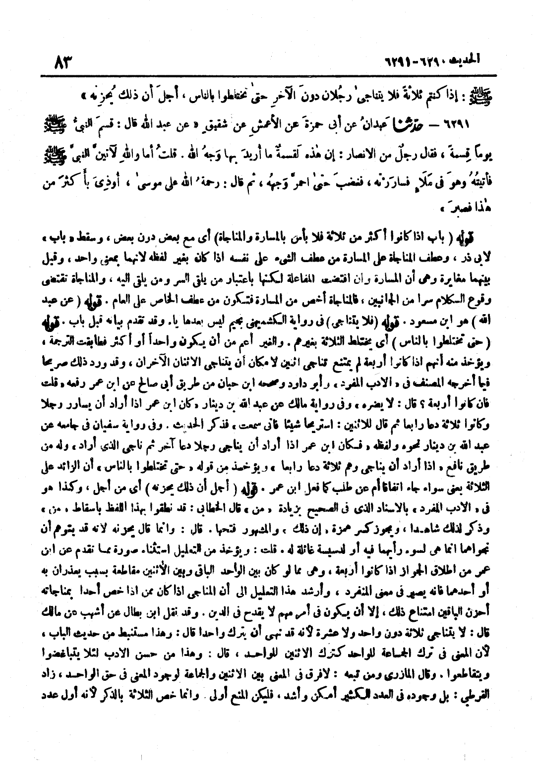 [6290] قَوْله عَن عبد الله هُوَ بن مَسْعُود قَوْله فَلَا يَتَنَاجَى فِي رِوَايَةِ الْكُشْمِيهَنِيِّ بِجِيمٍ لَيْسَ بَعْدَهَا يَاءٌ وَقَدْ تَقَدَّمَ بَيَانُهُ قَبْلَ بَابٍ قَوْلُهُ حَتَّى تَخْتَلِطُوا بِالنَّاسِ أَيْ يَخْتَلِطَ الثَّلَاثَةُ بِغَيْرِهِمْ وَالْغَيْرُ أَعَمُّ مِنْ أَنْ يَكُونَ وَاحِدًا أَوْ أَكْثَرَ فَطَابَقَتِ التَّرْجَمَةُ وَيُؤْخَذُ مِنْهُ أَنَّهُمْ إِذَا كَانُوا أَرْبَعَة لم يمْتَنع تناجي اثْنَيْنِ لَا مَكَان أَنْ يَتَنَاجَى الِاثْنَانِ الْآخَرَانِ وَقَدْ وَرَدَ ذَلِكَ صَرِيحًا فِيمَا أَخْرَجَهُ الْمُصَنِّفُ فِي الْأَدَبِ الْمُفْرَدِ وَأَبُو دَاوُد وَصَححهُ بن حبَان من طَرِيق أبي صَالح عَن بن عُمَرَ رَفَعَهُ قُلْتُ فَإِنْ كَانُوا أَرْبَعَةً قَالَ لَا يَضُرُّهُ وَفِي رِوَايَةِ مَالِكٍ عَنْ عَبْدِ اللَّهِ بْنِ دِينَار كَانَ بن عُمَرَ إِذَا أَرَادَ أَنْ يُسَارِرَ رَجُلًا وَكَانُوا ثَلَاثَةً دَعَا رَابِعًا ثُمَّ قَالَ لِلِاثْنَيْنِ اسْتَرِيحَا شَيْئًا فَإِنِّي سَمِعْتُ فَذَكَرَ الْحَدِيثَ وَفِي رِوَايَةِ سُفْيَانُ فِي جَامِعِهِ عَنْ عَبْدِ اللَّهِ بْنِ دِينَار نَحوه وَلَفظه فَكَانَ بن عُمَرَ إِذَا أَرَادَ أَنْ يُنَاجِيَ رَجُلًا دَعَا آخَرَ ثُمَّ نَاجَى الَّذِي أَرَادَ وَلَهُ مِنْ طَرِيقِ نَافِعٍ إِذَا أَرَادَ أَنْ يُنَاجِيَ وَهُمْ ثَلَاثَةٌ دَعَا رَابِعًا وَيُؤْخَذُ مِنْ قَوْلِهِ حَتَّى تَخْتَلِطُوا بِالنَّاسِ أَنَّ الزَّائِدَ عَلَى الثَّلَاثَةِ يَعْنِي سَوَاءً جَاءَ اتِّفَاقًا أَمْ عَنْ طَلَبٍ كَمَا فعل بن عُمَرَ قَوْلُهُ أَجْلَ أَنَّ ذَلِكَ يُحْزِنُهُ أَيْ مِنْ أَجْلِ وَكَذَا هُوَ فِي الْأَدَبِ الْمُفْرَدِ بِالْإِسْنَادِ الَّذِي فِي الصَّحِيحِ بِزِيَادَةِ مِنْ قَالَ الْخَطَّابِيُّ قَدْ نَطَقُوا بِهَذَا اللَّفْظِ بِإِسْقَاطِ مِنْ وَذَكَرَ لِذَلِكَ شَاهِدًا وَيَجُوزُ كَسْرُ هَمْزَةِ إِنَّ ذَلِكَ وَالْمَشْهُورُ فَتْحُهَا قَالَ وَإِنَّمَا قَالَ يُحْزِنُهُ لِأَنَّهُ قَدْ يَتَوَهَّمُ أَنَّ نَجَوَاهُمَا إِنَّمَا هِيَ لِسُوءِ رَأْيِهِمَا فِيهِ أَوْ لِدَسِيسَةٍ غَائِلَةٍ لَهُ قُلْتُ وَيُؤْخَذُ مِنَ التَّعْلِيلِ اسْتِثْنَاءُ صُورَةٍ مِمَّا تقدم عَن بن عُمَرَ مِنْ إِطْلَاقِ الْجَوَازِ إِذَا كَانُوا أَرْبَعَةً وَهِيَ مِمَّا لَوْ كَانَ بَيْنَ الْوَاحِدِ الْبَاقِي وَبَيْنَ الِاثْنَيْنِ مُقَاطَعَةٌ بِسَبَبٍ يُعْذَرَانِ بِهِ أَوْ أَحَدِهِمَا فَإِنَّهُ يَصِيرُ فِي مَعْنَى الْمُنْفَرِدِ وَأَرْشَدَ هَذَا التَّعْلِيلُ إِلَى أَنَّ الْمُنَاجِيَ إِذَا كَانَ مِمَّنْ إِذَا خَصَّ أَحَدًا بِمُنَاجَاتِهِ أَحْزَنَ الْبَاقِينَ امْتنَاع ذَلِكَ إِلَّا أَنْ يَكُونَ فِي أَمْرٍ مُهِمٍّ لَا يقْدَح فِي الدّين وَقد نقل بن بَطَّالٍ عَنْ أَشْهَبَ عَنْ مَالِكٍ قَالَ لَا يَتَنَاجَى ثَلَاثَةٌ دُونَ وَاحِدٍ وَلَا عَشَرَةٌ لِأَنَّهُ قَدْ نُهِيَ أَنْ يَتْرُكَ وَاحِدًا قَالَ وَهَذَا مُسْتَنْبَطٌ مِنْ حَدِيثِ الْبَابِ لِأَنَّ الْمَعْنَى فِي تَرْكِ الْجَمَاعَةِ لِلْوَاحِدِ كَتَرْكِ الِاثْنَيْنِ لِلْوَاحِدِ قَالَ وَهَذَا مِنْ حُسْنِ الْأَدَبِ لِئَلَّا يَتَبَاغَضُوا وَيَتَقَاطَعُوا وَقَالَ الْمَازِرِيُّ وَمَنْ تَبِعَهُ لَا فَرْقَ فِي الْمَعْنَى بَيْنَ الِاثْنَيْنِ وَالْجَمَاعَةِ لِوُجُودِ الْمَعْنَى فِي حَقِّ الْوَاحِدِ زَادَ الْقُرْطُبِيُّ بَلْ وُجُودُهُ فِي الْعَدَدِ الْكَثِيرِ أَمْكَنُ وَأَشَدُّ فَلْيَكُنِ الْمَنْعُ أَوْلَى وَإِنَّمَا خَصَّ الثَّلَاثَةَ بِالذِّكْرِ لِأَنَّهُ أَوَّلُ عَدَدٍ