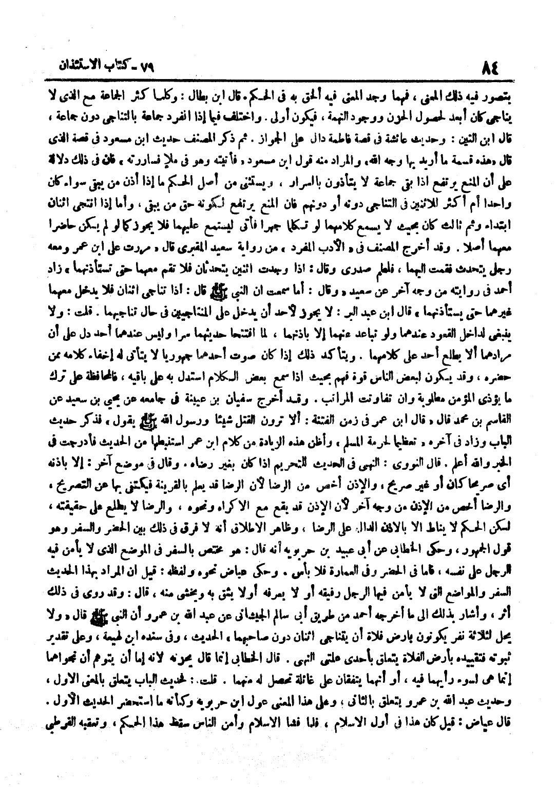 يُتَصَوَّرُ فِيهِ ذَلِكَ الْمَعْنَى فَمَهْمَا وُجِدَ الْمَعْنَى فِيهِ ألحق بِهِ فِي الحكم قَالَ بن بَطَّالٍ وَكُلَّمَا كَثُرَ الْجَمَاعَةُ مَعَ الَّذِي لَا يُنَاجَى كَانَ أَبْعَدَ لِحُصُولِ الْحُزْنِ وَوُجُودِ التُّهْمَةِ فَيَكُونُ أَوْلَى وَاخْتُلِفَ فِيمَا إِذَا انْفَرَدَ جَمَاعَةٌ بالتناجي دون جمَاعَة قَالَ بن التِّينِ وَحَدِيثُ عَائِشَةَ فِي قِصَّةِ فَاطِمَةَ دَالٌّ على الْجَوَاز ثمَّ ذكر المُصَنّف حَدِيث بن مَسْعُودٍ فِي قِصَّةِ الَّذِي قَالَ هَذِهِ قِسْمَةٌ مَا أُرِيدَ بِهَا وَجْهُ اللَّهِ وَالْمُرَادُ مِنْهُ قَول بن مَسْعُودٍ فَأَتَيْتُهُ وَهُوَ فِي مَلَإٍ فَسَارَرْتُهُ فَإِنَّ فِي ذَلِكَ دَلَالَةٌ عَلَى أَنَّ الْمَنْعَ يَرْتَفِعُ إِذَا بَقِيَ جَمَاعَةٌ لَا يَتَأَذَّوْنَ بِالسِّرَارِ وَيُسْتَثْنَى مِنْ أَصْلِ الْحُكْمِ مَا إِذَا أَذِنَ مَنْ يَبْقَى سَوَاءٌ كَانَ وَاحِدًا أَمْ أَكْثَرَ لِلِاثْنَيْنِ فِي التَّنَاجِي دُونَهُ أَوْ دُونَهُمْ فَإِنَّ الْمَنْعَ يَرْتَفِعُ لِكَوْنِهِ حَقَّ مَنْ يَبْقَى وَأَمَّا إِذَا انْتَجَى اثْنَانِ ابْتِدَاءً وَثَمَّ ثَالِثٌ كَانَ بِحَيْثُ لَا يَسْمَعُ كَلَامَهُمَا لَوْ تَكَلَّمَا جَهْرًا فَأَتَى لِيَسْتَمِعَ عَلَيْهِمَا فَلَا يَجُوزُ كَمَا لَوْ لَمْ يَكُنْ حَاضِرًا مَعَهُمَا أَصْلًا وَقَدْ أَخْرَجَ الْمُصَنِّفُ فِي الْأَدَبِ الْمُفْرَدِ مِنْ رِوَايَةِ سَعِيدٍ الْمَقْبُرِيِّ قَالَ مَرَرْت على بن عُمَرَ وَمَعَهُ رَجُلٌ يَتَحَدَّثُ فَقُمْتُ إِلَيْهِمَا فَلَطَمَ صَدْرِي وَقَالَ إِذَا وَجَدْتَ اثْنَيْنِ يَتَحَدَّثَانِ فَلَا تَقُمْ مَعَهُمَا حَتَّى تَسْتَأْذِنَهُمَا زَادَ أَحْمَدُ فِي رِوَايَتِهِ مِنْ وَجْهٍ آخَرَ عَنْ سَعِيدٍ وَقَالَ أَمَا سَمِعْتَ أَنَّ النَّبِيَّ صَلَّى اللَّهُ عَلَيْهِ وَسَلَّمَ قَالَ إِذَا تَنَاجَى اثْنَانِ فَلَا يَدْخُلُ مَعَهُمَا غَيرهمَا حَتَّى يستأذنهما قَالَ بن عَبْدِ الْبَرِّ لَا يَجُوزُ لِأَحَدٍ أَنْ يَدْخُلَ عَلَى الْمُتَنَاجِيَيْنِ فِي حَالِ تَنَاجِيهِمَا قُلْتُ وَلَا يَنْبَغِي لِدَاخِلٍ الْقُعُودُ عِنْدَهُمَا وَلَوْ تَبَاعَدَ عَنْهُمَا إِلَّا بِإِذْنِهِمَا لَمَّا افْتَتَحَا حَدِيثَهُمَا سِرًّا وَلَيْسَ عِنْدَهُمَا أَحَدٌ دَلَّ عَلَى أَنَّ مُرَادَهُمَا أَلَّا يَطَّلِعَ أَحَدٌ عَلَى كَلَامِهِمَا وَيَتَأَكَّدُ ذَلِكَ إِذَا كَانَ صَوْتُ أَحَدِهِمَا جَهُورِيًّا لَا يَتَأَتَّى لَهُ إِخْفَاءُ كَلَامِهِ مِمَّنْ حَضَرَهُ وَقَدْ يَكُونُ لِبَعْضِ النَّاسِ قُوَّةُ فَهْمٍ بِحَيْثُ إِذَا سَمِعَ بَعْضَ الْكَلَامِ اسْتَدَلَّ بِهِ عَلَى بَاقِيهِ فَالْمُحَافَظَةُ عَلَى تَرْكِ مَا يُؤْذِي الْمُؤْمِنَ مَطْلُوبَةٌ وَإِنْ تَفَاوَتَتِ الْمَرَاتِبُ وَقَدْ أَخْرَجَ سُفْيَانُ بْنُ عُيَيْنَةَ فِي جَامِعِهِ عَنْ يَحْيَى بْنِ سَعِيدٍ عَنِ الْقَاسِمِ بْنِ مُحَمَّدٍ قَالَ قَالَ بن عُمَرَ فِي زَمَنِ الْفِتْنَةِ أَلَا تَرَوْنَ الْقَتْلَ شَيْئًا وَرَسُولُ اللَّهِ صَلَّى اللَّهُ عَلَيْهِ وَسَلَّمَ يَقُولُ فَذَكَرَ حَدِيثَ الْبَابِ وَزَادَ فِي آخِرِهِ تَعْظِيمًا لِحُرْمَةِ الْمُسْلِمِ وَأَظُنُّ هَذِهِ الزِّيَادَةَ مِنْ كَلَام بن عُمَرَ اسْتَنْبَطَهَا مِنَ الْحَدِيثِ فَأُدْرِجَتْ فِي الْخَبَرِ وَاللَّهُ أَعْلَمُ قَالَ النَّوَوِيُّ النَّهْيُ فِي الْحَدِيثِ لِلتَّحْرِيمِ إِذَا كَانَ بِغَيْرِ رِضَاهُ وَقَالَ فِي مَوْضِعٍ آخَرَ إِلَّا بِإِذْنِهِ أَيْ صَرِيحًا كَانَ أَوْ غَيْرَ صَرِيحٍ وَالْإِذْنُ أَخَصُّ مِنَ الرِّضَا لِأَنَّ الرِّضَا قَدْ يُعْلَمُ بِالْقَرِينَةِ فَيُكْتَفَى بِهَا عَنِ التَّصْرِيحِ وَالرِّضَا أَخَصُّ مِنَ الْإِذْنِ مِنْ وَجْهٍ آخَرَ لِأَنَّ الْإِذْنَ قَدْ يَقَعُ مَعَ الْإِكْرَاهِ وَنَحْوِهِ وَالرِّض
