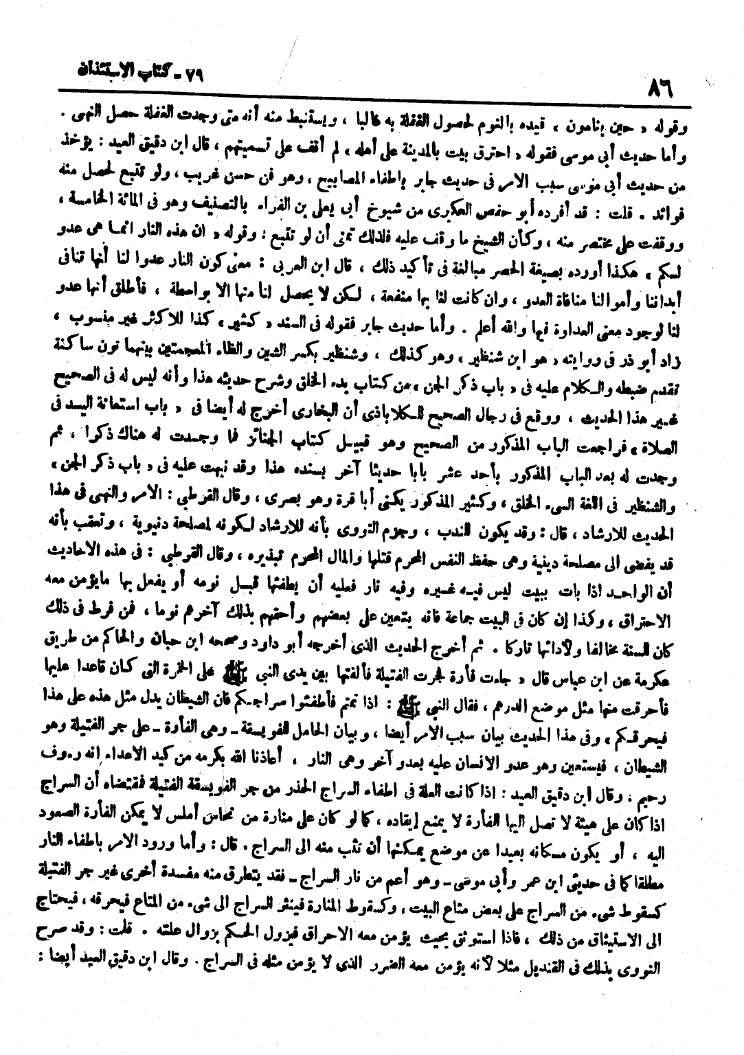 [6293] حِينَ يَنَامُونَ قَيَّدَهُ بِالنَّوْمِ لِحُصُولِ الْغَفْلَةِ بِهِ غَالِبًا وَيُسْتَنْبَطُ مِنْهُ أَنَّهُ مَتَى وُجِدَتِ الْغَفْلَةُ حَصَلَ النَّهْيُ وَأَمَّا حَدِيثُ أَبِي مُوسَى فَقَوْلُهُ احْتَرَقَ بَيْتٌ بِالْمَدِينَةِ عَلَى أَهْلِهِ لَمْ اقف على تسميتهم قَالَ بن دَقِيقِ الْعِيدِ يُؤْخَذُ مِنْ حَدِيثِ أَبِي مُوسَى سَبَبُ الْأَمْرِ فِي حَدِيثِ جَابِرٍ بِإِطْفَاءِ الْمَصَابِيحِ وَهُوَ فَنٌّ حَسَنٌ غَرِيبٌ وَلَوْ تُتُبِّعَ لَحَصَلَ مِنْهُ فَوَائِدُ قُلْتُ قَدْ أَفْرَدَهُ أَبُو حَفْصٍ الْعُكْبَرِيُّ مِنْ شُيُوخِ أَبِي يَعْلَى بْنِ الْفَرَّاءِ بِالتَّصْنِيفِ وَهُوَ فِي الْمِائَةِ الْخَامِسَةِ وَوَقَفْتُ عَلَى مُخْتَصَرٍ مِنْهُ وَكَأَنَّ الشَّيْخَ مَا وَقَفَ عَلَيْهِ فَلِذَلِكَ تَمَنَّى أَنْ لَوْ تُتُبِّعَ وَقَوْلُهُ