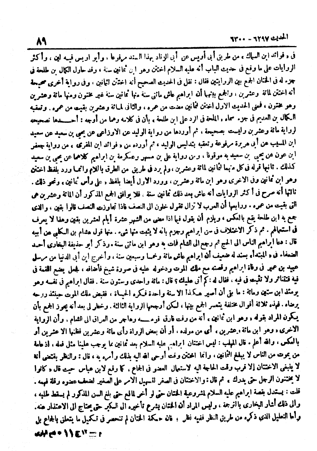 فِي فَوَائِد بن السِّمَاكِ مِنْ طَرِيقِ أَبِي أُوَيْسٍ عَنْ أَبِي الزِّنَادِ بِهَذَا السَّنَدِ مَرْفُوعًا وَأَبُو أُوَيْسٍ فِيهِ لِينٌ وَأَكْثَرُ الرِّوَايَاتِ عَلَى مَا وَقَعَ فِي حَدِيثِ الْبَابِ أَنَّهُ عَلَيْهِ السَّلَامُ اخْتَتَنَ وَهُوَ بن ثَمَانِينَ سَنَةً وَقَدْ حَاوَلَ الْكَمَالُ بْنُ طَلْحَةَ فِي جُزْءٍ لَهُ فِي الْخِتَانِ الْجَمْعَ بَيْنَ الرِّوَايَتَيْنِ فَقَالَ نُقِلَ فِي الْحَدِيثِ الصَّحِيحِ أَنَّهُ اخْتَتَنَ لِثَمَانِينَ وَفِي رِوَايَةٍ أُخْرَى صَحِيحَةٍ أَنَّهُ اخْتَتَنَ لِمِائَةٍ وَعِشْرِينَ وَالْجَمْعُ بَيْنَهُمَا أَنَّ إِبْرَاهِيمَ عَاشَ مِائَتي سنة مِنْهَا ثَمَانِينَ سنة غير مختون وَمِنْهَا مائَة وَعشْرين وَهُوَ مختون فَمَعْنَى الحَدِيث الأول اختتن ثَمَانِينَ مَضَتْ مِنْ عُمُرِهِ وَالثَّانِي لِمِائَةٍ وَعِشْرِينَ بَقِيَتْ مِنْ عُمُرِهِ وَتَعَقَّبَهُ الْكَمَالُ بْنُ الْعَدِيمِ فِي جُزْء سَمَّاهُ الملحة فِي الرَّد على بن طَلْحَةَ بِأَنَّ فِي كَلَامِهِ وَهَمًا مِنْ أَوْجُهٍ أَحَدُهَا تَصْحِيحُهُ لِرِوَايَةِ مِائَةٍ وَعِشْرِينَ وَلَيْسَتْ بِصَحِيحَةٍ ثُمَّ أَوْرَدَهَا مِنْ رِوَايَةِ الْوَلِيدِ عَنِ الْأَوْزَاعِيِّ عَنْ يَحْيَى بْنِ سَعِيدٍ عَنْ سَعِيدِ بْنِ الْمُسَيَّبِ عَنْ أَبِي هُرَيْرَةَ مَرْفُوعَةً وَتَعَقَّبَهُ بِتَدْلِيسِ الْوَلِيد ثمَّ أوردهُ من فَوَائِد بن الْمُقْرِئ مِنْ رِوَايَةِ جَعْفَرِ بْنِ عَوْنٍ عَنْ يَحْيَى بْنِ سَعِيدٍ بِهِ مَوْقُوفًا وَمَنْ رِوَايَةِ عَلِيِّ بْنِ مُسْهِرٍ وَعِكْرِمَةَ بْنِ إِبْرَاهِيمَ كِلَاهُمَا عَنْ يَحْيَى بْنِ سَعِيدٍ كَذَلِكَ ثَانِيهَا قَوْلُهُ فِي كُلٍّ مِنْهُمَا لِثَمَانِينَ لِمِائَةٍ وَعِشْرِينَ وَلَمْ يَرِدْ فِي طَرِيقٍ مِنَ الطُّرُقِ بِاللَّامِ وَإِنَّمَا وَرَدَ بِلَفْظ اختتن وَهُوَ بن ثَمَانِينَ وَفِي الْأُخْرَى وَهُوَ بن مِائَةٍ وَعِشْرِينَ وَوَرَدَ الْأَوَّلُ أَيْضًا بِلَفْظِ عَلَى رَأْسِ ثَمَانِينَ وَنَحْوَ ذَلِكَ ثَالِثُهَا أَنَّهُ صَرَّحَ فِي أَكْثَرِ الرِّوَايَاتِ أَنَّهُ عَاشَ بَعْدَ ذَلِكَ ثَمَانِينَ سَنَةً فَلَا يُوَافِقُ الْجَمْعُ الْمَذْكُورُ أَنَّ الْمِائَةَ وَعِشْرِينَ هِيَ الَّتِي بَقِيَتْ مِنْ عُمُرِهِ وَرَابِعُهَا أَنَّ الْعَرَبَ لَا تَزَالُ تَقُولُ خَلَوْنَ إِلَى النِّصْفِ فَإِذَا تَجَاوَزَتِ النِّصْفَ قَالُوا بَقِينَ وَالَّذِي جمع بِهِ بن طَلْحَةَ يَقَعُ بِالْعَكْسِ وَيَلْزَمُ أَنْ يَقُولَ فِيمَا إِذَا مَضَى مِنَ الشَّهْرِ عَشَرَةُ أَيَّامٍ لِعِشْرِينَ بَقِينَ وَهَذَا لَا يُعْرَفُ فِي اسْتِعْمَالِهِمْ ثُمَّ ذَكَرَ الِاخْتِلَافَ فِي سِنِّ إِبْرَاهِيمَ وَجَزَمَ بِأَنَّهُ لَا يَثْبُتُ مِنْهَا شَيْءٌ مِنْهَا قَوْلُ هِشَامِ بْنِ الْكَلْبِيِّ عَنْ أَبِيهِ قَالَ دَعَا إِبْرَاهِيمُ النَّاسَ إِلَى الْحَجِّ ثُمَّ رَجَعَ إِلَى الشَّامِ فَمَاتَ بِهِ وَهُوَ بن مِائَتَيْ سَنَةٍ وَذَكَرَ أَبُو حُذَيْفَةَ الْبُخَارِيُّ أَحَدَ الضُّعَفَاءِ فِي الْمُبْتَدَأِ بِسَنَدٍ لَهُ ضَعِيفٍ أَنَّ إِبْرَاهِيمَ عَاشَ مِائَةً وَخَمْسًا وَسَبْعِينَ سَنَةً وَأَخْرَجَ بن أَبِي الدُّنْيَا مِنْ مُرْسَلِ عُبَيْدِ بْنِ عُمَيْرٍ فِي وَفَاةِ إِبْرَاهِيمَ وَقِصَّتِهِ مَعَ مَلَكِ الْمَوْتِ وَدُخُولِهِ عَلَيْهِ فِي صُورَةِ شَيْخٍ فَأَضَافَهُ فَجَعَلَ يَضَعُ اللُّقْمَةَ فِي فِيهِ فَتَتَنَاثَرُ وَلَا تَثْبُتُ فِي فِيهِ فَقَالَ لَهُ كَمْ أَتَى عَلَيْكَ قَالَ مِائَةٌ وَإِحْدَى وَسِتُّونَ سَنَةً فَقَالَ إِبْرَاهِيمُ فِي نَفسه وَهُوَ يَوْمئِذٍ بن سِتِّينَ وَمِائَةٍ مَا بَقِيَ أَنْ أَصِيرَ هَكَذَا إِلَّا سَنَةٌ وَاحِدَةٌ فَكَرِهَ الْحَيَاةَ فَقَبَضَ مَلَكُ الْمَوْتِ حِينَئِذٍ رُوحَهُ بِرِضَاهُ فَهَذِهِ ثَلَا