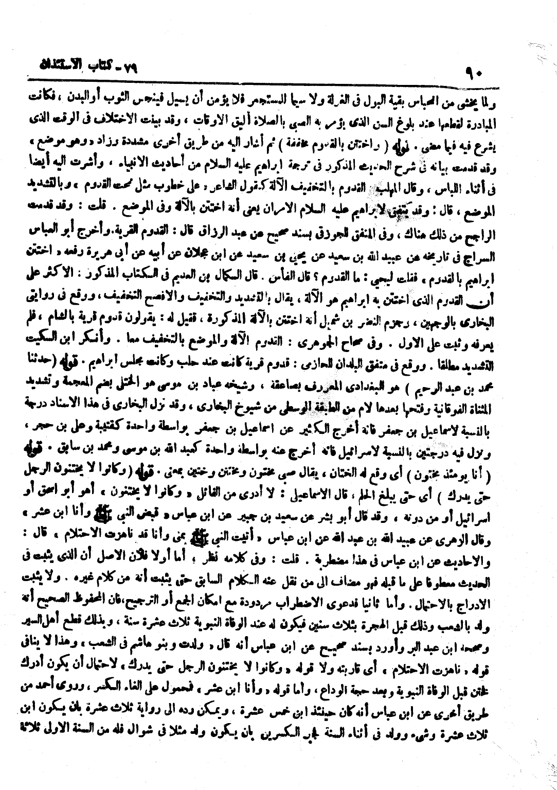 [6299] قَوْلُهُ حَدَّثَنَا مُحَمَّدُ بْنُ عَبْدِ الرَّحِيمِ هُوَ الْبَغْدَادِيُّ الْمَعْرُوفُ بِصَاعِقَةَ وَشَيْخُهُ عَبَّادُ بْنُ مُوسَى هُوَ الْخُتَّلِيُّ بِضَمِّ الْمُعْجَمَةِ وَتَشْدِيدِ الْمُثَنَّاةِ الْفَوْقَانِيَّةِ وَفَتْحِهَا بَعْدَهَا لَامٌ مِنَ الطَّبَقَةِ الْوُسْطَى مِنْ شُيُوخِ الْبُخَارِيِّ وَقَدْ نَزَلَ الْبُخَارِيُّ فِي هَذَا الْإِسْنَادِ دَرَجَةً بِالنِّسْبَةِ لِإِسْمَاعِيلَ بْنِ جَعْفَرٍ فَإِنَّهُ أَخْرَجَ الْكَثِيرَ عَنْ إِسْمَاعِيلَ بْنِ جَعْفَرٍ بِوَاسِطَةٍ وَاحِدَةٍ كَقُتَيْبَةَ وَعَلِيِّ بْنِ حُجْرٍ وَنَزَلَ فِيهِ دَرَجَتَيْنِ بِالنِّسْبَةِ لِإِسْرَائِيلَ فَإِنَّهُ أَخْرَجَ عَنْهُ بِوَاسِطَةٍ وَاحِدَةٍ كَعَبْدِ اللَّهِ بْنِ مُوسَى وَمُحَمّد بن سَابق قَوْله انا يَوْمئِذٍ مَخْتُونٌ أَيْ وَقَعَ لَهُ الْخِتَانُ يُقَالُ صَبِيٌّ مَخْتُونٌ وَمُخْتَتَنٌ وَخَتِينٌ بِمَعْنًى قَوْلُهُ وَكَانُوا لَا يَخْتِنُونَ الرَّجُلَ حَتَّى يُدْرِكَ أَيْ حَتَّى يَبْلُغَ الْحُلُمَ قَالَ الْإِسْمَاعِيلِيُّ لَا أَدْرِي مَنِ الْقَائِلُ وَكَانُوا لَا يَخْتِنُونَ أَهُوَ أَبُو إِسْحَاقَ أَوْ إِسْرَائِيلُ أَوْ مَنْ دُونَهُ وَقَدْ قَالَ أَبُو بِشْرٍ عَنْ سَعِيدِ بْنِ جُبَيْرٍ عَنِ بن عَبَّاسٍ قُبِضَ النَّبِيُّ صَلَّى اللَّهُ عَلَيْهِ وَسَلَّمَ وانا بن عَشْرٍ وَقَالَ الزُّهْرِيِّ عَنْ عُبَيْدِ اللَّهِ بْنِ عَبْدِ اللَّهِ عَنِ بن عَبَّاسٍ أَتَيْتُ النَّبِيَّ صَلَّى اللَّهُ عَلَيْهِ وَسَلَّمَ بِمِنًى وَأَنَا قَدْ نَاهَزْتُ الِاحْتِلَامَ قَالَ وَالْأَحَادِيثُ عَن بن عَبَّاسٍ فِي هَذَا مُضْطَرِبَةٌ قُلْتُ وَفِي كَلَامِهِ نَظَرٌ أَمَّا أَوَّلًا فَلِأَنَّ الْأَصْلَ أَنَّ الَّذِي يَثْبُتُ فِي الْحَدِيثِ مَعْطُوفًا عَلَى مَا قَبْلَهُ فَهُوَ مُضَافٌ إِلَى مَنْ نَقَلَ عَنْهُ الْكَلَامَ السَّابِقَ حَتَّى يَثْبُتَ أَنَّهُ مِنْ كَلَامِ غَيْرِهِ وَلَا يَثْبُتُ الْإِدْرَاجُ بِالِاحْتِمَالِ وَأَمَّا ثَانِيًا فَدَعْوَى الِاضْطِرَابِ مَرْدُودَةٌ مَعَ إِمْكَانِ الْجَمْعِ أَوِ التَّرْجِيحِ فَإِنَّ الْمَحْفُوظَ الصَّحِيحَ أَنَّهُ وُلِدَ بِالشِّعْبِ وَذَلِكَ قَبْلَ الْهِجْرَةِ بِثَلَاثِ سِنِينَ فَيَكُونُ لَهُ عِنْدَ الْوَفَاةِ النَّبَوِيَّةِ ثَلَاثَ عَشْرَةَ سَنَةً وَبِذَلِكَ قَطَعَ أهل السّير وَصَححهُ بن عبد الْبر وَأورد بِسَنَد صَحِيح عَن بن عَبَّاسٍ أَنَّهُ قَالَ وُلِدْتُ وَبَنُو هَاشِمٍ فِي الشِّعْبِ وَهَذَا لَا يُنَافِي قَوْلَهُ نَاهَزْتُ الِاحْتِلَامَ أَيْ قَارَبْتُهُ وَلَا قَوْلَهُ وَكَانُوا لَا يَخْتِنُونَ الرَّجُلَ حَتَّى يُدْرِكَ لِاحْتِمَالِ أَنْ يَكُونَ أَدْرَكَ فَخُتِنَ قَبْلَ الْوَفَاةِ النَّبَوِيَّةِ وَبَعْدِ حَجَّةِ الْوَدَاعِ وَأما قَوْله وانا بن عَشْرٍ فَمَحْمُولٌ عَلَى إِلْغَاءِ الْكَسْرِ وَرَوَى أَحْمَدُ من طَرِيق أُخْرَى عَن بن عَبَّاس انه كَانَ حِينَئِذٍ بن خَمْسَ عَشْرَةَ وَيُمْكِنُ رَدُّهُ إِلَى رِوَايَةِ ثَلَاثَ عشرَة بِأَن يكون بن ثَلَاثَ عَشْرَةَ وَشَيْءٍ وَوُلِدَ فِي أَثْنَاءِ السَّنَةِ فَجَبْرُ الْكَسْرَيْنِ بِأَنْ يَكُونَ وُلِدَ مَثَلًا فِي شَوَّالٍ فَلَهُ مِنَ السَّنَةِ الْأُولَى ثَلَاثَةُ