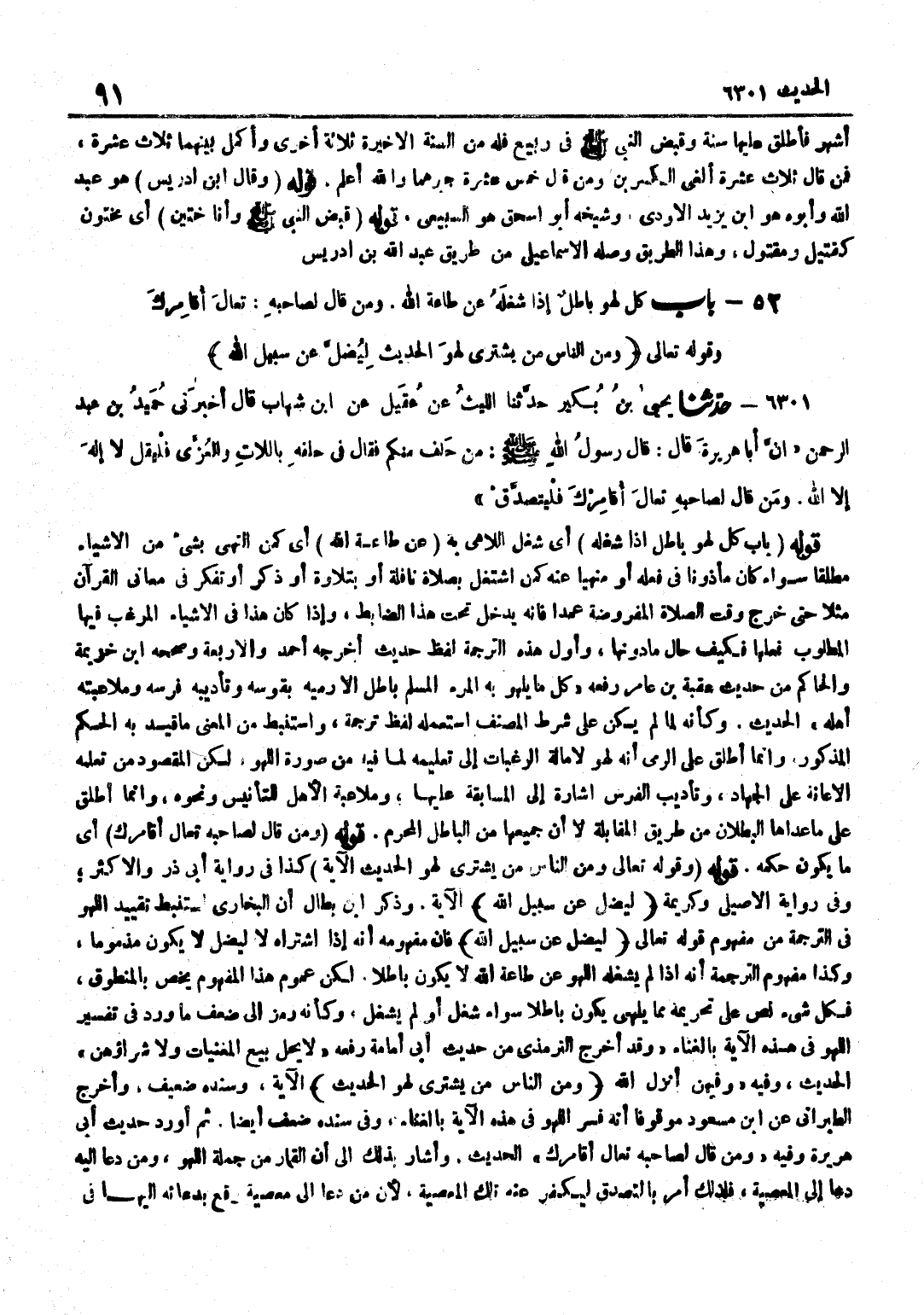 إِذَا شَغَلَهُ أَيْ شَغَلَ اللَّاهِيَ بِهِ عَنْ طَاعَةِ اللَّهِ أَي كمن النَّهْي بِشَيْءٍ مِنَ الْأَشْيَاءِ مُطْلَقًا سَوَاءٌ كَانَ مَأْذُونًا فِي فِعْلِهِ أَوْ مَنْهِيًّا عَنْهُ كَمَنِ اشْتَغَلَ بِصَلَاةِ نَافِلَةٍ أَوْ بِتِلَاوَةٍ أَوْ ذِكْرٍ أَوْ تَفَكُّرٍ فِي مَعَانِي الْقُرْآنِ مَثَلًا حَتَّى خَرَجَ وَقْتُ الصَّلَاةِ الْمَفْرُوضَةِ عَمْدًا فَإِنَّهُ يَدْخُلُ تَحْتَ هَذَا الضَّابِطِ وَإِذَا كَانَ هَذَا فِي الْأَشْيَاءِ الْمُرَغَّبِ فِيهَا الْمَطْلُوبِ فِعْلُهَا فَكَيْفَ حَالُ مَا دُونَهَا وَأَوَّلُ هَذِهِ التَّرْجَمَةِ لَفْظُ حَدِيثٍ أَخْرَجَهُ احْمَد وَالْأَرْبَعَة وَصَححهُ بن خُزَيْمَةَ وَالْحَاكِمُ مِنْ حَدِيثِ عُقْبَةَ بْنِ عَامِرٍ رَفَعَهُ كُلُّ مَا يَلْهُو بِهِ الْمَرْءُ الْمُسْلِمُ بَاطِلٌ إِلَّا رَمْيَهُ بِقَوْسِهِ وَتَأْدِيبَهُ فَرَسَهُ وَمُلَاعَبَتُهَ أَهْلَهُ الْحَدِيثَ وَكَأَنَّهُ لَمَّا لَمْ يَكُنْ عَلَى شَرط المُصَنّف اسْتَعْملهُ لَفْظَ تَرْجَمَةٍ وَاسْتَنْبَطَ مِنَ الْمَعْنَى مَا قَيَّدَ بِهِ الْحُكْمَ الْمَذْكُورَ وَإِنَّمَا أَطْلَقَ عَلَى الرَّمْيِ أَنَّهُ لَهْوٌ لِإِمَالَةِ الرَّغَبَاتِ إِلَى تَعْلِيمِهِ لِمَا فِيهِ مِنْ صُورَةِ اللَّهْوِ لَكِنَّ الْمَقْصُودَ مِنْ تَعَلُّمِهِ الْإِعَانَةُ عَلَى الْجِهَادِ وَتَأْدِيبُ الْفَرَسِ إِشَارَةٌ إِلَى الْمُسَابَقَةِ عَلَيْهَا وَمُلَاعَبَةُ الْأَهْلِ لِلتَّأْنِيسِ وَنَحْوِهِ وَإِنَّمَا أَطْلَقَ عَلَى مَا عَدَاهَا الْبُطْلَانَ مِنْ طَرِيقِ الْمُقَابَلَةِ لَا أَنَّ جَمِيعَهَا مِنَ الْبَاطِلِ الْمُحَرَّمِ قَوْلُهُ وَمَنْ قَالَ لِصَاحِبِهِ تَعَالَ أُقَامِرْكَ أَيْ مَا يَكُونُ حُكْمُهُ قَوْلُهُ وَقَوْلُهُ تَعَالَى وَمن النَّاس من يَشْتَرِي لَهو الحَدِيث الْآيَةَ كَذَا فِي رِوَايَةِ أَبِي ذَرٍّ وَالْأَكْثَرُ وَفِي رِوَايَةِ الْأَصِيلِيِّ وَكَرِيمَةَ لِيُضِلَّ عَنْ سَبِيلِ الله الْآيَة وَذكر بن بَطَّالٍ أَنَّ الْبُخَارِيَّ اسْتَنْبَطَ تَقْيِيدَ اللَّهْوِ فِي التَّرْجَمَةِ مِنْ مَفْهُومِ قَوْلِهِ تَعَالَى لِيُضِلَّ عَنْ سَبِيل الله فَإِنَّ مَفْهُومَهُ أَنَّهُ إِذَا اشْتَرَاهُ لَا لِيُضِلَّ لَا يَكُونُ مَذْمُومًا وَكَذَا مَفْهُومُ التَّرْجَمَةِ أَنَّهُ إِذَا لَمْ يَشْغَلْهُ اللَّهْوُ عَنْ طَاعَةِ اللَّهِ لَا يَكُونُ بَاطِلًا لَكِنْ عُمُومُ هَذَا الْمَفْهُومِ يُخَصُّ بِالْمَنْطُوقِ فَكُلُّ شَيْءٍ نُصَّ عَلَى تَحْرِيمِهِ مِمَّا يُلْهِي يَكُونُ بَاطِلًا سَوَاءٌ شَغَلَ أَوْ لَمْ يَشْغَلْ وَكَأَنَّهُ رَمَزَ إِلَى ضَعْفِ مَا وَرَدَ فِي تَفْسِيرِ اللَّهْوِ فِي هَذِهِ الْآيَةِ بِالْغِنَاءِ وَقَدْ أَخْرَجَ التِّرْمِذِيُّ مِنْ حَدِيثِ أَبِي أُمَامَةَ رَفَعَهُ لَا يَحِلُّ بَيْعُ الْمُغَنِّيَاتِ وَلَا شِرَاؤُهُنَّ الْحَدِيثَ وَفِيهِ وَفِيهِنَّ أَنْزَلَ اللَّهُ وَمِنَ النَّاس من يَشْتَرِي لَهو الحَدِيث الْآيَة وَسَنَده ضَعِيف واخرج الطَّبَرَانِيّ عَن بن مَسْعُودٍ مَوْقُوفًا أَنَّهُ فَسَّرَ اللَّهْوَ فِي هَذِهِ الْآيَةِ بِالْغِنَاءِ وَفِي سَنَدِهِ ضَعْفٌ أَيْضًا ثُمَّ أَوْرَدَ حَدِيثَ أَبِي هُرَيْرَةَ وَفِيهِ وَمَنْ قَالَ لِصَاحِبِهِ تَعَالَ أُقَامِرْكَ الْحَدِيثَ وَأَشَارَ بِذَلِكَ إِلَى أَنَّ الْقِمَارَ مِنْ جُمْلَةِ اللَّهْوِ وَمَنْ دَعَا إِلَيْهِ دَعَا إِلَى الْمَعْصِيَةِ فَلِذَلِكَ أَمَرَ بِالتَّصَدُّقِ لِيُكَفِّرَ عَنْهُ تِلْكَ الْمَعْصِيَةَ لِأَنَّ مَنْ دَعَا إِلَى مَعْصِيَةٍ وَقَعَ بِدُعَائِهِ إِلَيْهَا فِي