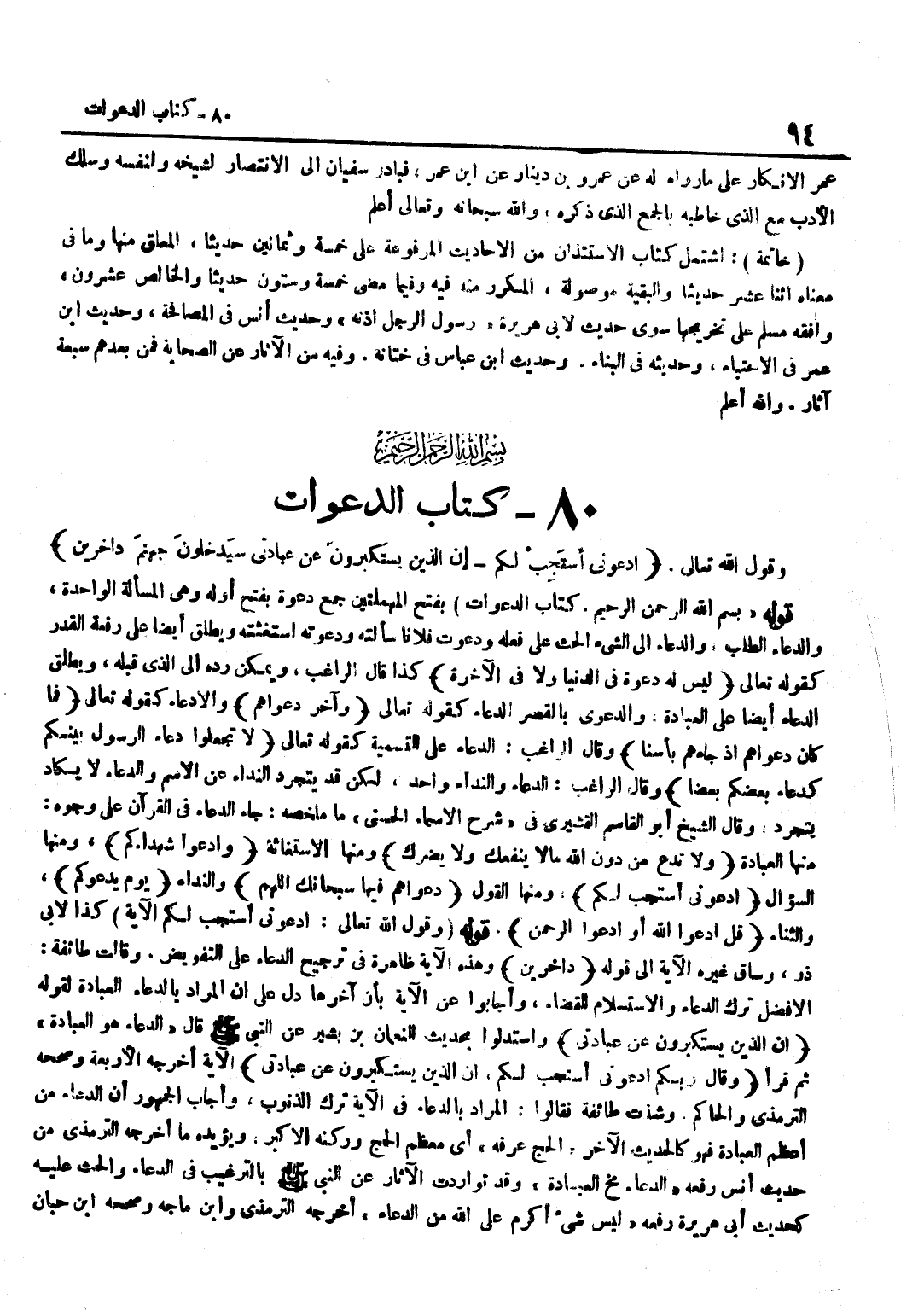 بِفَتْحِ الْمُهْمَلَتَيْنِ جَمْعُ دَعْوَةٍ بِفَتْحِ أَوَّلِهِ وَهِيَ الْمَسْأَلَةُ الْوَاحِدَةُ وَالدُّعَاءُ الطَّلَبُ وَالدُّعَاءُ إِلَى الشَّيْءِ الْحَثُّ عَلَى فِعْلِهِ وَدَعَوْتُ فُلَانًا سَأَلْتُهُ وَدَعَوْتُهُ اسْتَغَثْتُهُ وَيُطْلَقُ أَيْضًا عَلَى رِفْعَةِ الْقَدْرِ كَقَوْلِهِ تَعَالَى لَيْسَ لَهُ دَعْوَةٌ فِي الدُّنْيَا وَلَا فِي الْآخِرَة كَذَا قَالَ الرَّاغِبُ وَيُمْكِنُ رَدُّهُ إِلَى الَّذِي قَبْلَهُ وَيُطْلَقُ الدُّعَاءُ أَيْضًا عَلَى الْعِبَادَةِ وَالدَّعْوَى بِالْقصرِ الدُّعَاء كَقَوْلِه تَعَالَى وَآخر دَعوَاهُم وَالِادِّعَاءُ كَقَوْلِهِ تَعَالَى فَمَا كَانَ دَعْوَاهُمْ إِذْ جَاءَهُم بأسنا وَقَالَ الرَّاغِبُ الدُّعَاءُ عَلَى التَّسْمِيَةِ كَقَوْلِهِ تَعَالَى لَا تَجْعَلُوا دُعَاءَ الرَّسُولِ بَيْنَكُمْ كَدُعَاءِ بَعْضِكُمْ بَعْضًا وَقَالَ الرَّاغِبُ الدُّعَاءُ وَالنِّدَاءُ وَاحِدٌ لَكِنْ قَدْ يَتَجَرَّدُ النِّدَاءُ عَنْ الِاسْمِ وَالدُّعَاءُ لَا يَكَادُ يَتَجَرَّدُ وَقَالَ الشَّيْخُ أَبُو الْقَاسِمِ الْقُشَيْرِيُّ فِي شَرْحِ الْأَسْمَاءِ الْحُسْنَى مَا مُلَخَّصُهُ جَاءَ الدُّعَاءُ فِي الْقُرْآنِ عَلَى وُجُوهٍ مِنْهَا الْعِبَادَةُ وَلَا تدع من دون الله مَالا ينفعك وَلَا يَضرك وَمِنْهَا الاستغاثة وَادعوا شهداءكم وَمِنْهَا السُّؤَال ادْعُونِي استجب لكم وَمِنْهَا القَوْل دَعوَاهُم فِيهَا سُبْحَانَكَ اللَّهُمَّ والنداء يَوْم يدعوكم وَالثَّنَاءُ قُلِ ادْعُوا اللَّهَ أَوِ ادْعُوا الرَّحْمَنَ قَوْلُهُ وَقَوْلُ اللَّهِ تَعَالَى ادْعُونِي أَسْتَجِبْ لَكُمْ الْآيَةِ كَذَا لِأَبِي ذَرٍّ وَسَاقَ غَيْرُهُ الْآيَةَ إِلَى قَوْله داخرين وَهَذِهِ الْآيَةُ ظَاهِرَةٌ فِي تَرْجِيحِ الدُّعَاءِ عَلَى التَّفْوِيضِ وَقَالَتْ طَائِفَةٌ الْأَفْضَلُ تَرْكُ الدُّعَاءِ وَالِاسْتِسْلَامُ لِلْقَضَاءِ وَأَجَابُوا عَنِ الْآيَةِ بِأَنَّ آخِرَهَا دَلَّ عَلَى أَنَّ الْمُرَادَ بِالدُّعَاءِ الْعِبَادَةُ لِقَوْلِهِ إِنَّ الَّذين يَسْتَكْبِرُونَ عَن عبادتي وَاسْتَدَلُّوا بِحَدِيثِ النُّعْمَانِ بْنِ بَشِيرٍ عَنِ النَّبِيِّ صَلَّى اللَّهُ عَلَيْهِ وَسَلَّمَ قَالَ الدُّعَاءُ هُوَ الْعِبَادَةُ ثُمَّ قَرَأَ وَقَالَ رَبُّكُمُ ادْعُونِي أَسْتَجِبْ لكم ان الَّذين يَسْتَكْبِرُونَ عَن عبادتي الْآيَةَ أَخْرَجَهُ الْأَرْبَعَةُ وَصَحَّحَهُ التِّرْمِذِيُّ وَالْحَاكِمُ وَشَذَّتْ طَائِفَةٌ فَقَالُوا الْمُرَادُ بِالدُّعَاءِ فِي الْآيَةِ تَرْكُ الذُّنُوبِ وَأَجَابَ الْجُمْهُورُ أَنَّ الدُّعَاءَ مِنْ أَعْظَمِ الْعِبَادَةِ فَهُوَ كَالْحَدِيثِ الْآخَرِ الْحَجُّ عَرَفَةُ أَيْ مُعْظَمُ الْحَجِّ وَرُكْنُهُ الْأَكْبَرُ وَيُؤَيِّدُهُ مَا أَخْرَجَهُ التِّرْمِذِيُّ مِنْ حَدِيثِ أَنَسٍ رَفَعَهُ الدُّعَاءُ مُخُّ الْعِبَادَةِ وَقَدْ تَوَارَدَتِ الْآثَارُ عَنِ النَّبِيِّ صَلَّى اللَّهُ عَلَيْهِ وَسَلَّمَ بِالتَّرْغِيبِ فِي الدُّعَاءِ وَالْحَثِّ عَلَيْهِ كَحَدِيثِ أَبِي هُرَيْرَةَ رَفَعَهُ لَيْسَ شَيْءٌ أَكْرَمَ عَلَى اللَّهِ مِنَ الدُّعَاءِ أَخْرَجَهُ التِّرْمِذِيُّ وبن ماجة وَصَححهُ بن حبَان