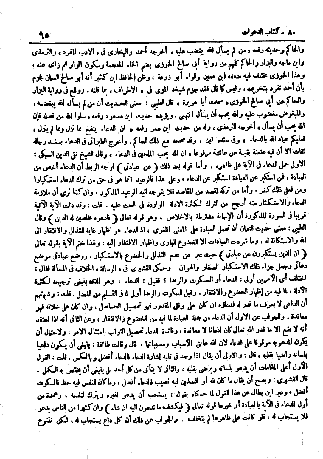 وَالْحَاكِمُ وَحَدِيثُهُ رَفَعَهُ مَنْ لَمْ يَسْأَلِ اللَّهَ يَغْضَبْ عَلَيْهِ أَخْرَجَهُ أَحْمَدُ وَالْبُخَارِيُّ فِي الْأَدَبِ الْمُفْرد وَالتِّرْمِذِيّ وبن مَاجَهْ وَالْبَزَّارُ وَالْحَاكِمُ كُلُّهُمْ مِنْ رِوَايَةِ أَبِي صَالِحٍ الْخُوزِيِّ بِضَمِّ الْخَاءِ الْمُعْجَمَةِ وَسُكُونِ الْوَاوِ ثُمَّ زَايٍ عَنْهُ وَهَذَا الْخُوزِيُّ مُخْتَلَفٌ فِيهِ ضعفه بن مَعِينٍ وَقَوَّاهُ أَبُو زُرْعَةَ وَظَنَّ الْحَافِظُ بْنُ كَثِيرٍ أَنَّهُ أَبُو صَالِحٍ السَّمَّانُ فَجَزَمَ بِأَنَّ أَحْمَدَ تَفَرَّدَ بِتَخْرِيجِهِ وَلَيْسَ كَمَا قَالَ فَقَدْ جَزَمَ شَيْخُهُ الْمِزِّيُّ فِي الْأَطْرَافِ بِمَا قُلْتُهُ وَوَقَعَ فِي رِوَايَةِ الْبَزَّارِ وَالْحَاكِمِ عَنْ أَبِي صَالِحٍ الْخُوزِيِّ سَمِعْتُ أَبَا هُرَيْرَةَ قَالَ الطِّيبِيُّ مَعْنَى الْحَدِيثِ أَنَّ مَنْ لَمْ يَسْأَلِ اللَّهَ يُبْغِضْهُ وَالْمَبْغُوضُ مَغْضُوبٌ عَلَيْهِ وَاللَّهُ يُحِبُّ أَنْ يسْأَل انْتهى وَيُؤَيِّدهُ حَدِيث بن مَسْعُودٍ رَفَعَهُ سَلُوا اللَّهَ مِنْ فَضْلِهِ فَإِنَّ اللَّهَ يُحِبُّ أَنْ يُسْأَلَ أَخْرَجَهُ التِّرْمِذِيُّ وَلَهُ من حَدِيث بن عُمَرَ رَفَعَهُ إِنَّ الدُّعَاءَ يَنْفَعُ مِمَّا نَزَلَ وَمِمَّا لَمْ يَنْزِلْ فَعَلَيْكُمْ عِبَادَ اللَّهِ بِالدُّعَاءِ وَفِي سَنَدِهِ لِينٌ وَقَدْ صَحَّحَهُ مَعَ ذَلِكَ الْحَاكِمُ وَأَخْرَجَ الطَّبَرَانِيُّ فِي الدُّعَاءُ بِسَنَدٍ رِجَالُهُ ثِقَاتٌ إِلَّا أَنَّ فِيهِ عَنْعَنَةَ بَقِيَّةٍ عَنْ عَائِشَةَ مَرْفُوعًا إِنَّ اللَّهَ يُحِبُّ الْمُلِحِّينَ فِي الدُّعَاءِ وَقَالَ الشَّيْخُ تَقِيُّ الدِّينِ السُّبْكِيُّ الْأَوْلَى حَمْلُ الدُّعَاءِ فِي الْآيَةِ عَلَى ظَاهِرِهِ وَأَمَّا قَوْله بعد ذَلِك عَن عبادتي فَوَجْهُ الرَّبْطِ أَنَّ الدُّعَاءَ أَخَصُّ مِنَ الْعِبَادَةِ فَمَنِ اسْتَكْبَرَ عَنِ الْعِبَادَةِ اسْتَكْبَرَ عَنِ الدُّعَاءِ وَعَلَى هَذَا فَالْوَعِيدُ إِنَّمَا هُوَ فِي حَقِّ مَنْ تَرَكَ الدُّعَاءَ اسْتِكْبَارًا وَمَنْ فَعَلَ ذَلِكَ كَفَرَ وَأَمَّا مَنْ تَرَكَهُ لِمَقْصَدٍ مِنَ الْمَقَاصِدِ فَلَا يَتَوَجَّهُ إِلَيْهِ الْوَعِيدُ الْمَذْكُورُ وَإِنْ كُنَّا نَرَى أَنَّ مُلَازَمَةَ الدُّعَاءِ وَالِاسْتِكْثَارَ مِنْهُ أَرْجَحُ مِنَ التَّرْكِ لِكَثْرَةِ الْأَدِلَّةِ الْوَارِدَةِ فِي الْحَثِّ عَلَيْهِ قُلْتُ وَقَدْ دَلَّتِ الْآيَةُ الْآتِيَةُ قَرِيبًا فِي السُّورَةِ الْمَذْكُورَةِ أَنَّ الْإِجَابَةَ مُشْتَرَطَةٌ بِالْإِخْلَاصِ وَهُوَ قَوْلُهُ تَعَالَى فَادْعُوهُ مُخْلِصِينَ لَهُ الدِّينَ وَقَالَ الطِّيبِيُّ مَعْنَى حَدِيثِ النُّعْمَانِ أَنْ تُحْمَلَ الْعِبَادَةُ عَلَى الْمَعْنَى اللُّغَوِيِّ إِذِ الدُّعَاءُ هُوَ إِظْهَارُ غَايَةِ التَّذَلُّلِ وَالِافْتِقَارُ إِلَى اللَّهِ وَالِاسْتِكَانَةُ لَهُ وَمَا شُرِعَتِ الْعِبَادَاتُ إِلَّا لِلْخُضُوعِ لِلْبَارِي وَإِظْهَارِ الِافْتِقَارِ إِلَيْهِ وَلِهَذَا خَتَمَ الْآيَةَ بِقَوْلِهِ تَعَالَى ان الَّذين يَسْتَكْبِرُونَ عَن عبادتي حَيْثُ عَبَّرَ عَنْ عَدَمِ التَّذَلُّلِ وَالْخُضُوعِ بِالِاسْتِكْبَارِ وَوَضَعَ عِبَادَتِي مَوْضِعَ دُعَائِي وَجَعَلَ جَزَاءَ ذَلِكَ الِاسْتِكْبَارِ الصَّغَارُ وَالْهَوَانُ وَحَكَى الْقُشَيْرِيُّ فِي الرِّسَالَةِ الْخِلَافَ فِي الْمَسْأَلَةِ فَقَالَ اخْتُلِفَ أَيُّ الْأَمْرَيْنِ أَوْلَى الدُّعَاءُ أَوِ السُّكُوتُ وَالرِّضَا فَقِيلَ الدُّعَاءُ وَهُوَ الَّذِي يَنْبَغِي تَرْجِيحُهُ لِكَثْرَةِ الْأَدِلَّةِ لِمَا فِيهِ مِنْ إِظْهَارِ الْخُضُوعِ وَالِافْتِقَارِ وَقِيلَ السُّكُوتُ وَالرِّضَا أَوْلَى لِمَا فِي التَّسْلِيمِ مِنَ الْفَضْلِ قُلْتُ وَشُبْهَتُهُمْ أَنَّ الدَّاعِيَ ل
