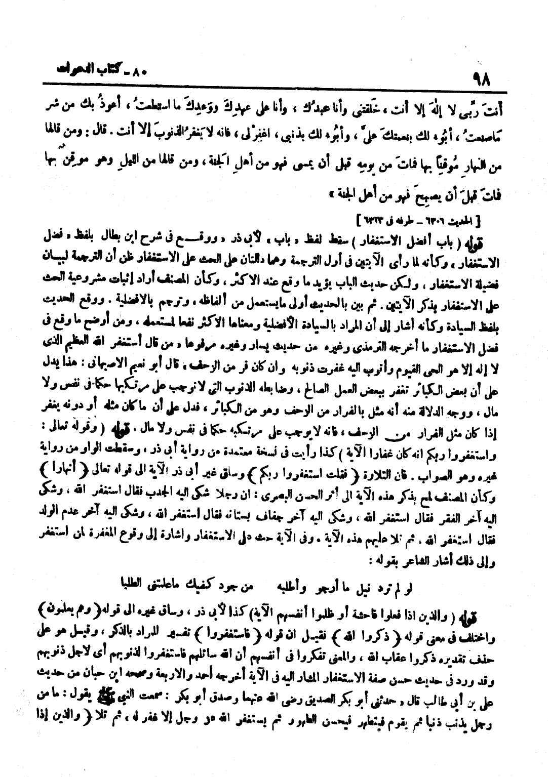 سَقَطَ لَفْظُ بَابُ لأبي ذَر وَوَقع فِي شرح بن بَطَّالٍ بِلَفْظِ فَضْلُ الِاسْتِغْفَارِ وَكَأَنَّهُ لَمَّا رَأَى الْآيَتَيْنِ فِي أَوَّلِ التَّرْجَمَةِ وَهُمَا دَالَّتَانِ عَلَى الْحَثِّ عَلَى الِاسْتِغْفَارِ ظَنَّ أَنَّ التَّرْجَمَةَ لِبَيَانِ فَضِيلَةِ الِاسْتِغْفَارِ وَلَكِنَّ حَدِيثَ الْبَابِ يُؤَيِّدُ مَا وَقَعَ عِنْدَ الْأَكْثَرِ وَكَأَنَّ الْمُصَنِّفَ أَرَادَ إِثْبَاتَ مَشْرُوعِيَّةِ الْحَثِّ عَلَى الِاسْتِغْفَارِ بِذِكْرِ الْآيَتَيْنِ ثُمَّ بَيَّنَ بِالْحَدِيثِ أَوْلَى مَا يُسْتَعْمَلُ مِنْ أَلْفَاظِهِ وَتَرْجَمَ بِالْأَفْضَلِيَّةِ وَوَقَعَ الْحَدِيثُ بِلَفْظِ السِّيَادَةِ وَكَأَنَّهُ أَشَارَ إِلَى أَنَّ الْمُرَادَ بِالسِّيَادَةِ الْأَفْضَلِيَّةُ وَمَعْنَاهَا الْأَكْثَرُ نَفْعًا لِمُسْتَعْمِلِهِ وَمِنْ أَوْضَحِ مَا وَقَعَ فِي فَضْلِ الِاسْتِغْفَارِ مَا أَخْرَجَهُ التِّرْمِذِيُّ وَغَيْرُهُ مِنْ حَدِيثِ يَسَارٍ وَغَيْرِهِ مَرْفُوعًا مَنْ قَالَ أَسْتَغْفِرُ اللَّهَ الْعَظِيمَ الَّذِي لَا إِلَهَ إِلَّا هُوَ الْحَيُّ الْقَيُّومُ وَأَتُوبُ إِلَيْهِ غُفِرَتْ ذُنُوبُهُ وَإِنْ كَانَ فَرَّ مِنَ الزَّحْفِ قَالَ أَبُو نُعَيْمٍ الْأَصْبِهَانِيُّ هَذَا يَدُلُّ عَلَى أَنَّ بَعْضَ الْكَبَائِرِ تُغْفَرُ بِبَعْضِ الْعَمَلِ الصَّالِحِ وَضَابِطُهُ الذُّنُوبُ الَّتِي لَا تُوجِبُ عَلَى مُرْتَكِبِهَا حُكْمًا فِي نَفْسٍ وَلَا مَالٍ وَوَجْهُ الدَّلَالَةِ مِنْهُ أَنَّهُ مَثَّلَ بِالْفِرَارِ مِنَ الزَّحْفِ وَهُوَ مِنَ الْكَبَائِرِ فَدَلَّ عَلَى أَنَّ مَا كَانَ مِثْلَهُ أَوْ دُونَهُ يُغْفَرُ إِذَا كَانَ مِثْلَ الْفِرَارِ مِنَ الزَّحْفِ فَإِنَّهُ لَا يُوجِبُ عَلَى مُرْتَكِبِهِ حُكْمًا فِي نَفْسٍ وَلَا مَالٍ قَوْلُهُ وَقَوْلُهُ تَعَالَى وَاسْتَغْفرُوا ربكُم انه كَانَ غفارًا الْآيَةَ كَذَا رَأَيْتُ فِي نُسْخَةٍ مُعْتَمَدَةٍ مِنْ رِوَايَةِ أَبِي ذَرٍّ وَسَقَطَتِ الْوَاوُ مِنْ رِوَايَةِ غَيْرِهِ وَهُوَ الصَّوَابُ فَإِنَّ التِّلَاوَةَ فَقُلْتُ اسْتَغْفِرُوا ربكُم وَسَاقَ غَيْرُ أَبِي ذَرٍّ الْآيَةَ إِلَى قَوْلِهِ تَعَالَى أَنْهَارًا وَكَأَنَّ الْمُصَنِّفَ لَمَّحَ بِذِكْرِ هَذِهِ الْآيَةِ إِلَى أَثَرِ الْحَسَنِ الْبَصْرِيِّ أَنَّ رَجُلًا شَكَى إِلَيْهِ الْجَدْبَ فَقَالَ اسْتَغْفِرِ اللَّهَ وَشَكَى إِلَيْهِ آخَرُ الْفَقْرَ فَقَالَ اسْتَغْفِرِ اللَّهَ وَشَكَى إِلَيْهِ آخَرُ جَفَافَ بُسْتَانِهِ فَقَالَ اسْتَغْفِرِ اللَّهَ وَشَكَى إِلَيْهِ آخَرُ عَدَمَ الْوَلَدِ فَقَالَ اسْتَغْفِرِ اللَّهَ ثُمَّ تَلَا عَلَيْهِمْ هَذِهِ الْآيَةَ وَفِي الْآيَةِ حَثٌّ عَلَى الِاسْتِغْفَارِ وَإِشَارَةٌ إِلَى وُقُوعِ الْمَغْفِرَةِ لِمَنِ اسْتَغْفَرَ وَإِلَى ذَلِكَ أَشَارَ الشَّاعِرُ بِقَوْلِهِ لَوْ لَمْ تُرِدْ نَيْلَ مَا أَرْجُو وَأَطْلُبُهُ مِنْ جُودِ كَفَّيْكَ مَا عَلَّمْتَنِي الطَّلَبَا قَوْلُهُ وَالَّذِينَ إِذَا فَعَلُوا فَاحِشَةً أَوْ ظَلَمُوا أَنْفُسَهُمْ الْآيَةَ كَذَا لِأَبِي ذَرٍّ وَسَاقَ غَيْرُهُ إِلَى قَوْلِهِ وَهُمْ يَعْلَمُونَ وَاخْتُلِفَ فِي مَعْنَى قَوْلِهِ ذَكَرُوا اللَّهَ فَقِيلَ إِنَّ قَوْلَهُ فَاسْتَغْفَرُوا تَفْسِيرٌ لِلْمُرَادِ بِالذِّكْرِ وَقِيلَ هُوَ عَلَى حَذْفِ تَقْدِيرِهِ ذَكَرُوا عِقَابَ اللَّهِ وَالْمَعْنَى تَفَكَّرُوا فِي أَنْفُسِهِمْ أَنَّ اللَّهَ سَائِلُهُمْ فَاسْتَغْفَرُوا لِذُنُوبِهِمْ أَيْ لِأَجْلِ ذُنُوبِهِمْ وَقَدْ وَرَدَ فِي حَدِيثٍ حَسَنٍ صِفَةُ الِاسْتِغْفَارِ الْمُشَارِ إِلَيْهِ فِي الْآيَةِ أَخْرَجَهُ أَحْمَدُ وَالْأَرْبَعَة وَصَححهُ بن حِبَّانَ مِنْ حَدِيثِ عَلِيِّ بْنِ أَبِي طَالِبٍ قَالَ حَدَّثَنِي أَبُو بَكْرٍ الصِّدِّيقُ رَضِيَ اللَّ