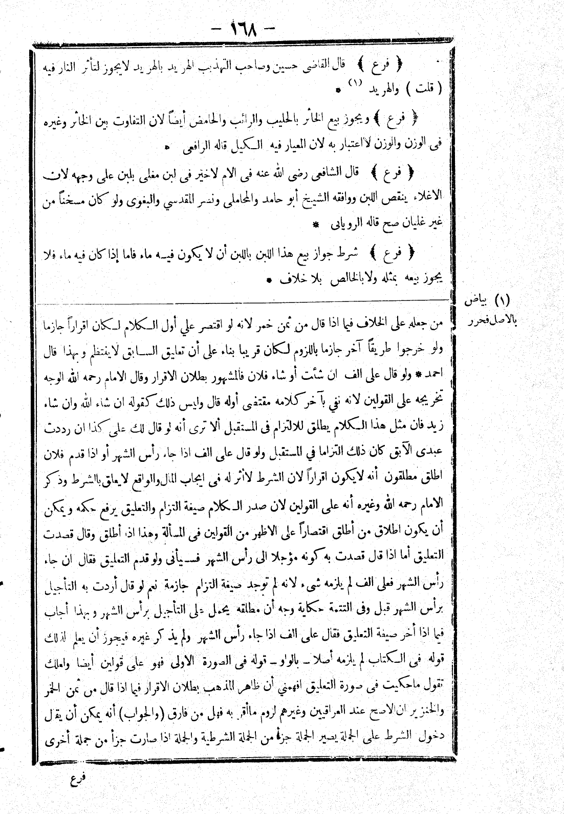 فيما إذا أخر صيغة التعليق فقال على الف إذا جاء رأس الشهر ولم يذكر غيره فيجوز أن يعلم لذلك قوله في الكتاب لم يلزمه أصلا - بالواو - وكذا قوله في الصورة الاولى فهو على قولين أيضا ولعلك تقول ما حكيت في صورة التعليق افهمني أن ظاهر المذهب بطلان الاقرار فيما إذا قال من ثمن الخمر والخنزير ان الاصح عند العراقيين وغيرهم لزوم ما أقر به فهل من فارق (والجواب) أنه يمكن أن يقال دخول الشرط على الجملة يصير الجملة جزأ من الجملة الشرطية والجملة إذا صارت جزأ من جملة أخرى