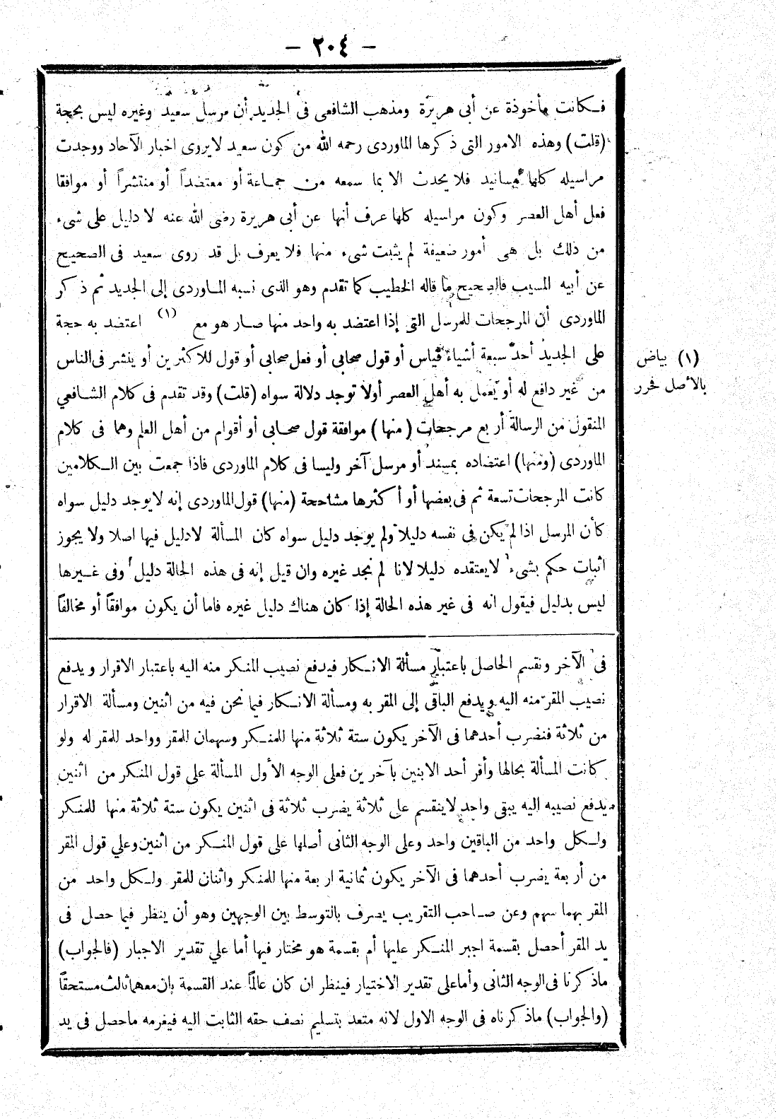في الآخر ونقسم الحاصل باعتبار مسألة الانكار فيدفع نصيب المنكر منه إليه باعتبار الاقرار ويدفع نصيب المقر منه إليه ويدفع الباقي إلى المقر به ومسألة الانكار فيما نحن فيه من اثنين ومسألة الاقرار من ثلاثة فنضرب أحدهما في الآخر يكون ستة ثلاثة منها للمنكر وسهمان للمقر وواحد للمقر له ولو كانت المسألة بحالها وأقر أحد الابنين بآخرين فعلى الوجه الاول المسألة على قول المنكر من اثنين يدفع نصيبه إليه يبقى واحد لا ينقسم على ثلاثة يضرب ثلاثة في اثنين يكون ستة ثلاث منها للمنكر ولكل واحد من الباقين واحد وعلى الوجه الثاني أصلها على قول المنكر من اثنين وعلى قول المقر من أربعة يضرب أحدهما في الآخر يكون ثمانية اربعة منها للمنكر واثنان للمقر ولكل واحد من المقر بهما سهم وعن صاحب التقريب يصرف بالتوسط بين الوجهين وهو أن ينظر فيما حصل في يد المقر أحصل بقسمة اجبر المنكر عليها أم بقسمة وهو مختار فيها أما على تقدير الاجبار (فالجواب) ما ذكرنا في الوجه الثاني وأما على تقدير الاختيار فينظر ان كان عالما عند القسمة بان معهما ثالث مستحقا (والجواب) ما ذكرناه في الوجه الاول لانه معتد بتسليم نصف حقه الثابت إليه فيغرمه ما حصل في يد