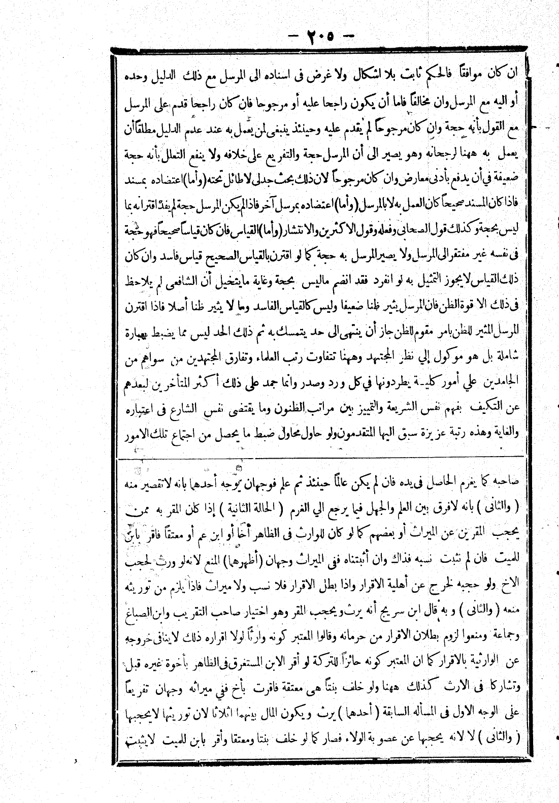صاحبه كما يغرم الحاصل في يده فان لم يكن عالما حينئذ ثم علم فوجهان يوجه أحدهما بانه لا تقصير منه (والثانى) بانه لافرق بين العلم والجهل فيما يرجع الي الغرم (الحالة الثانية) إذا كان المقر به ممن يحجب المقرين عن الميراث أو بعضهم كما لو كان للوارث في الظاهر أخا أو ابن عم أو معتقا فاقر بابن للميت فان لم نثبت نسبة فذاك وان أثبتناه ففى الميراث وجهان (أظهرهما) المنع لانه لو ورث لحجب الاخ ولو حجبه لخرج عن أهلية الاقرار وإذا بطل الاقرار فلا نسب ولا ميراث فإذا يلزم من توريثه منعه (والثاني) وبه قال ابن سريج أنه يرث ويحجب المقر وهو اختيار صاحب التقريب وابن الصباغ وجماعة ومنعوا لزوم بطلان الاقرار من حرمانه وقالوا المعتبر كونه وارثا لولا اقراره ذلك لا ينافي خروجه عن الوارثية بالاقرار كما أن المعتبر كونه حائزا للتركه لو أقر الابن المستغرق في الظاهر بأخوة غيره قبل وتشاركا في الارث كذلك ههنا ولو خلف بنتا هي مقتنعة فاقرت بأخ ففي ميراثه وجهان تفريعا على الوجه الاول في المسألة (أحدهما) يرث ويكون المال بينهما اثلاثا لان توريثها لا يحجبها (والثانى) لا لانه عن عصوبة الولاء فصار كما لو خلف بنتا ومعتقا وأقر بابن للميت لا يثبت