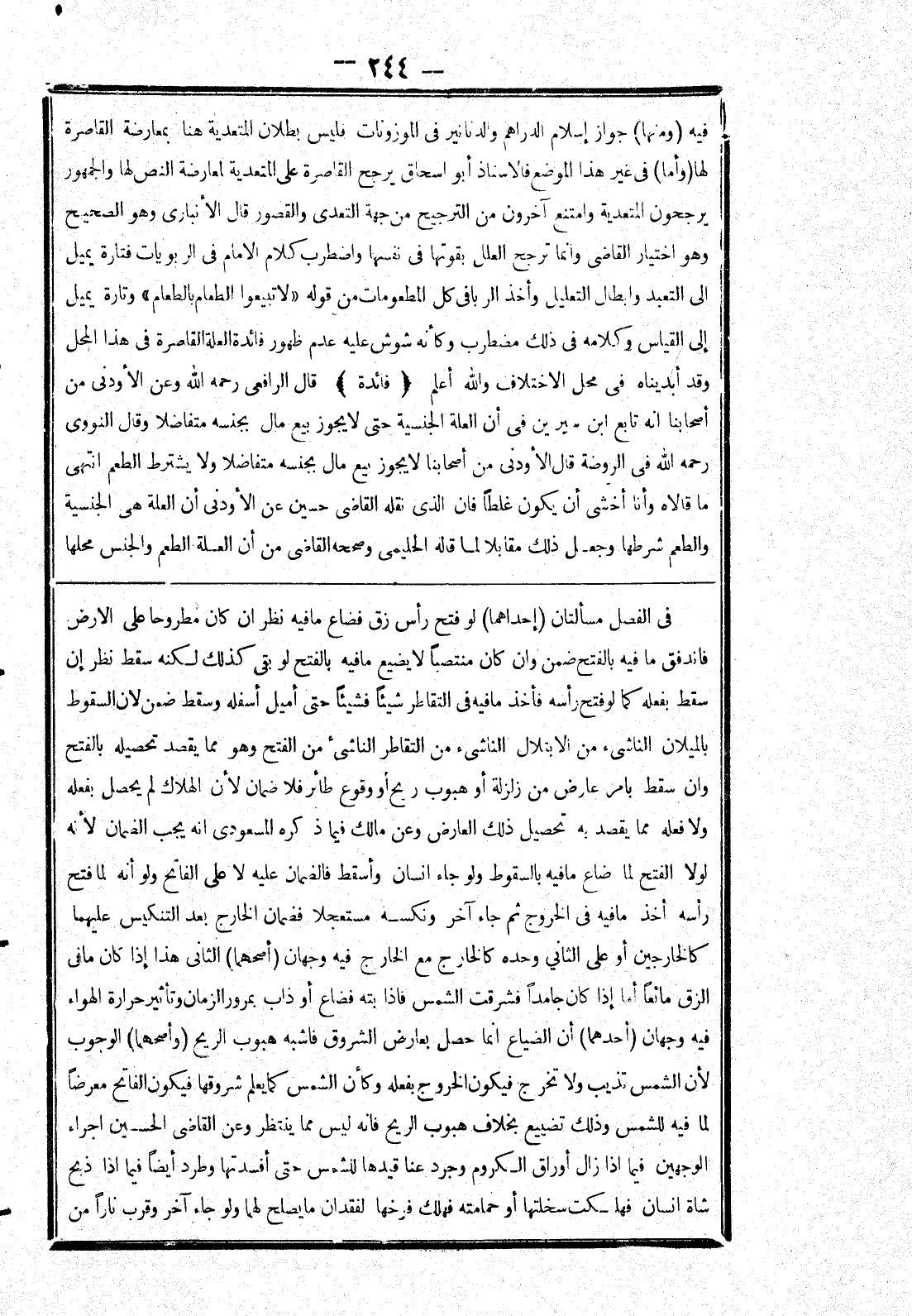 في الفصل مسألتان (إحداهما) لو فتح رأس زق فضاع ما فيه نظر ان كان مطروحا على الارض فاندفق ما فيه بالفتح ضمن وان كان منتصبا لا يضيع ما فيه بالفتح لو بقى كذلك لكنه سقط نظر إن سقط بفعله كما لو فتح رأسه فأخذ ما فيه في التقاطر شيئا فشيئا حتى أميل أسفله وسقط ضمن لان السقوط بالميلان الناشئ من الابتلال الناشئ من التقاطر الناشئ من الفتح وهو مما يقصد تحصيله بالفتح وان سقط بامر عارض من زلزلة أو هبوب ريح أو وقوع طائر فلا ضمان لان الهلاك لم يحصل بفعله ولا فعله مما يقصد به تحصيل ذلك العارض وعن مالك فيما ذكره المسعودي انه يجب الضمان لانه لولا الفتح لما ضاع ما فيه بالسقوط ولو جاء انسان وأسقط فالضمان عليه لا على الفاتح ولو أنه لما فتح رأسه أخذ ما فيه في الخروج ثم جاء آخر ونكسه مستعجلا فضمان الخارج بعد التنكيس عليهما كالخارجين أو على الثاني وحده كالخارج مع الخارج فيه وجهان (أصحهما) الثاني هذا إذا كان ما في الزق مائعا أما إذا كان جامدا فشرقت الشمس فاذابته فضاع أو ذاب بمرور الزمان وتأثير حرارة الهواء فيه وجهان (أحدهما) أن الضياع انما حصل بعارض الشروق فاشبه هبوب الريح (وأصحهما) الوجوب لان الشمس تذيب ولا تخرج فيكون الخروج بفعله وكأن الشمس كما يعلم شروقها فيكون الفاتح معرضا لما فيه للشمس وذلك تضييع بخلاف هبوب الريح فانه ليس مما ينتظر وعن القاضى الحسين اجراء الوجهين فيما إذا ازال أوراق الكروم وجرد عنا قيدها للشمس حتى أفسدتها وطرد أيضا فيما إذا ذبح شاة انسان فهلكت سخلتها أو حمامته فهلك فرخها لفقدان ما يصلح لهما ولو جاء آخر وقرب نارا من