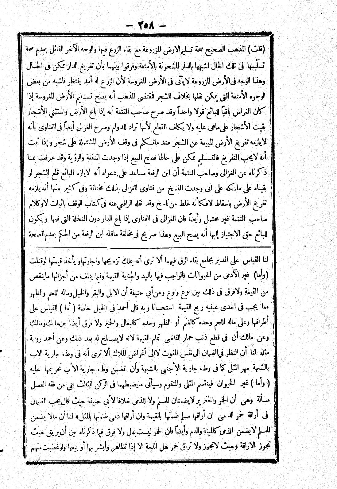 لنا القياس على المدبر بجامع بقاء الرق فيهما ألا ترى أنه يملك تزوجها واجارتها ويأخذ قيمتها لو قتلت (وأما) غير الآدمى من الحيوانات فالواجب فيها باليد والجناية القيمة وفيما يتلف من أجزائها ما ينقص من القيمة ولا فرق في ذلك بين نوع ونوع وعن أبى حنيفة أن الابل والبقر والخيل وماله اللحم والظهر مما يجب في احدى عينيه ربع القيمة استحسانا وبه قال أحمد في الخيل خاصة (أما) القياس على أطرافها وعلى ماله اللحم وحده كالغنم أو الظهر وحده كالبغال والحمير ولا فرق أيضا بين مالك ومالك وعن مالك أن في قطع ذنب حمار القاضى تمام القيمة لانه لا يصلح له بعد ذلك وعن أحمد رواية مثله لنا أن النظر في الضمان إلى نفس المفوت لاإلى أغراض الملاك ألا ترى أنه في وطئ جارية الاب بالشبهة مهر المثل كما في وطئ جارية الأجنبي بالشبهة وأن تضمن وطئ جارية الاب تحريمها عليه (وأما) غير الحيوان فينقسم المثلى والمتقوم وسيأتى ما يضبطهما في الركن الثالث بقى من فقه الفصل مسألة وهى ان الخمر والخنزير لا يضمنان للمسلم ولا للذمي خلافا لابي حنيفة حيث قال يجب الضمان في أراقة خمر الذمي ان أراقها مسلم ضمنها بالقيمة وان أراقها ذمي ضمنها بالمثل.