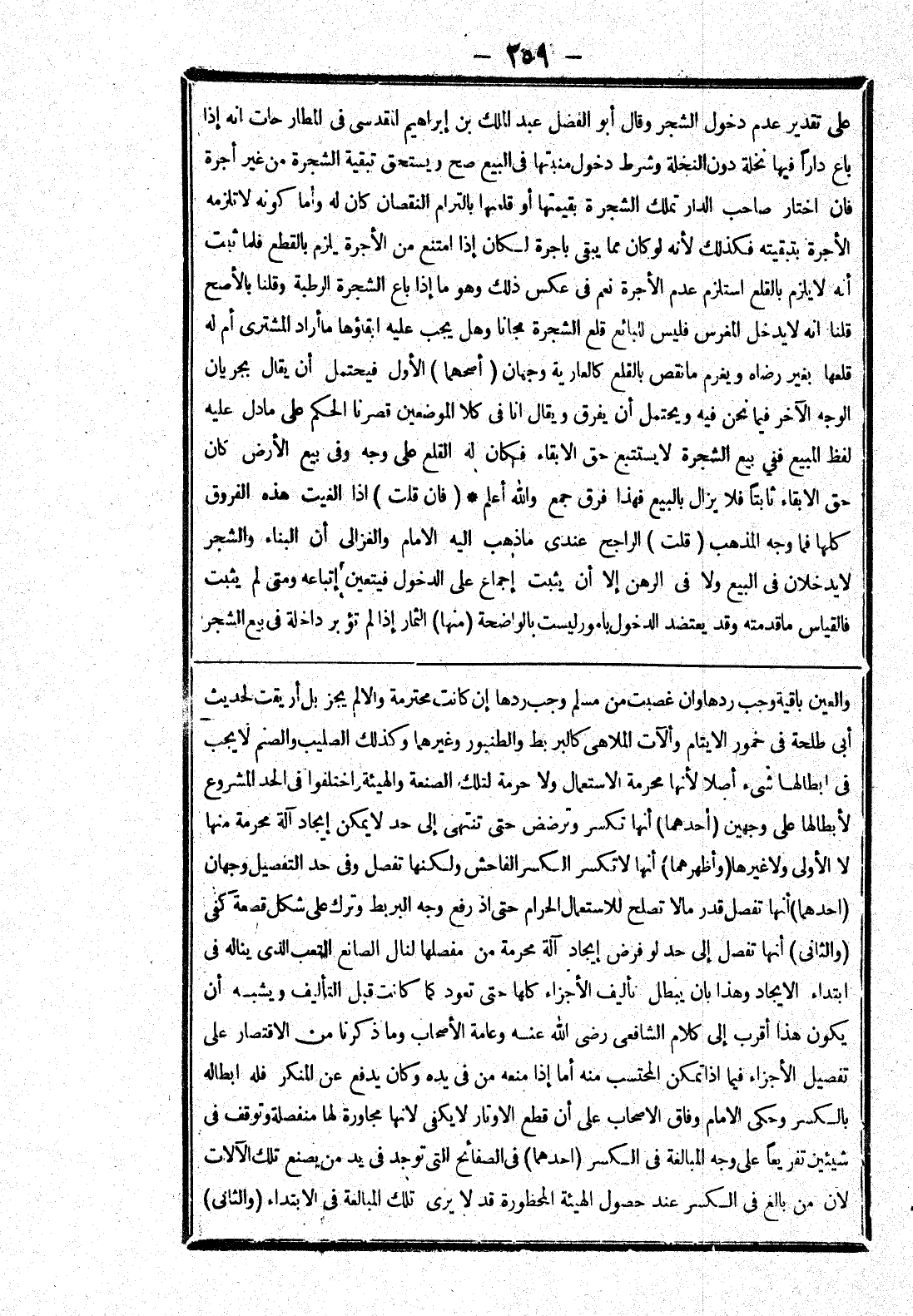 (والثانى) أنها تفصل إلى حد لو فرض إيجاد آلة محرمة من مفصلها لنال الصانع التعب الذى يناله في ابتداء الايجاد وهذا بان يبطل تأليف الاجزاء كلها حتى تعود كما كانت قبل التأليف ويشبه أن يكون هذا أقرب إلى كلام الشافعي رضى الله عنه وعامة الاصحاب وما ذكرنا من الاقتصار على تفصيل الاجزاء فيما إذا تمكن المحتسب منه أما إذا منعه من في يده وكان يدفع عن المنكر فله ابطاله بالكسر وحكى الامام وفاق الاصحاب على أن قطع الاوتار لا يكفي لانها مجاورة لها منفصلة وتوقف في شيئين تفريعا على وجه المبالغة في الكسر (احدهما) في الصفائح التى لا توجد في يد من تصنع تلك الآلات لان من البالغ في الكسر عند حصول الهيئة المحظورة قد لا يرى تلك المبالغة في الابتداء (والثانى)