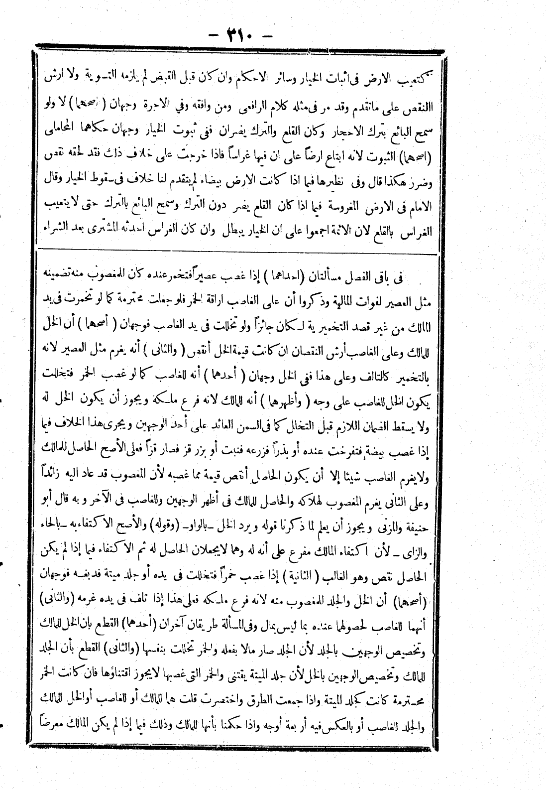 في باقي الفصل مسألتان (احداهما) إذا غصب عصيرا فتخمر عنده كان للمغصوب منه تضمينه مثل ما لعصير لفوات المالية وذكروا أن على الغاصب اراقة الخمر فلو جعلت محترمة كما لو تخمرت في يد المالك من غير قصد التخميرية لكان جائزا ولو تخللت في يد الغاصب فوجهان (أصحهما) أن الخل للمالك وعلى الغاصب أرش النقصان ان كانت قيمة الخل أنقص (والثاني) أنه يغرم مثل العصير لانه بالتخمير كالتالف وعلى هذا ففي الخل وجهان (أحدهما) أنه للغاصب كما لو غصب الخمر فتخللت يكون الخل للغاصب على وجه (وأظهرهما) أنه للمالك لانه فرع ملكه ويجوز أن يكون الخل له ولا يسقط الضمان اللازم قبل التخلل كما في السمن العائد على أحد الوجهين ويجرى هذا الخلاف فيما إذا غصب بيضة فتفرخت عنده أو بذرا فزرعه فنبت أو بزرقز فصار قزا فعلى الاصح الحاصل للمالك ولا يغرم الغاصب شيئا إلا أن يكون الحاصل أنقص قيمة مما عصبه لان المغصوب قد عاد إليه زائدا وعلى الثاني يغرم المغصوب لهلاكه والحاصل للمالك في أظهر الوجهين وللغاصب في الآخر وبه قال أبو حنيفة والمزني ويجوز أن يعلم لما ذكرنا قوله ويرد الخل بالواو (وقوله) والاصح الاكتفاء به بالحاء والزاي لان اكاتفاء المالك مفرع على أنه له وهما لا يجعلان الحاصل له ثم الاكتفاء فيما إذا لم يكن الحاصل نقص وهو الغالب (الثانية) إذا غصب خمرا فتخللت في يده أو جلد ميتة فدبغه فوجهان (أصحهما) أن الخل والجلد للمغصوب منه لانه فرع ملكه فعلى هذا إذا تلف في يده غرمه (والثاني) أنهما للغاصب لحصولهما عنده بما ليس بمال وفي المسألة طريقان آخران (أحدهما) القطع بان الخل للمالك وتخصيص الوجهين بالجلد بأن الجلد صار مالا بفعله والخمر تخللت بنفسها (والثاني) القطع بأن الجلد للمالك وتخصيص الوجهين بالخل لان جلد الميتة يقتنى والخمر التي غصبها لا يجوز اقتناؤها فان كانت الخمر محترمة كانت كجلد الميتة وإذا جمعت الطرق واختصرت قلت هما للمالك أو للغاصب أو الخل للمالك والجلد للغاصب أو بالعكس فيه أربعة أوجه وإذا حكمنا بأنها للمالك وذلك فيما إذا لم يكن المالك معرضا