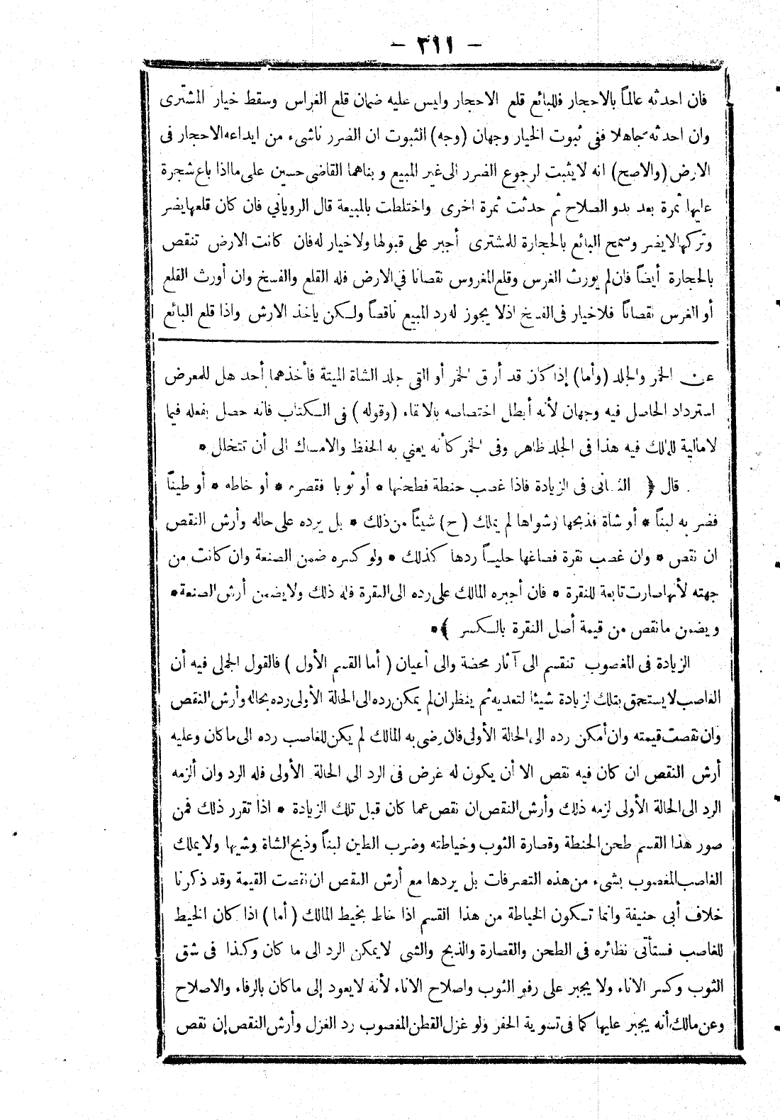إذا تقرر ذلك فمن صور هذا القسم طحن الحنطة وقصارة الثوب وخياطته وضرب الطين لبنا وذبح الشاة وشيها ولا يملك الغاصب المغصوب بشئ من هذه التصرفات بل يردها مع أرش النقص ان نقصت القيمة وقد ذكرنا خلاف أبي حنيفة وانما تكون الخياطة من هذا القسم إذا خاط بخيط المالك (أما) إذا كان الخيط للغاصب فستأتي نظائره في الطحن والقصارة والذبح والشيئ لا يمكن الرد إلى ما كان وكذا في شق الثوب وكسر الاناء ولا يجبر على رفو الثوب واصلاح الاناء لانه لا يعود إلى ما كان بالرفاء والاصلاح وعن مالك أنه يجبر عليها كما في تسوية الحفر ولو غزل القطن المغصوب رد الغزل وأرش النقص إن نقص