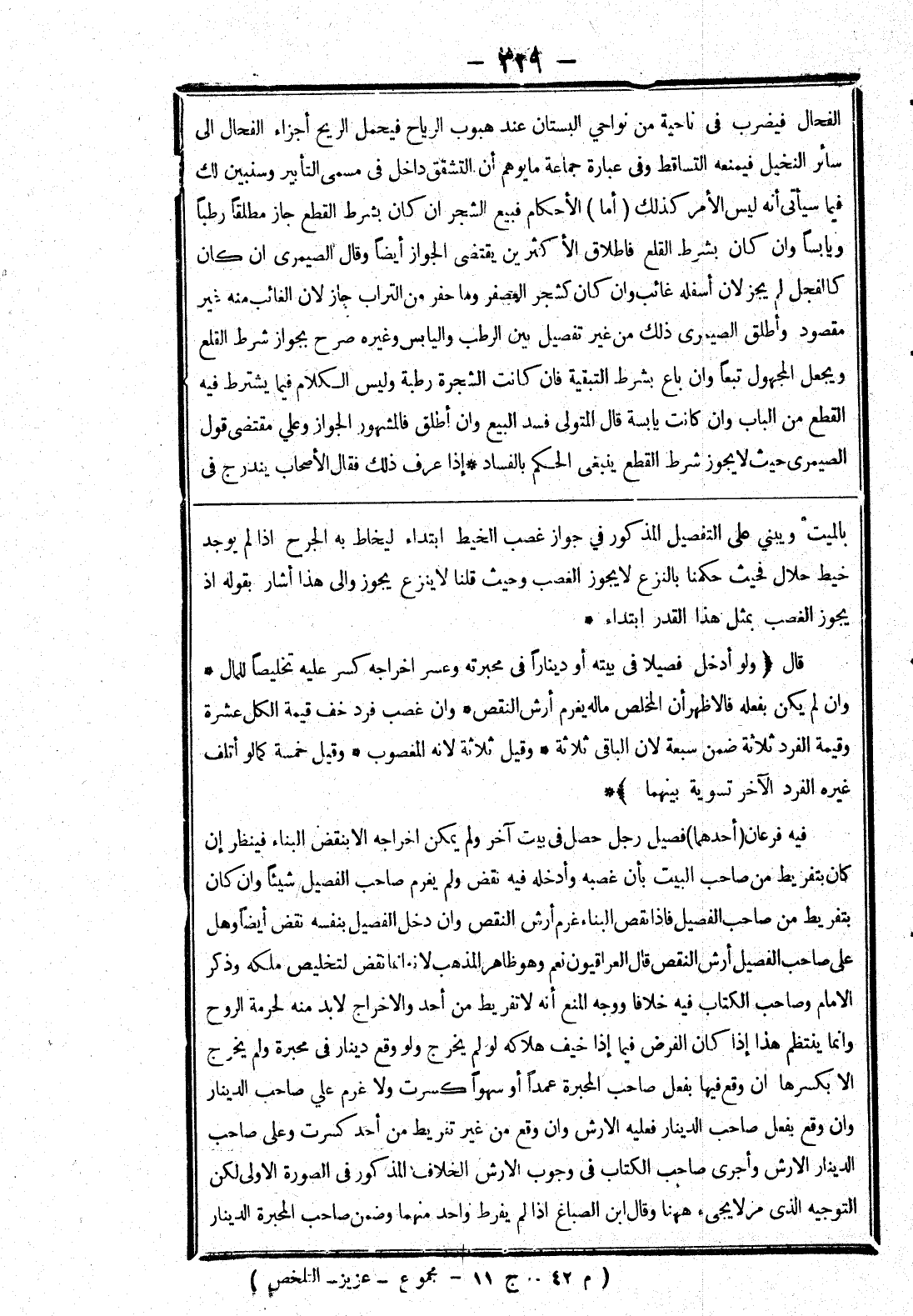 فيه فرعان (أحدهما) فصيل رجل حصل في بيت آخر ولم يمكن اخراجه الا بنقض البناء فينظر إن كان بتفريط من صاحب البيت بأن غصبه وأدخله فيه نقض ولم يغرم صاحب الفصيل شيئا وان كان بتفريط من صاحب الفصيل فإذا نقص البناء غرم أرش النقص وان دخل الفصيل بنفسه نقض أيضا وهل على صاحب الفصيل أرش النقص قال العراقيون نعم وهو ظاهر المذهب لا نه انما نقض لتخليص ملكه وذكر الامام وصاحب الكتاب فيه خلافا ووجه المنع أنه لا تفريط من أحد والاخراج لابد منه لحرمة الروح وانما ينتظم هذا إذا كان الفرض فيما إذا خيف هلاكه لو لم يخرج ولو وقع دينار في محبرة ولم يخرج الا بكسرها ان وقعها فيها بفعل صاحب المحبرة عمدا أو سهوا كسرت ولا غرم على صاحب الدينار وان وقع بفعل صاحب الدينار فعليه الارش وان وقع من غير تفريط من أحد كسرت وعلى صاحب الدينار الارش وأجرى صاحب الكتاب في وجوب الارش الخلاف المذكور في الصورة الاولى لكن التوجيه الذي مر لا يجئ ههنا وقال ابن الصباغ إذا لم يفرط واحد مهنما وضمن صاحب المحبرة الدينار