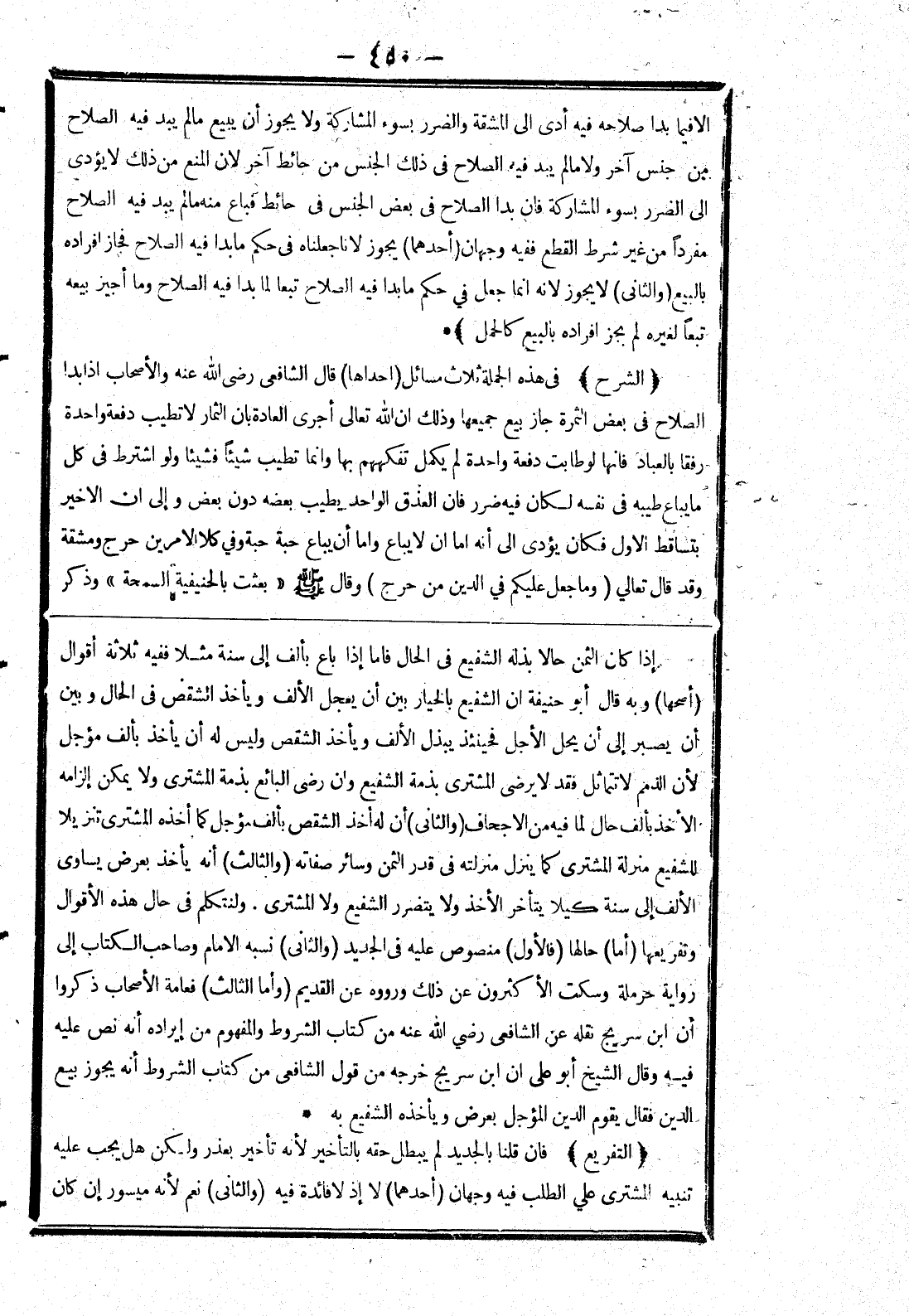 إذا كان الثمن حالا بذله الشفيع في الحال فاما إذا باع بألف إلى سنة مثلا ففيه ثلاثة أقوال (أصحها) وبه قال أبو حنيفة ان الشفيع بالخيار بين أن يعجل الالف ويأخذ الشقص في الحال وبين أن يصبر إلى أن يحل الاجل فحينئذ يبذل الالف ويأخذ الشقص وليس له أن يأخذ بألف مؤجل لان الذهمم لا تتمثل فقد لا يرضي المشترى بذمة الشفيع وان رضى البائع بذمة المشترى ولا يمكن إلزامه لاخذ بألف حال لما فيه من الاجحاف (والثاني) أن له أخذ الشقص بألف مؤجل كما أخذه المشترى تنزيلا للشفيع منزلة المشترى كما ينزل منزلته في قدر الثمن وسائر صفاته (والثالث) أنه يأخذ بعرض يساوى الالف إلى سنة كيلا يتأخر الاخذ ولا يتضرر الشفيع ولا المشترى.