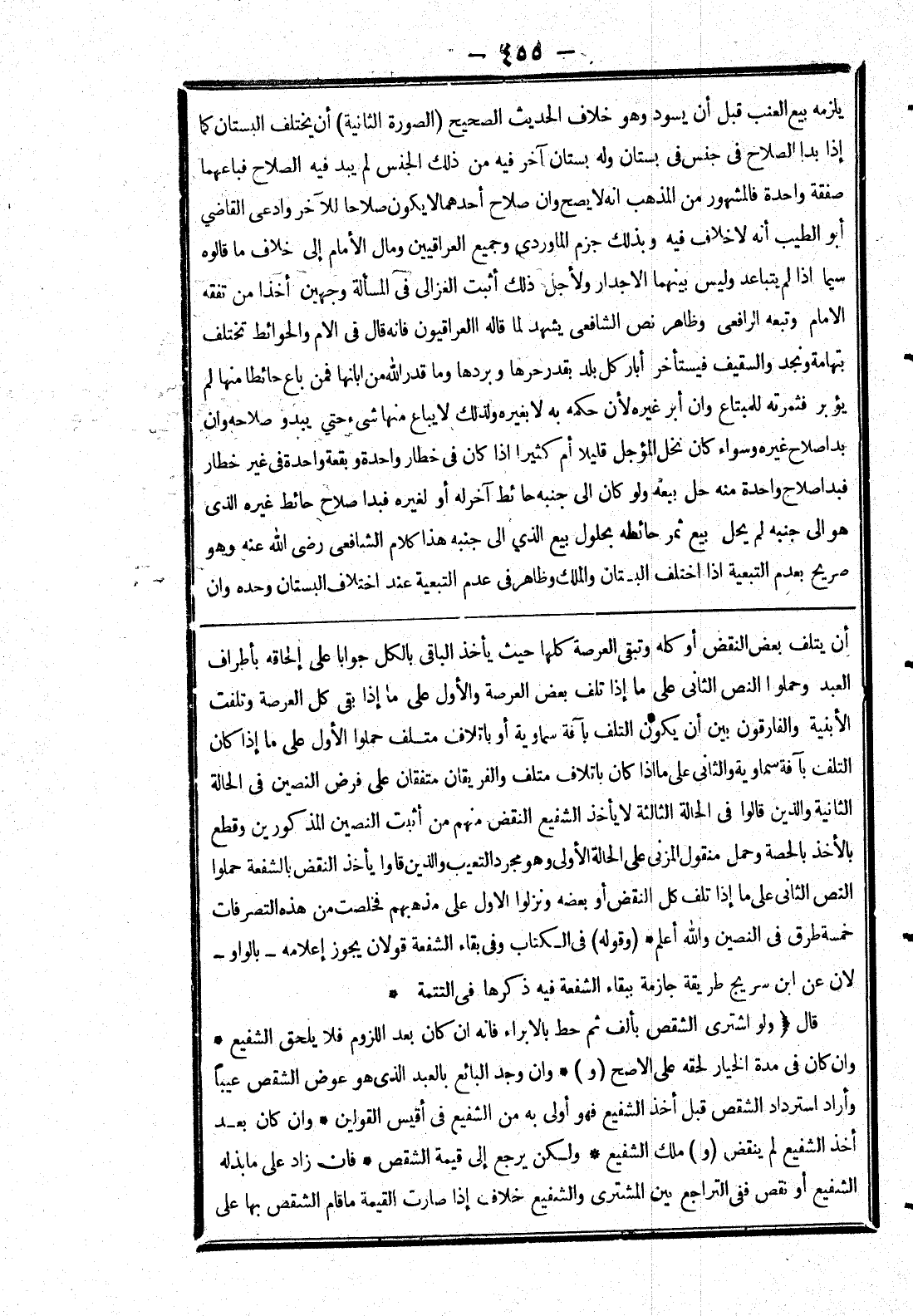 أن يتلف بعض النقض أو كله وتبقي العرصة كلها حيث يأخذ الباقي بالكل جوابا على إلحاقه بأطراف العبد وحملوا النص الثاني على ما إذا تبف بعض العرصة والاول على ما إذا بقى كل العرصة وتلفت الابنية والفارقون بين أن يكون التلف بآفة سماوية أو باتلاف متلف حملوا الاول على ما إذا كان التلف بآفة سماوية والثاني على ما إذا كان باتلاف متلف والفريقان متفقان على فرض النصين في الحالة الثانية والذين قالوا في الحالة الثالثة لا يأخذ الشفيع النقض منهم من أثبت النصين المذكورين وقطع بالاخذ بالحصة وحمل منقول المزني على الحالة الاولى وهو مجرد التعيب والذين قالوا ياخذ النقض بالشفعة حملوا النص الثاني على ما إذا تلف كل النقض أو بعضه ونزلوا الاول على مذهبهم فخلصت من هذه التصرفات خمسة طرق في النصين والله أعلم.
