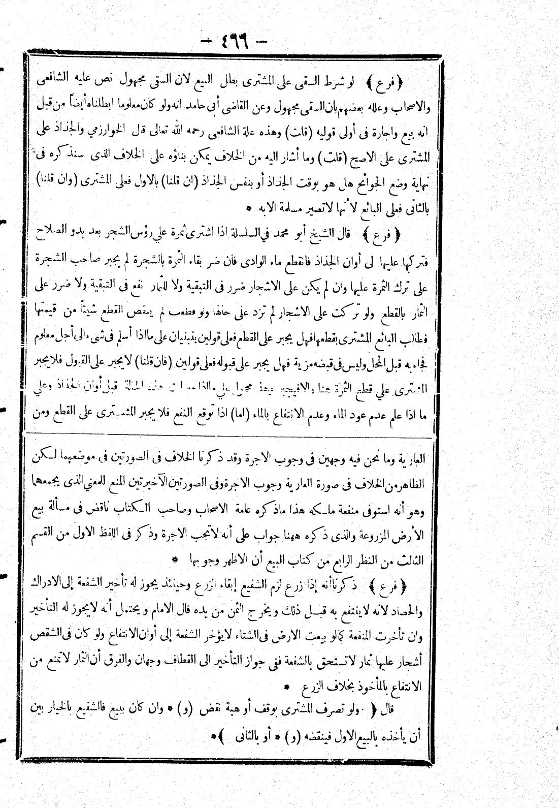 (فرع) ذكرنا أنه إذا زرع لزم الشفيع إبقاء الزرع وحينئذ يجوز له تأخير الشفعة إلى الادراك والحصاد لانه لا ينتفع به قبل ذلك ويخرج الثمن من يده قال الامام ويحتمل أنه لا يجوز له التأخير وان تأخرت المنفعة كما لو بيعت الارض في الشتاء لا يؤخر الشفعة إلى أوان الانتفاع ولو كان في الشقص أشجار عليها ثمار لا تستحق بالشفعة ففي جواز التأخير إلى القطاف وجهان والفرق أن الثمار لا تمنع من الانتفاع بالمأخوذ بخلاف الزرع.