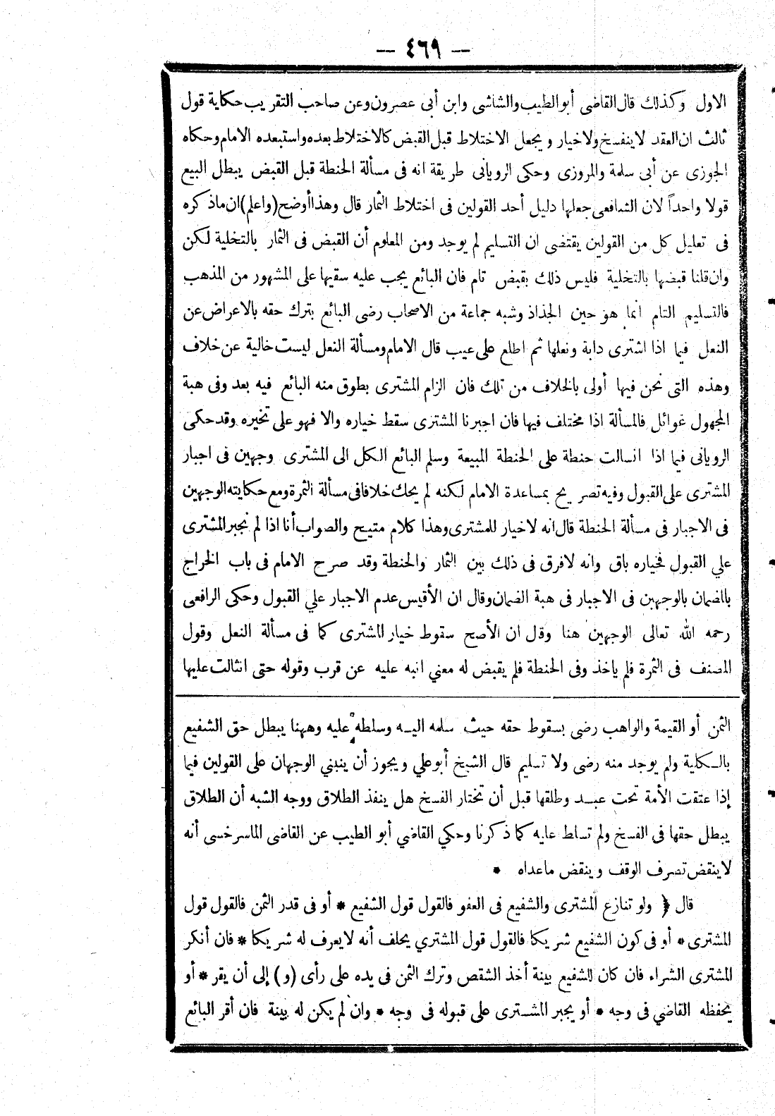 الثمن أو القيمة والواهب رضى بسقوط حقه حيث سلمه إليه وسلطه عليه وههنا يبطل حق الشفيع بالكلية ولم يوجد منه رضى ولا تسليم قال الشيخ أبو علي ويجوز أن ينبغي الوجهان على القولين فيما إذا عتقت الامة تحت عمد وطلقها قبل أن تختار الفسخ هل ينفذ الطلاق ووجه الشبه أن الطلاق يبطل حقها في الفسخ ولم تسلط عليه كما ذكرنا وحكي القاضي أبو الطيب عن القاضي الماسرخسى أنه