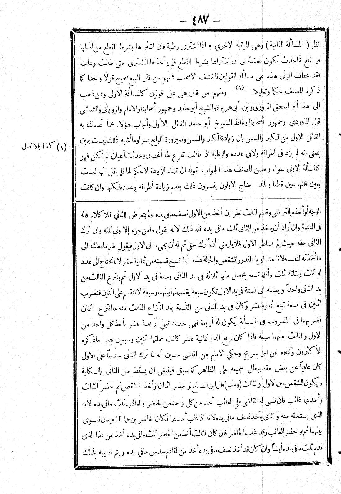 الوجه أو أخذه بالتراضي وقدم الثالث نظر إن أخذ من الاول نصف ما في يده ولم يتعرض للثاني فلا كلام قاله في التتمة وان أراد أن ياخذ من الثاني ثلث ما في يده فله ذلك لانه يقول ما من جزء إلا ولى ثلثه وان ترك الثاني حقه حيث لم يشاطر الاول فلا يلزمني أن أترك حقي ثم له أن يجئ إلى الاول فيقول ضم ما معك إلى ما أخذته لنقسمه لانا متساويا القدر والشقص والحالة هذه انما تصح قسمته من ثمانية عشر لانا نحتاج إلى عدد له ثلث ولثلثه ثلث وأقله تسعة يحصل منها ثلاثة في يد الثاني وستة في يد الاول ثم ينتزع الثالث من يد الثاني واحد ويضمه إلى الستة في يد الاول تكون سبعة يقتسمانها بينهما وسبعة لا تنقسم على اثنين فتضرب اثنين في تسعة تبلغ ثمانية عشر وكان في يد الثاني من التسعة بعد انتزاع الثالث منه ما انتزع اثنان نضربهما في المضروب في المسألة يكون له أربعة فهى حصته تبقى أربعة عشر يأخذ كل واحد من الاول والثالث منهما سبعة فإذا كان ربع الدار ثمانية عشر كانت جملتها اثنين وسبعين هذا ما ذكره الاكثرون ونقلوه عن ابن سريج وحكي الامام عن القاضي حسين أنه لما ترك الثاني سدسا على الاول كان عافيا عن بعض حقه يبطل جميعه على الظاهر كما سبق فينبغي ان يسقط حق الثاني بالكلية ويكون الشقص بين الاول والثالث (ومنها) قال ابن الصباغ لو حضر اثنان وأخذا الشقص ثم حضر الثالث وأحدهما غائب فان قضى له القاضي على الغائب أخذ من كل واحد من الحاضر والغائب ثلث ما في يده لانه الذي يستحقه منه الثاني يأخذ نصف ما في يده لانه إذا غاب أحدهما فكان الحاضرين هما الشفيعان فيسوى بينهما ثم لو حضر الغائب وقد غاب الحاضر فان كان الثالث أخذ من الحاضر ثلث ما في يده أخذ من هذا الذي قدم ثلث ما في يده أيضا وان كان قد أخذ نصف ما في يده أخذ من القادم سدس ما في يده ويتم نصيبه بذلك