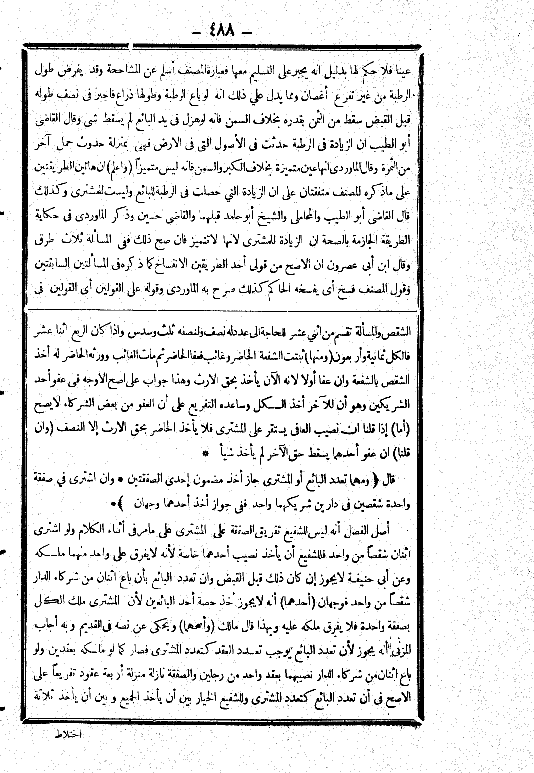الشقص والمسألة تقسم من اثني عشر للحاجة إلى عدد له نصف ولنصفه ثلث وسدس وإذا كان الربع اثنا عشر فالكل ثمانية وأربعون (ومنها) ثبتت الشفعة الحاضر وغائب فعفا الحاضر ثم مات الغائب وورثه الحاضر له أخذ الشقص بالشفعة وان عفا أولا لانه الآن يأخذ بحق الارث وهذا جواب على اصح الاوجه في عفو أحد الشريكين وهو أن للآخر أخذ الكل وساعده التفريع على أن العفو من بعض الشركاء لا يصح (أما) إذا قلنا ان نصيب العافي يستقر على المشترى فلا يأخذ الحاضر بحق الارث إلا النصف (وان قلنا) ان عفو أحدهما يسقط حق الآخر لم يأخذ شيأ.