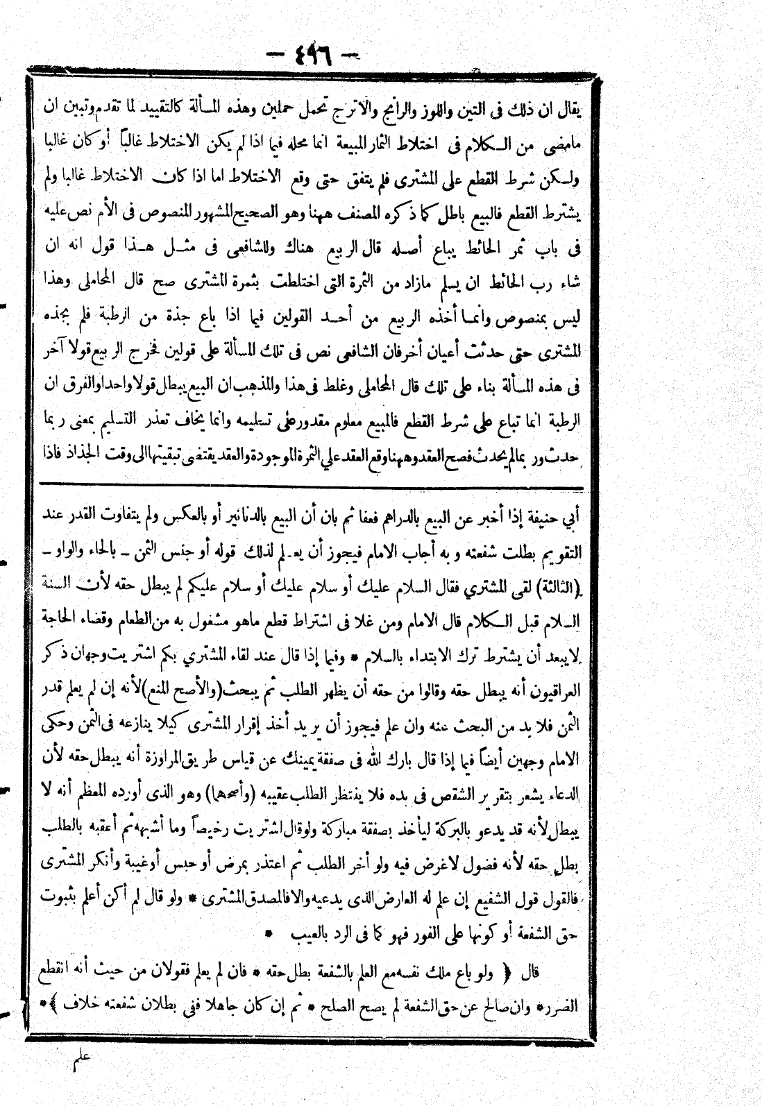 أبي حنيفة إذ أخبر عن البيع بالدراهم فعفا ثم بان أن البيع بالدنانير أو بالعكس ولم يتفاوت القدر عند التقويم بطلت شفعته وبه أجاب الامام فيجوز أن يعلم لذلك قوله أو جنس الثمن بالحاء والواو (الثالثة) لقى المشتري فقال السلام عليك أو سلام عليك أو سلام عليكم لم يبطل حقه لان السنة السلام قبل الكلام قال الامام ومن غلا في اشتراط قطع ما هو مشغول به من الطعام وقضاء الحاجة لا يبعد أن يشترط ترك الابتداء بالسلام.