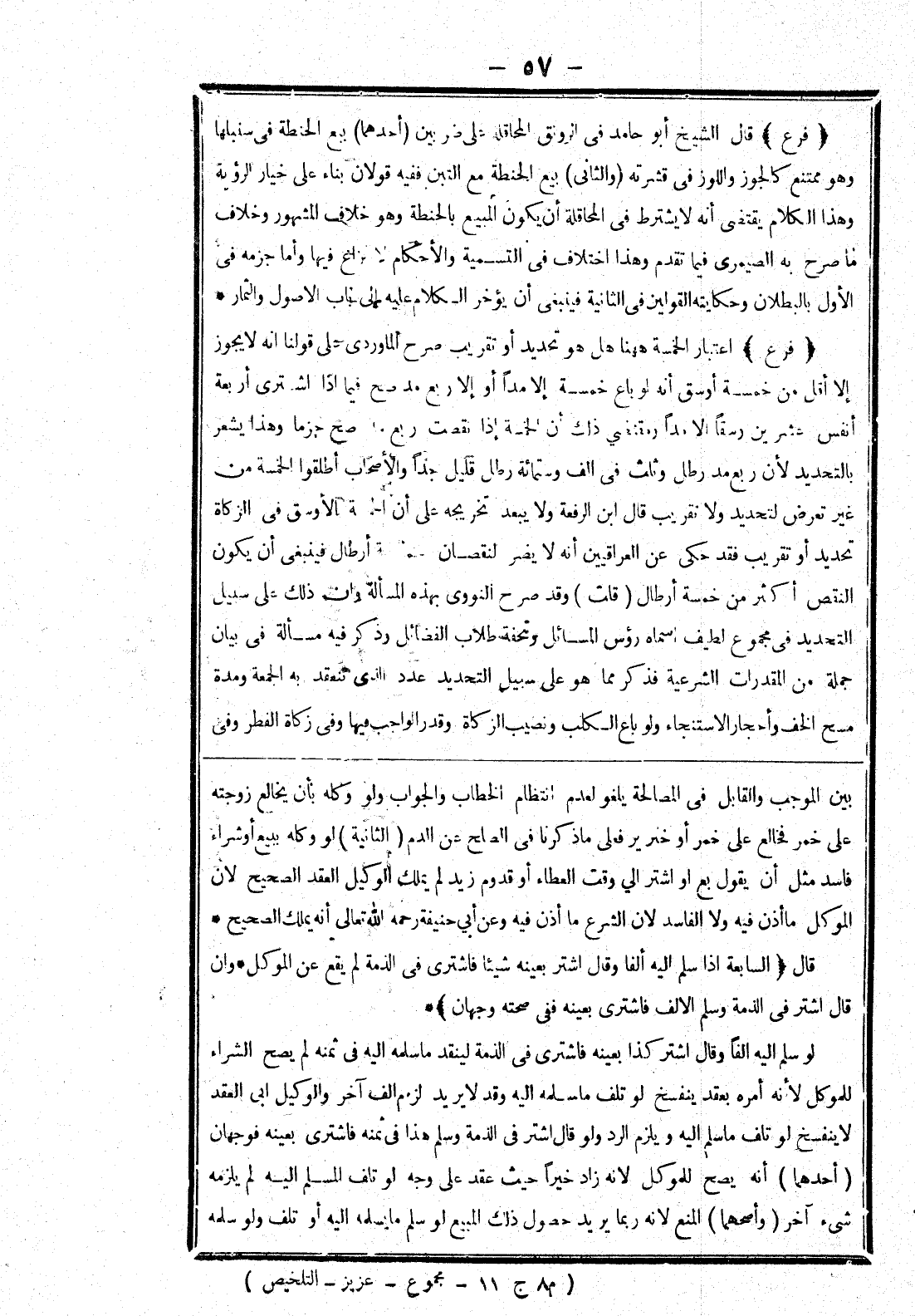 بين الموجب والقابل في المصالحة يلغو لعدم انتظام الخطاب والجواب ولو وكله بأن يخالع زوجته على خمر فخالع على خمر أو خنزير فعلى ما ذكرنا في الصلح عن الدم (الثانية) لو وكله ببيع أو شراء فاسد مثل أن يقول بع أو اشتر إلى وقت العطاء أو قدوم زيد لم يملك الوكيل العقد الصحيح لان الموكل ما أذن فيه ولا الفاسد لان الشرع ما أذن فيه وعن أبى حنيفة رحمه الله تعالى أنه يملك الصحيح.