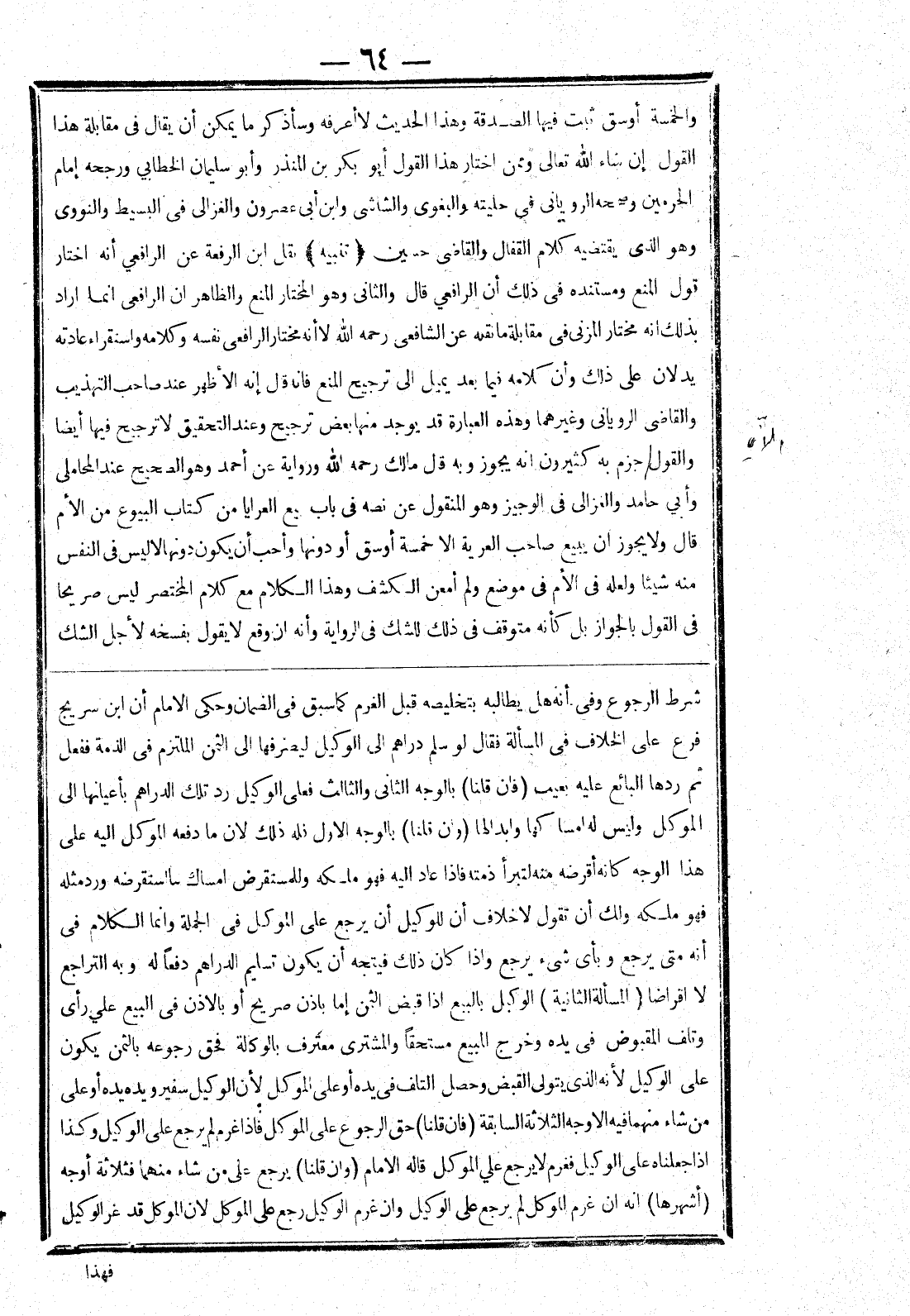 شرط الرجوع وفى انه هل يطالبه بتخليصه قبل الغرم كما سبق في الضمان وحكى الامام ان ابن سريج فرع على الخلاف في المسالة فقال لو سلم دراهم إلى الوكيل ليصرفها إلى الثمن الملتزم في الذمة ففعل ثم ردها البائع عليه بعيب (فان قلنا) بالوجه الثاني والثالث فعلى الوكيل رد تلك الدارهم باعيانها إلى االموكل وليس له امساكها وابدالها (وان قلنا) بالوجه الاول فله ذلك لان ما دفعه الموكل إليه على هذا الوجه كانه اقرضه منه لتبرأ ذمته فإذا عاد إليه فهو ملكه وللمستقرض امساك ما استقرضه ورد مثله فهو ملكه ولك ان تقول للاخلاف ان للوكيل ان يرجع على الموكل في الجملة وانما الكلام في انه متى يرجع وباى شئ يرج وإذا كان ذلك فيتجه ان يكون تسليم الدارهم دفعا له وبه التراجع لا اقرضا (المسالة الثانية) الوكيل بالبيع إذا قبض الثمن اما باذن صريح أو بالاذن في البيع على راى وتلف المقبوض في يده وخرج المبيع مستتحقا والمشترى معترف بالوكالة فحق رجوعه بالثمن يكون على الوكيل لانه الذى يتولى القض وحصل التلف في يده أو على الموكل لان الوكيل سفير ويده ويده يده أو على من شاء منهما فيه الاوجه الثلاثة السابقة (فان قلنا) حق الرجوع على الموكل فإذا غرم لم يرجع على الوكيل وكذا إذا جعلناه على الوكيل فغرم لا يرجع على الموكل قاله الامام (وان قلنا) يرجع على من شاء منهما فثلاثة اوجه (اشهرها) انه ان غرم اللموكل لم يرجع على الوكيل وان غرم الوكيل رجع على الموكل لان الموكل قد غر الوكيل