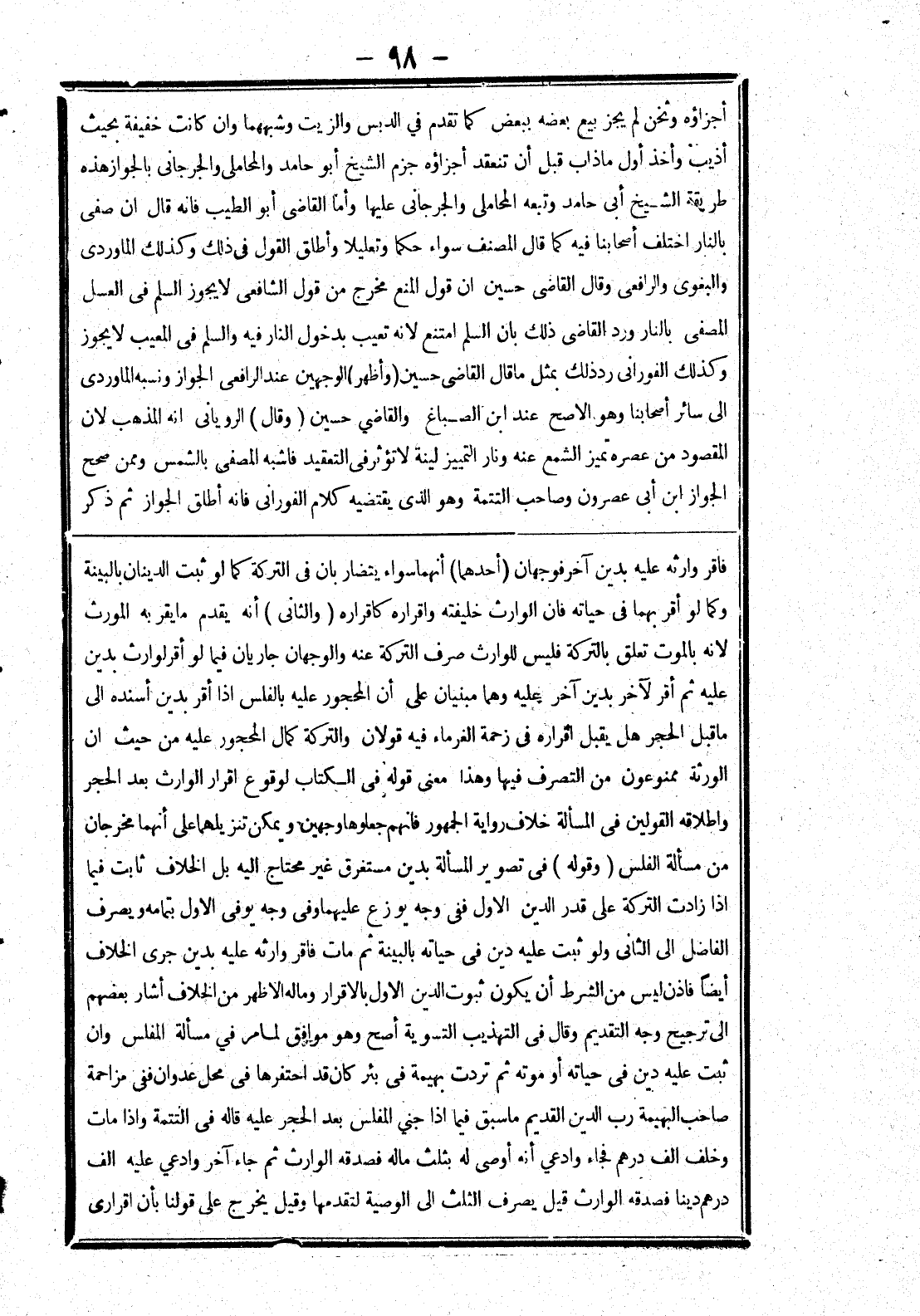 فاقر وارثه عليه بدين آخر فوجهان (أحدهما) أنهما سواء يتضاربان بان في التركة كما لو ثبت الدينان بالبينة وكما لو أقر بهما في حياته فان الوارث خليفته واقراره كاقراره (والثانى) أنه يقدم مايقر به المورث لانه بالموت تعلق بالتركة فليس للوارث صرف التركة عنه والوجهان جاريان فيما لو أقر لوارث بدين عليه ثم أقر لآخر بدين آخر عليه وهما مبنيان على أن المحجور عليه بالفلس إذا أقر بدين أسنده إلى ما قبل الحجر هل يقبل اقراره في زحمة الغرماء فيه قولان والتركة كمال المحجوز عليه من حيث ان الورثة ممنوعون من التصرف فيها وهذا معنى قوله في الكتاب لوقوع اقرار الوارث بعد الحجر واطلاقه القولين في المسألة خلاف رواية الجمهور فانهم جعلوها وجهين ويمكن تنزيلهما على أنهما مخرجان من مسألة الفلس (وقوله) في تصوير المسألة بدين مستغرق غير محتاج إليه بل الخلاف ثابت فيما إذا زادت التركة على قدر الدين الاول ففى وجه يوزع عليهما وفى وجه يوفى الاول بتمامه ويصرف الفاضل إلى الثاني ولو ثبت عليه دين في حياته بالبينة ثم مات فاقر وارثه عليه بدين جرى الخلاف أيضا فاذن ليس من الشرط أن يكون بوت الدين الاول بالاقرار وماله الاظهر من الخلاف أشار بعضهم إلى ترجيح وجه التقديم وقال في التهذيب التسوية أصح وهو موافق لما مر في مسألة المفلس وان ثبت عليه دين في حياته أو موته ثم تردت بهيمة في بئر كان قد احتفرها في محل عدوان ففى مزاحمة صاحب البهيمة رب الدين القديم ما سبق فيما إذا جني المفلس بعد الحجر عليه قاله في التتمة وإذا مات وخلف الف درهم فجاء وادعي أنه أوصى له بثلث ماله فصدقه الوارث ثم جاء آخر وادعي عليه الف درهم دينا فصدقه الوارث قيل يصرف الثلث إلى الوصية لتقدمها وقيل يخرج على قولنا بأن اقرارى