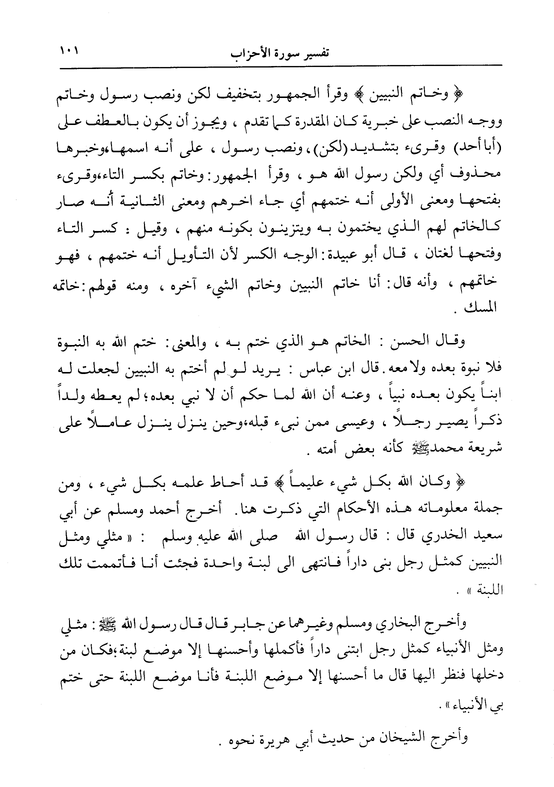 وقال الحسن: الخاتم هو الذي ختم به، والمعنى: ختم الله به النبوة فلا نبوة بعده ولا معه. قال ابن عباس: يريد لو لم أختم به النبيين لجعلت له ابناً يكون بعده نبياً، وعنه أن الله لما حكم أن لا نبي بعده؛ لم يعطه ولداً ذكراً يصير رجلاً، وعيسى ممن نبىء قبله: وحين ينزل ينزل عاملاً على شريعة محمد - صلى الله عليه وسلم - كأنه بعض أمته.