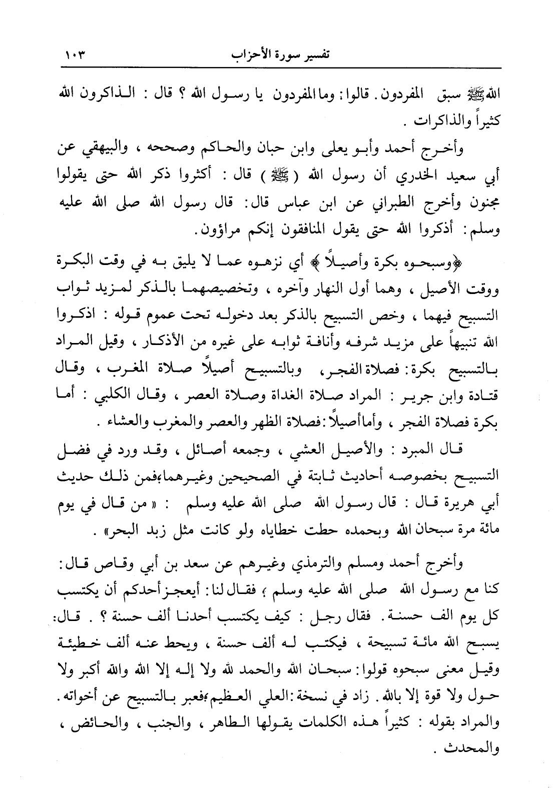 وأخرج أحمد ومسلم والترمذي وغيرهم عن سعد بن أبي وقاص قال: كنا مع رسول الله صلى الله عليه وسلم؛ فقال لنا: أيعجز أحدكم أن يكتسب كل يوم ألف حسنة. فقال رجل: كيف يكتسب أحدنا ألف حسنة؟. قال: يسبح الله مائة تسبيحة، فيكتب له ألف حسنة، ويحط عنه ألف خطيئة وقيل معنى سبحوه قولوا: سبحان الله والحمد لله ولا إله إلا الله والله أكبر ولا حول ولا قوة إلا بالله. زاد في نسخة: العلي العظيم؛ فعبر بالتسبيح عن أخواته. والمراد بقوله: كثيراً هذه الكلمات يقولها الطاهر، والجنب، والحائض، والمحدث.