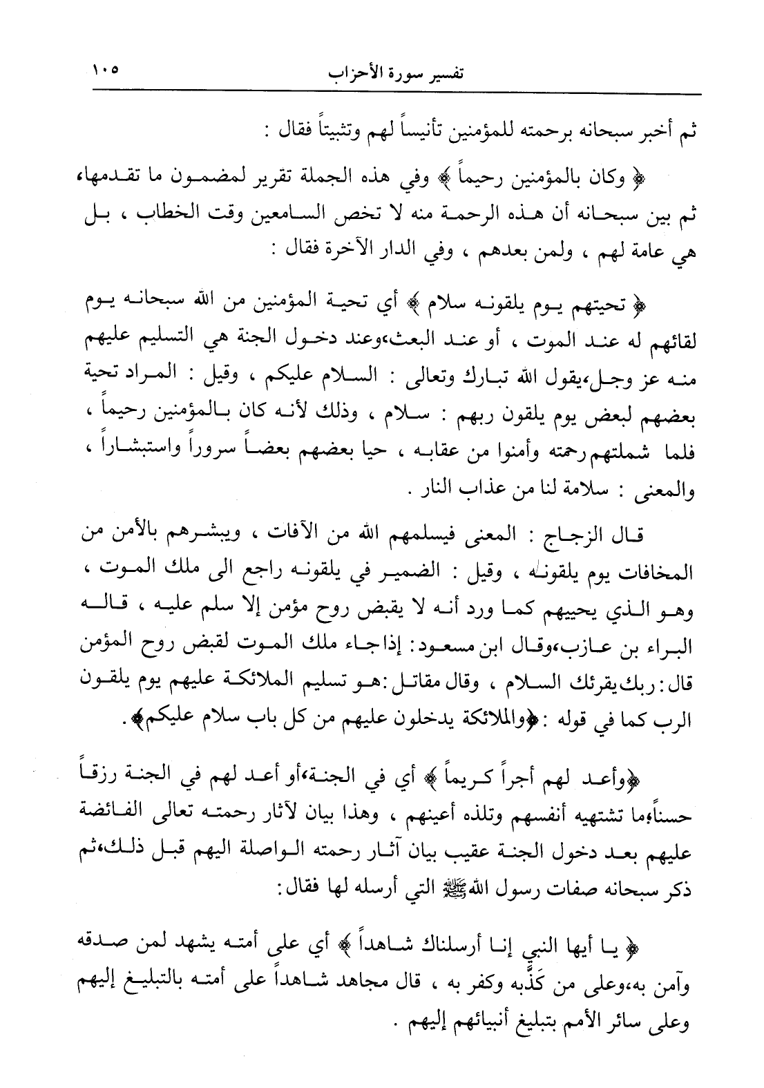 (تحيتهم يوم يلقونه سلام) أي تحية المؤمنين من الله سبحانه يوم لقائهم له عند الموت، أو عند البعث، وعند دخول الجنة هي التسليم عليهم منه عز وجل، يقول الله تبارك وتعالى: السلام عليكم، وقيل: المراد تحية بعضهم لبعض يوم يلقون ربهم: سلام، وذلك لأنه كان بالمؤمنين رحيماً، فلما شملتهم رحمته وأمنوا من عقابه، حيا بعضهم بعضاً سروراً واستبشاراً، والمعنى: سلامة لنا من عذاب النار.