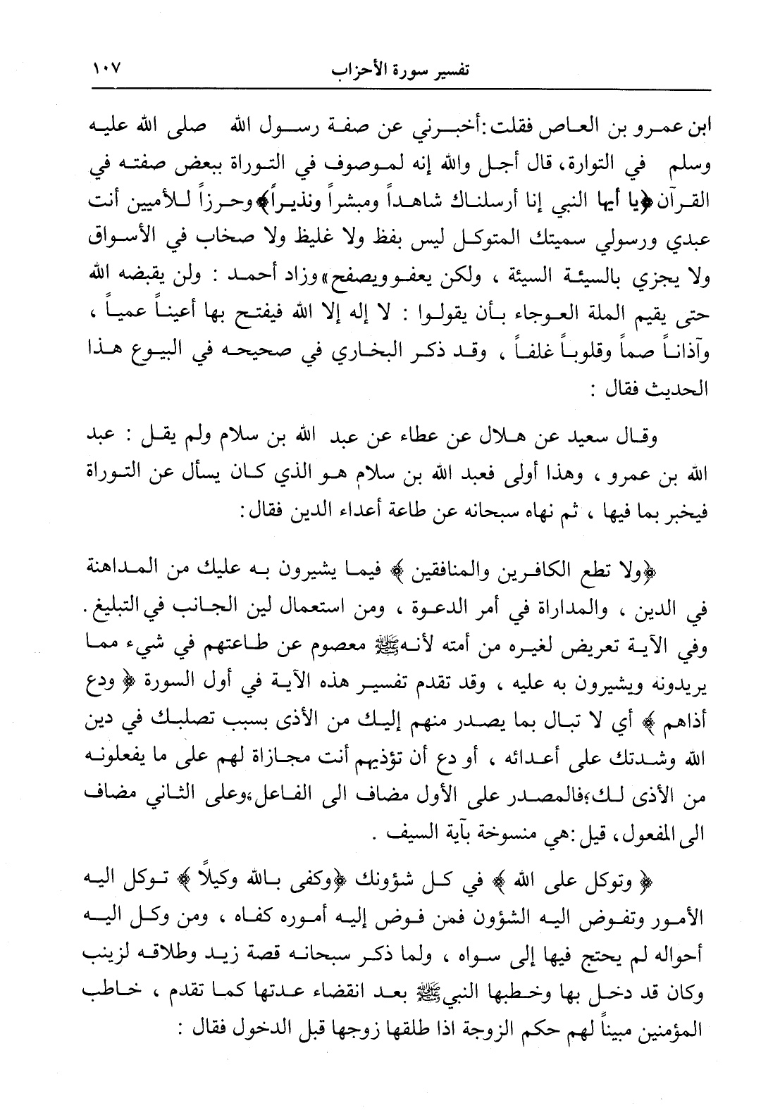 ابن عمرو بن العاص فقلت: أخبرني عن صفة رسول الله صلى الله عليه وسلم في التوارة، قال أجل والله إنه لموصوف في التوراة ببعض صفته في القرآن (يا أيها النبي إنا أرسلناك شاهداً ومبشراً ونذيراً) وحرزاً للأميين أنت عبدي ورسولي سميتك المتوكل ليس بفظ ولا غليظ ولا صخاب في الأسواق ولا يجزي بالسيئة السيئة، ولكن يعفو ويصفح " وزاد أحمد: ولن يقبضه الله حتى يقيم الملة العوجاء بأن يقولوا: لا إله إلا الله فيفتح بها أعيناً عمياً، وآذاناً صماً وقلوباً غلفاً، وقد ذكر البخاري في صحيحه في البيوع هذا الحديث فقال: