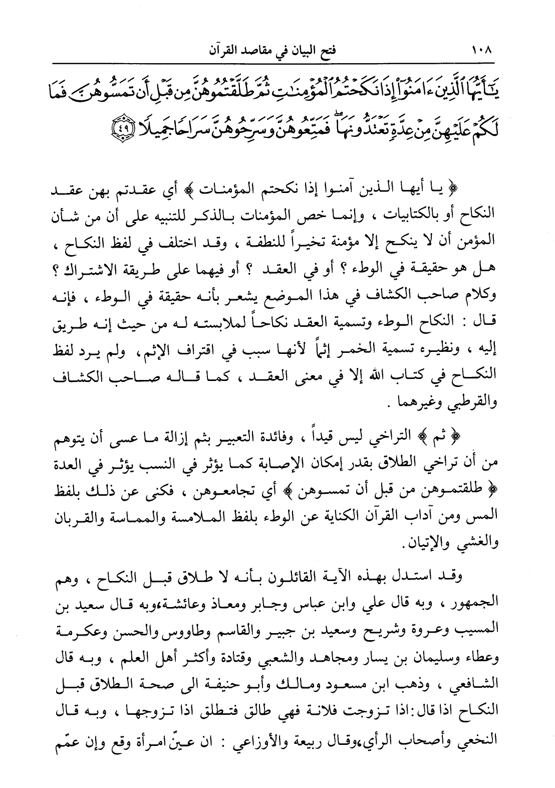 يَا أَيُّهَا الَّذِينَ آمَنُوا إِذَا نَكَحْتُمُ الْمُؤْمِنَاتِ ثُمَّ طَلَّقْتُمُوهُنَّ مِنْ قَبْلِ أَنْ تَمَسُّوهُنَّ فَمَا لَكُمْ عَلَيْهِنَّ مِنْ عِدَّةٍ تَعْتَدُّونَهَا فَمَتِّعُوهُنَّ وَسَرِّحُوهُنَّ سَرَاحًا جَمِيلًا (49)