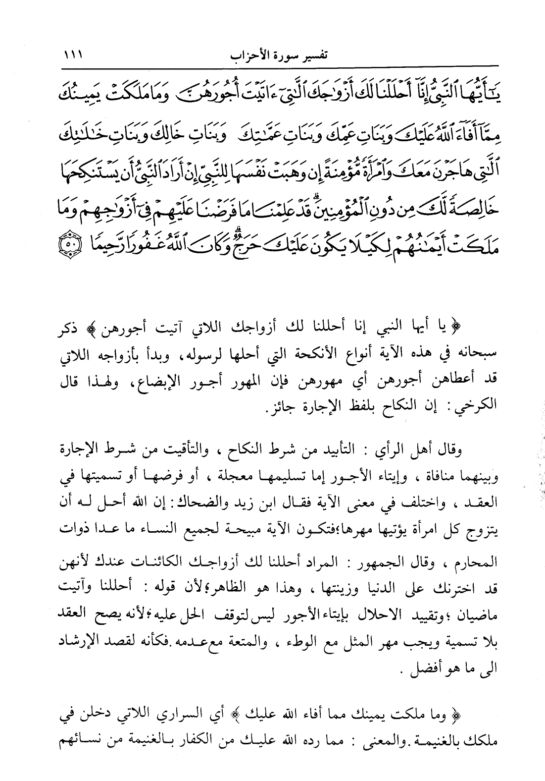 يَا أَيُّهَا النَّبِيُّ إِنَّا أَحْلَلْنَا لَكَ أَزْوَاجَكَ اللَّاتِي آتَيْتَ أُجُورَهُنَّ وَمَا مَلَكَتْ يَمِينُكَ مِمَّا أَفَاءَ اللَّهُ عَلَيْكَ وَبَنَاتِ عَمِّكَ وَبَنَاتِ عَمَّاتِكَ وَبَنَاتِ خَالِكَ وَبَنَاتِ خَالَاتِكَ اللَّاتِي هَاجَرْنَ مَعَكَ وَامْرَأَةً مُؤْمِنَةً إِنْ وَهَبَتْ نَفْسَهَا لِلنَّبِيِّ إِنْ أَرَادَ النَّبِيُّ أَنْ يَسْتَنْكِحَهَا خَالِصَةً لَكَ مِنْ دُونِ الْمُؤْمِنِينَ قَدْ عَلِمْنَا مَا فَرَضْنَا عَلَيْهِمْ فِي أَزْوَاجِهِمْ وَمَا مَلَكَتْ أَيْمَانُهُمْ لِكَيْلَا يَكُونَ عَلَيْكَ حَرَجٌ وَكَانَ اللَّهُ غَفُورًا رَحِيمًا (50)