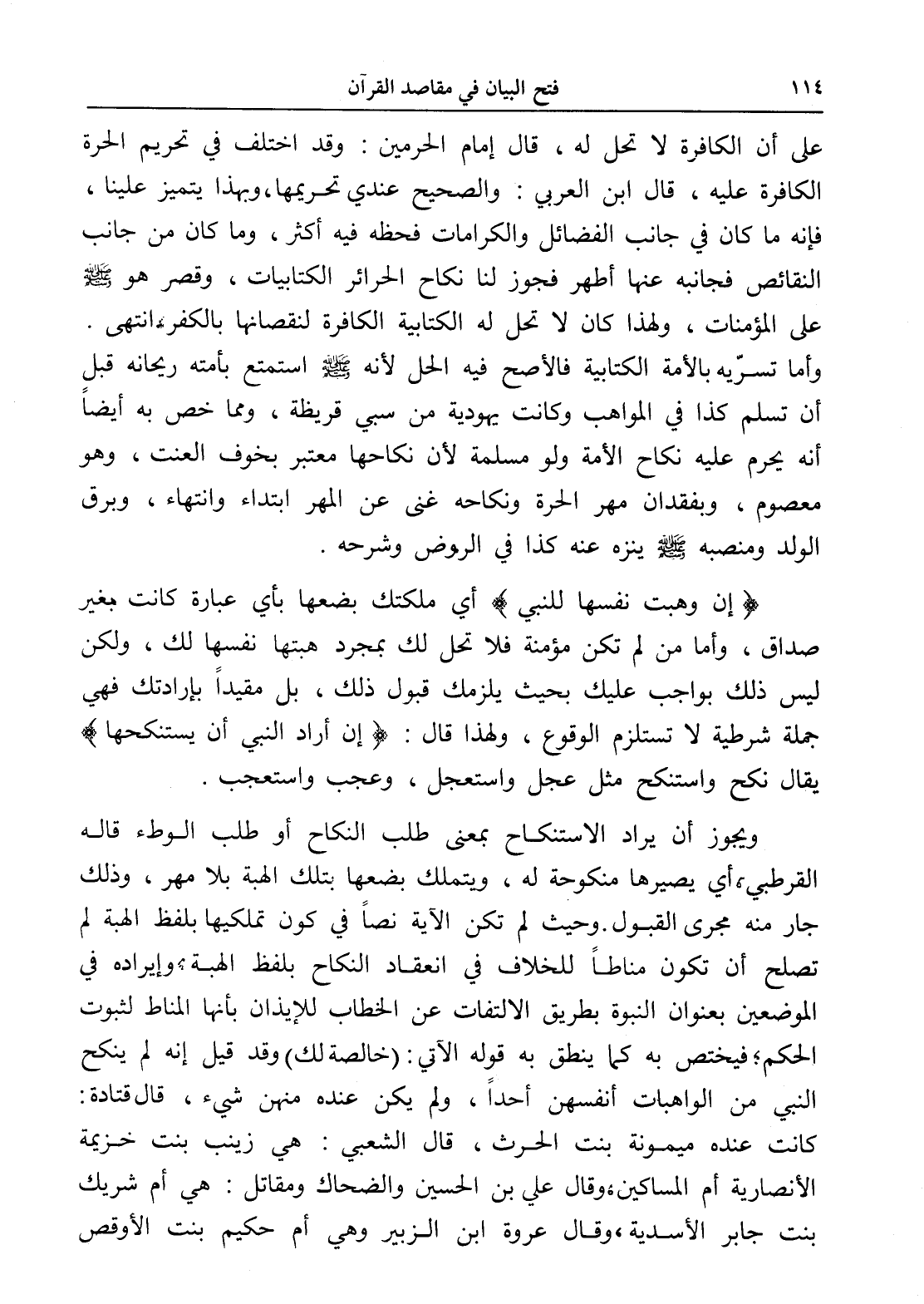 على أن الكافرة لا تحل له، قال إمام الحرمين: وقد اختلف في تحريم الحرة الكافرة عليه، قال ابن العربي: والصحيح عندي تحريمها، وبهذا يتميز علينا، فإنه ما كان في جانب الفضائل والكرامات فحظه فيه أكثر، وما كان من جانب النقائص فجانبه عنها أطهر فجوز لنا نكاح الحرائر الكتابيات، وقصر هو - صلى الله عليه وسلم - على المؤمنات، ولهذا كان لا تحل له الكتابية الكافرة لنقصانها بالكفر، انتهى.