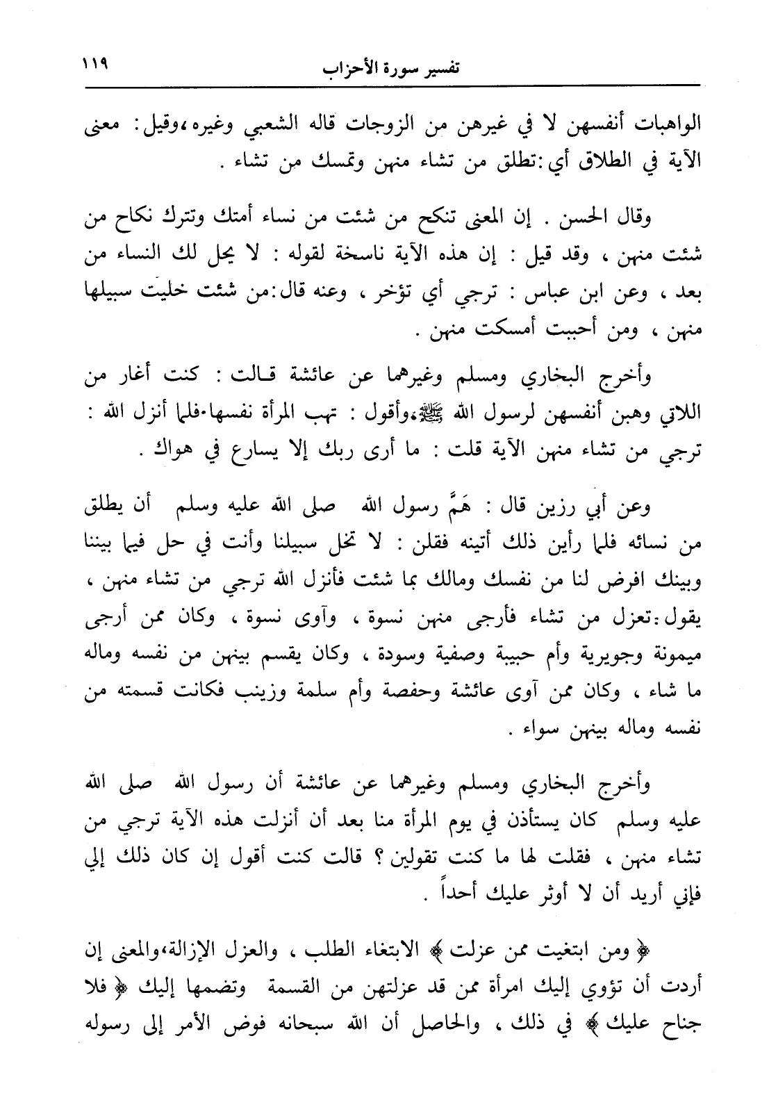 وأخرج البخاري ومسلم وغيرهما عن عائشة أن رسول الله صلى الله عليه وسلم كان يستأذن في يوم المرأة منا بعد أن أنزلت هذه الآية ترجي من تشاء منهن، فقلت لها ما كنت تقولين؟ قالت كنت أقول إن كان ذلك إلي فإني أريد أن لا أوثر عليك أحداً.