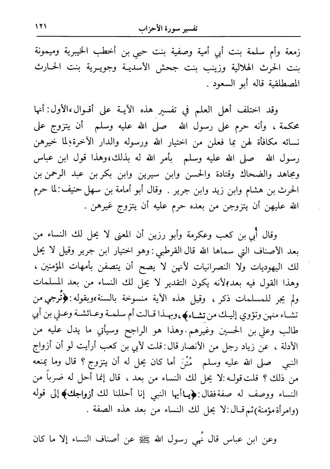 وقال أُبي بن كعب وعكرمة وأبو رزين أن المعنى لا يحل لك النساء من بعد الأصناف التي سماها الله قال القرطبي: وهو اختيار ابن جرير وقيل لا يحل لك اليهوديات ولا النصرانيات لأنهن لا يصح أن يتصفن بأمهات المؤمنين، وهذا القول فيه بعد؛ لأنه يكون التقدير لا يحل لك النساء من بعد المسلمات ولم يجر للمسلمات ذكر، وقيل هذه الآية منسوخة بالسنة، وبقوله: (تُرجي من تشاء منهن وتؤوي إليك من تشاء)، وبهذا قالت أم سلمة وعائشة وعلي بن أبي طالب وعلي بن الحسين وغيرهم. وهذا هو الراجح وسيأتي ما يدل عليه من الأدلة، عن زياد رجل من الأنصار قال: قلت لأبي بن كعب أرأيت لو أن أزواج النبي صلى الله عليه وسلم مُتْنَ أما كان يحل له أن يتزوج؟ قال وما يمنعه من ذلك؟ قلت قوله: لا يحل لك النساء من بعد، قال إنما أحل له ضرباً من النساء ووصف له صفة فقال: (يا أيها النبي إنا أحللنا لك أزواجك) إلى قوله (وامرأة مؤمنة) ثم قال: لا يحل لك النساء من بعد هذه الصفة.