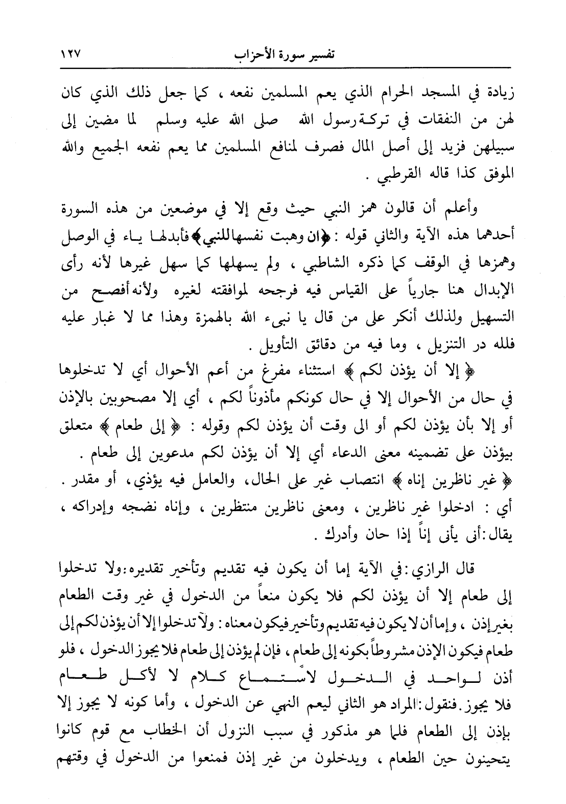 وأعلم أن قالون همز النبي حيث وقع إلا في موضعين من هذه السورة أحدهما هذه الآية والثاني قوله: (إن وهبت نفسها للنبي) فأبدلها ياء في الوصل وهمزها في الوقف كما ذكره الشاطبي، ولم يسهلها كما سهل غيرها لأنه رأى الإبدال هنا جارياً على القياس فيه فرجحه لموافقته لغيره ولأنه أفصح من التسهيل ولذلك أنكر على من قال يا نبىء الله بالهمزة وهذا مما لا غبار عليه فلله در التنزيل، وما فيه من دقائق التأويل.