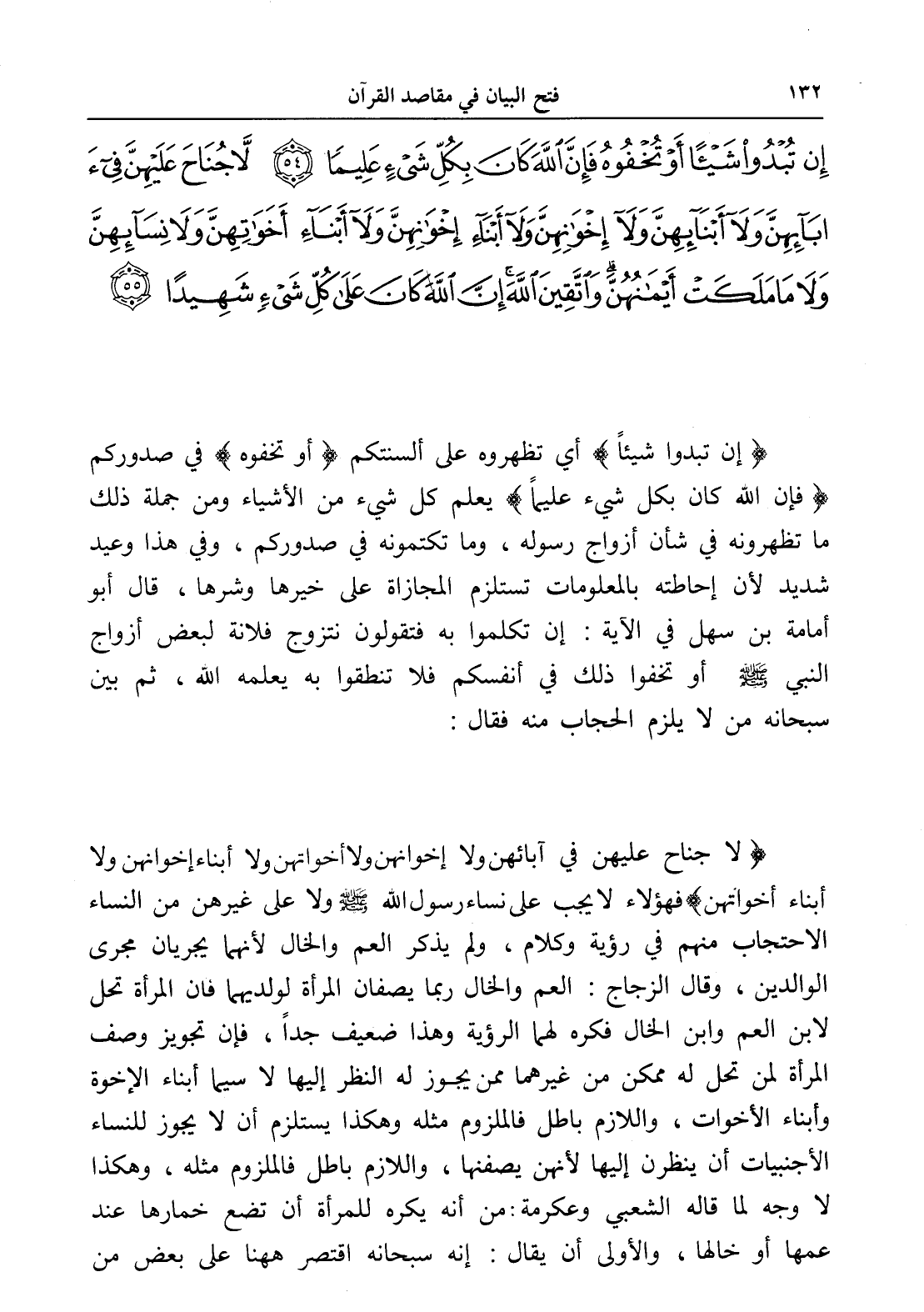 إِنْ تُبْدُوا شَيْئًا أَوْ تُخْفُوهُ فَإِنَّ اللَّهَ كَانَ بِكُلِّ شَيْءٍ عَلِيمًا (54) لَا جُنَاحَ عَلَيْهِنَّ فِي آبَائِهِنَّ وَلَا أَبْنَائِهِنَّ وَلَا إِخْوَانِهِنَّ وَلَا أَبْنَاءِ إِخْوَانِهِنَّ وَلَا أَبْنَاءِ أَخَوَاتِهِنَّ وَلَا نِسَائِهِنَّ وَلَا مَا مَلَكَتْ أَيْمَانُهُنَّ وَاتَّقِينَ اللَّهَ إِنَّ اللَّهَ كَانَ عَلَى كُلِّ شَيْءٍ شَهِيدًا (55)