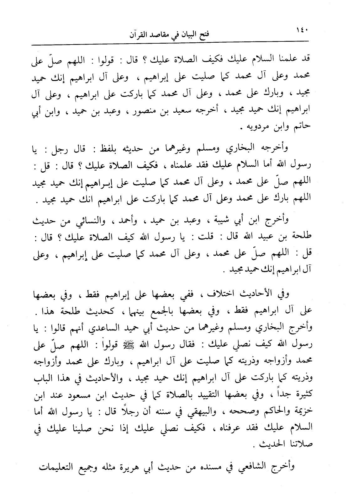 قد علمنا السلام عليك فكيف الصلاة عليك؟ قال: قولوا: اللهم صلّ على محمد وعلى آل محمد كما صليت على إبراهيم، وعلى آل إبراهيم إنك حميد مجيد، وبارك على محمد، وعلى آل محمد كما باركت على إبراهيم، وعلى آل إبراهيم إنك حميد مجيد، أخرجه سعيد بن منصور، وعبد بن حميد، وابن أبي حاتم وابن مردويه.